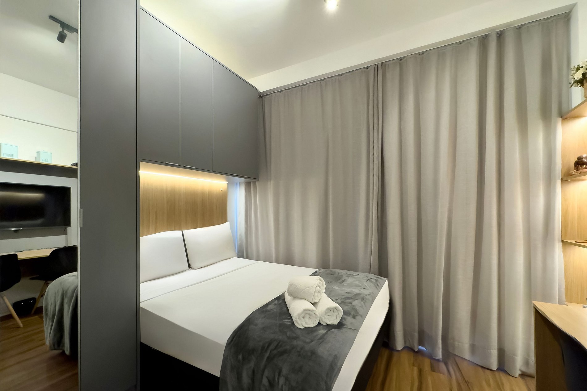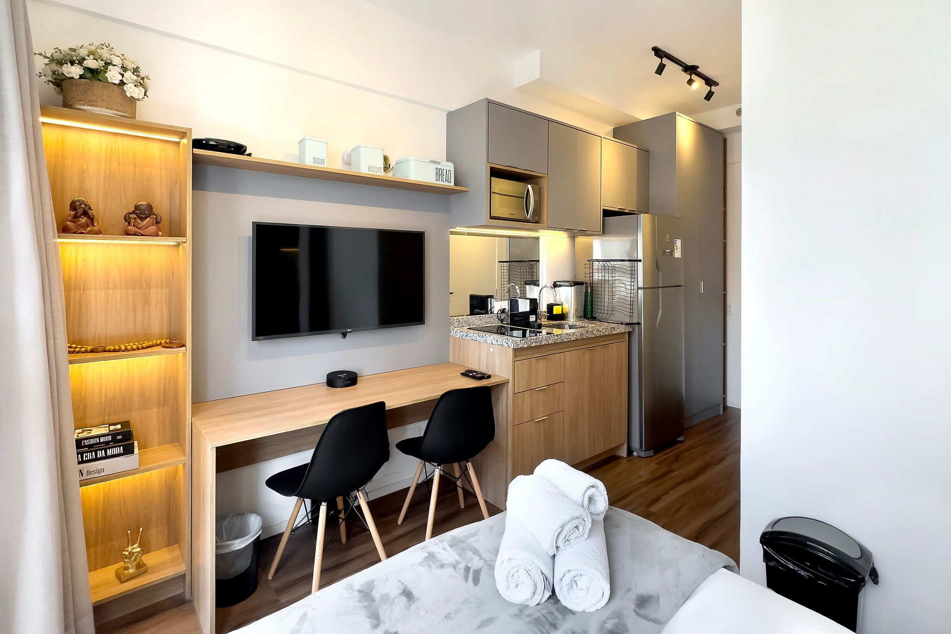O apartamento dispõe de uma cama casal (1,38m x 1,88m) e uma cozinha completa, equipada com geladeira, freezer, micro-ondas, fogão de indução, taças de vinho, cafeteira Dolce Gusto, filtro de água, forno. Além disso, conta com mesa e duas cadeiras internas, guarda-roupa, TV e um banheiro com excelente chuveiro (água quente e fria) alem de ferro de passar roupa e secador de cabelo. Será fornecido um jogo de enxoval por hóspede, incluindo lençóis, travesseiros, fronhas e toalhas de banho e rosto. Não há trocas durante a estadia, porém, é possível disponibilizar um kit de enxoval extra mediante o pagamento de uma taxa adicional. Outras Observações O apartamento está localizado na Rua Coronel Lisboa, 805, em uma região com diversas opções para tornar sua estadia ainda mais agradável: