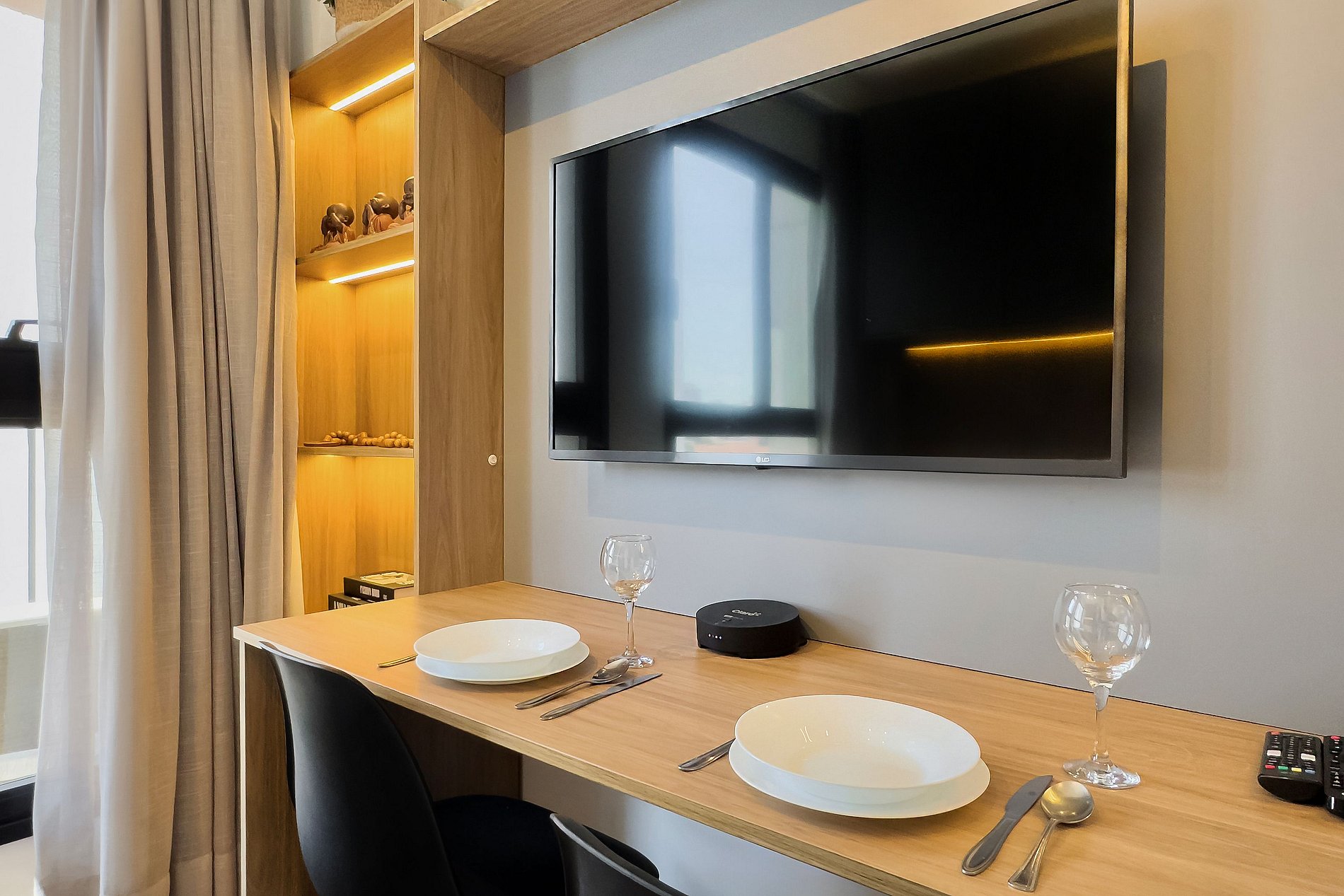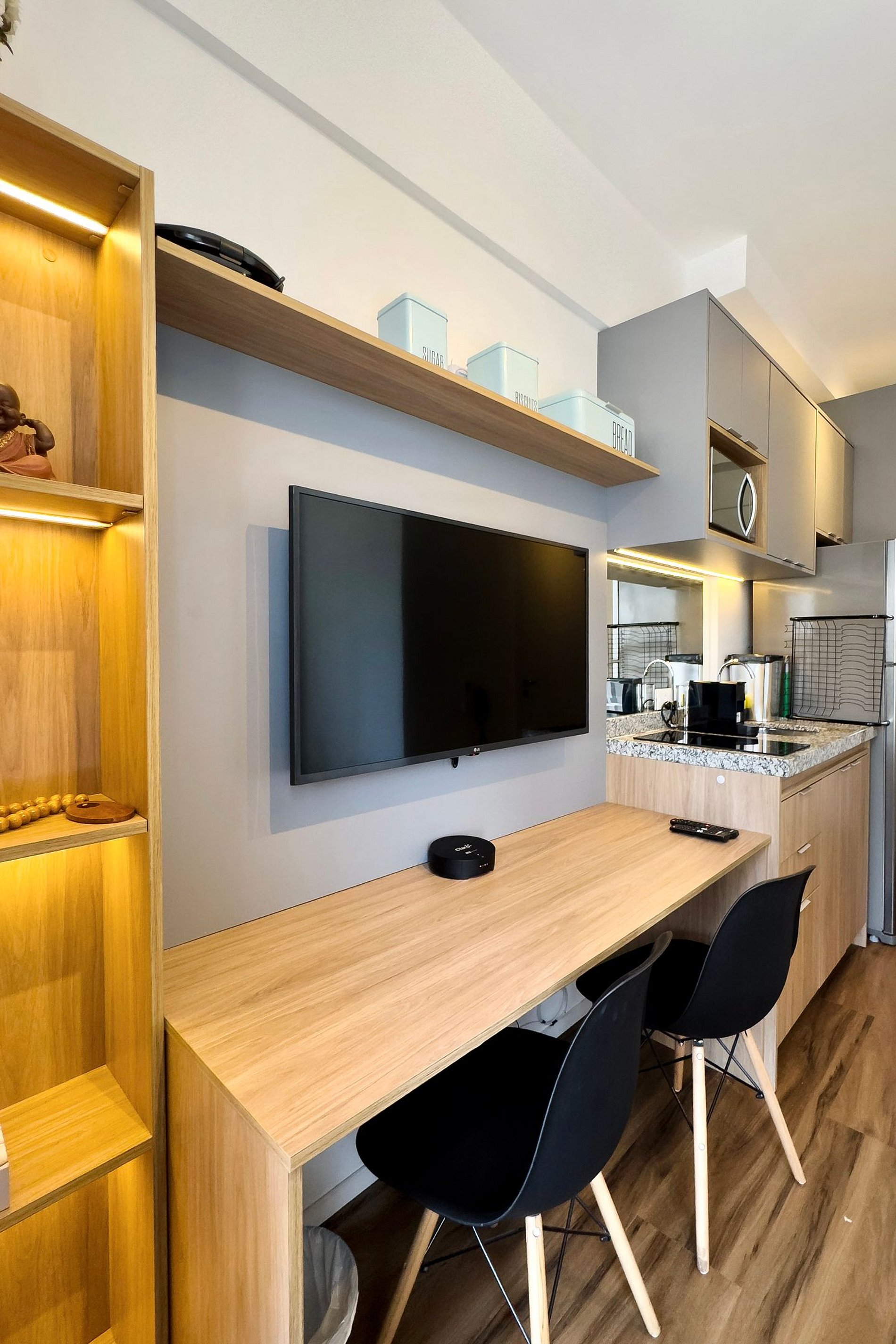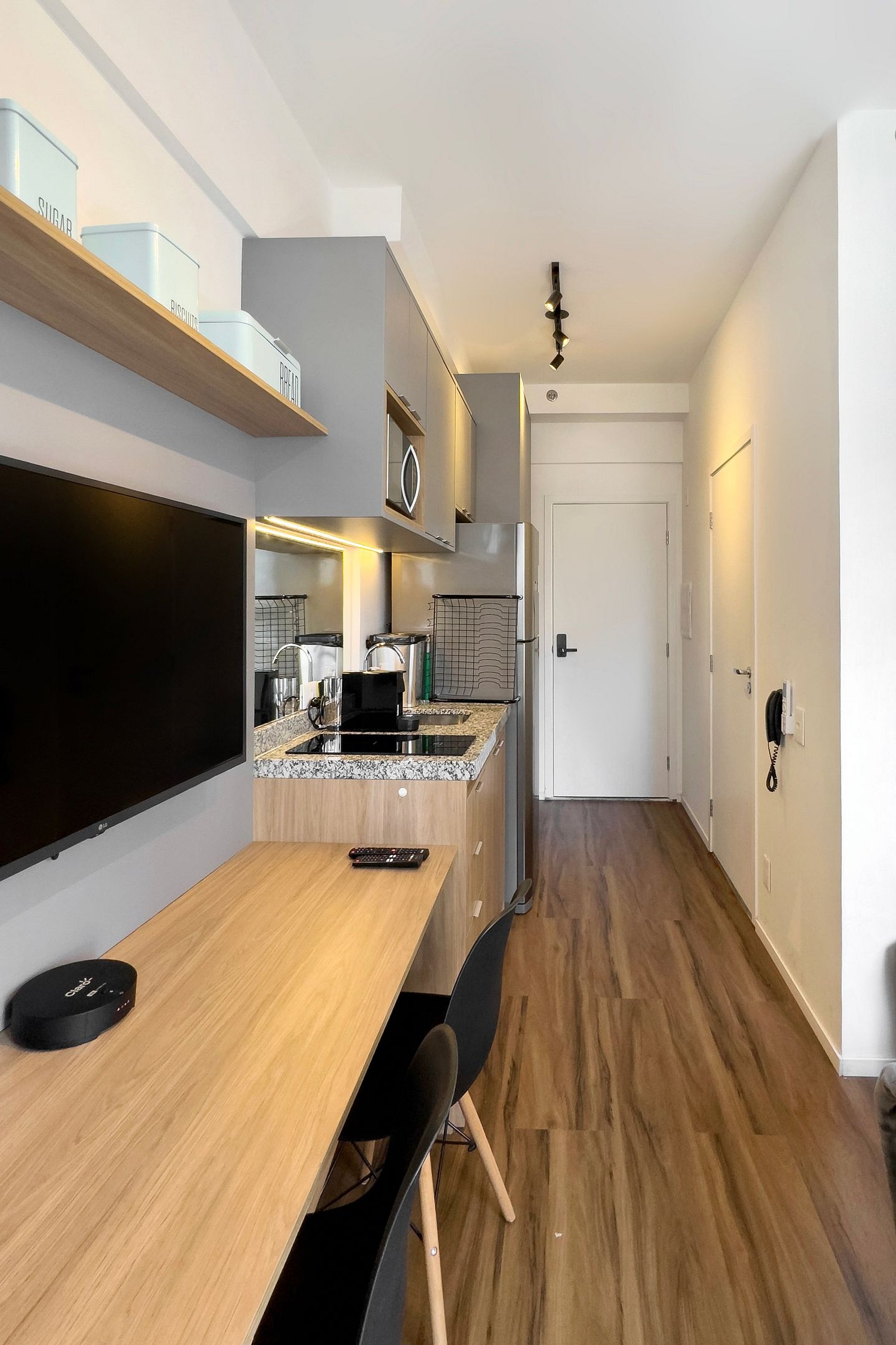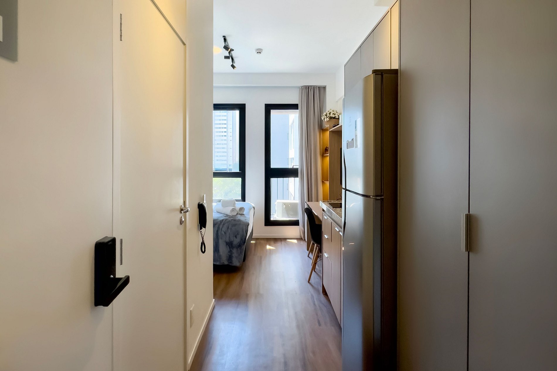 O apartamento dispõe de uma cama casal (1,38m x 1,88m) e uma cozinha completa, equipada com geladeira, freezer, micro-ondas, fogão de indução, taças de vinho, cafeteira Dolce Gusto, filtro de água, forno. Além disso, conta com mesa e duas cadeiras internas, guarda-roupa, TV e um banheiro com excelente chuveiro (água quente e fria) alem de ferro de passar roupa e secador de cabelo. Será fornecido um jogo de enxoval por hóspede, incluindo lençóis, travesseiros, fronhas e toalhas de banho e rosto. Não há trocas durante a estadia, porém, é possível disponibilizar um kit de enxoval extra mediante o pagamento de uma taxa adicional. Outras Observações O apartamento está localizado na Rua Coronel Lisboa, 805, em uma região com diversas opções para tornar sua estadia ainda mais agradável: