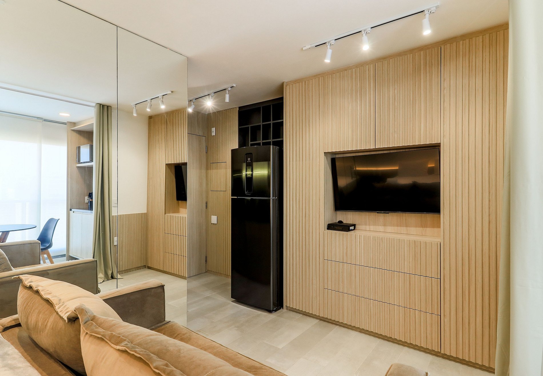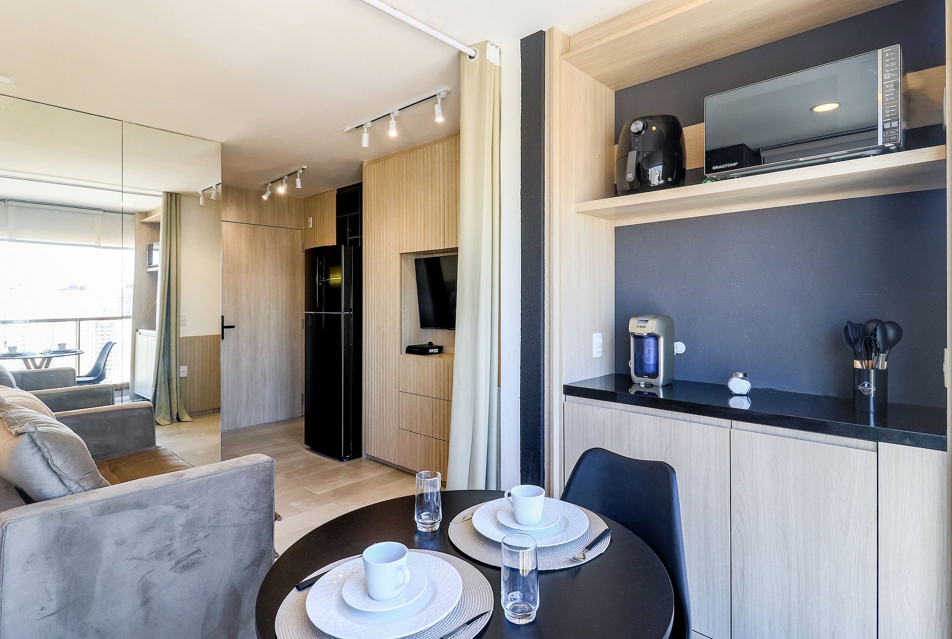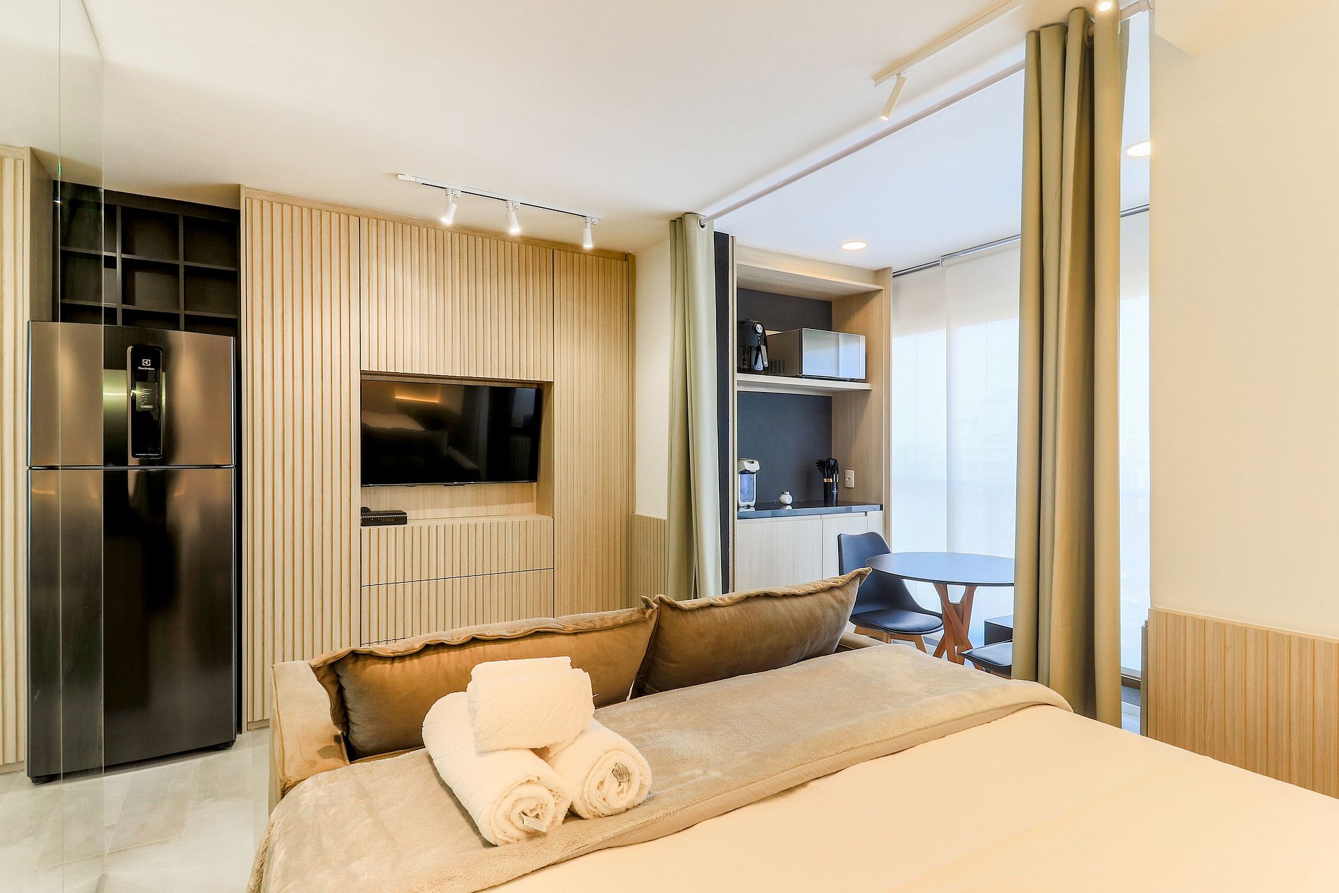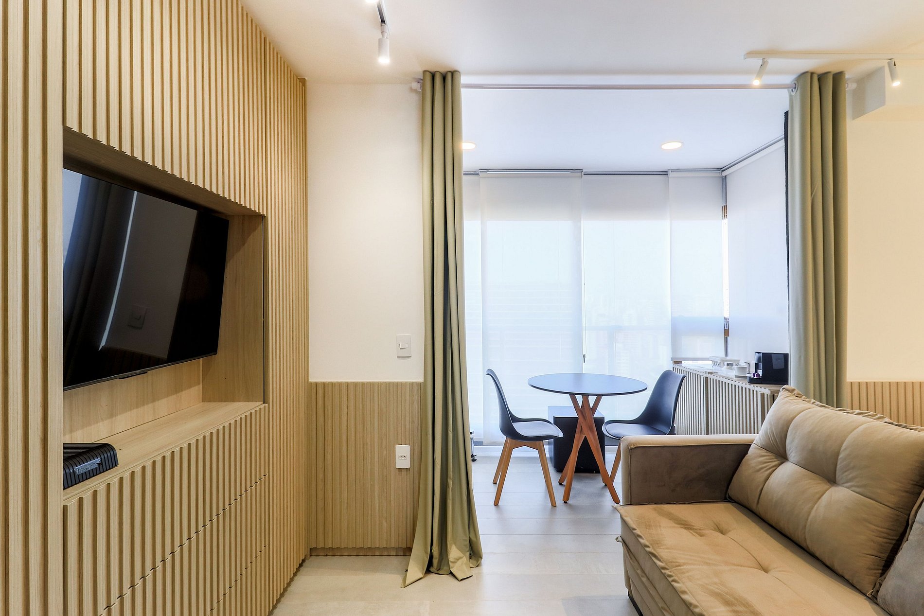 O apartamento possui 1 cama de casal Queen (1,58x1,98), sofá cama e ar-condicionado. Cozinha completa com geladeira, freezer, micro-ondas, fogão de indução, jogo de talheres, air fryer, cafeteira elétrica para home office, guarda-roupa, mesa, 2 Cadeira Interna, TV e banheiro com ótimo chuveiro (água quente e fria). Será fornecido um jogo de enxoval (lençóis, travesseiros, fronhas e toalhas de banho) por hóspede. Outras observações Ao redor do endereço Rua Afonso Braz 805 você encontrará uma variedade de opções para tornar sua estadia cada vez mais agradável;