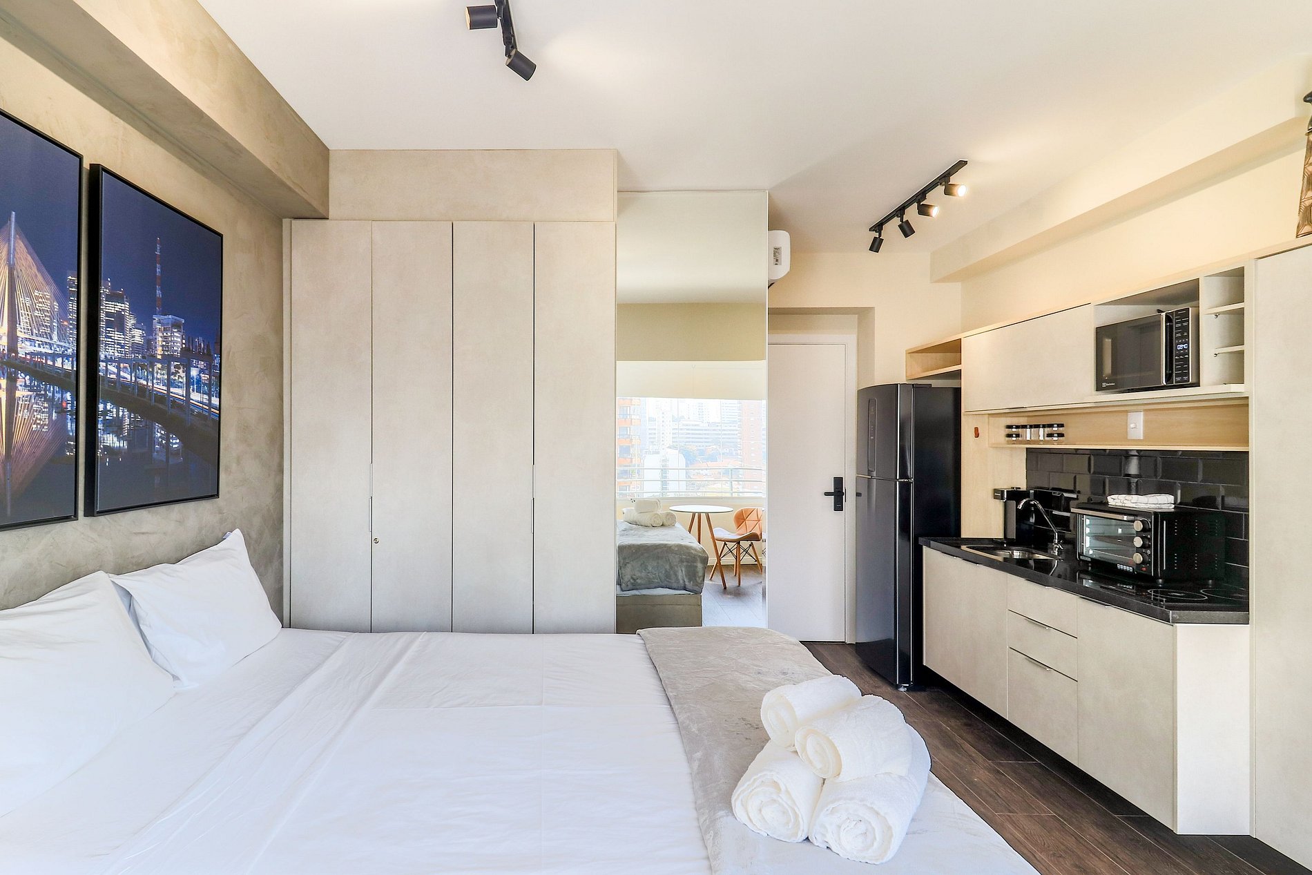 O apartamento possui 1 cama de casal Queen (1,58x1,98), e ar-condicionado. Cozinha completa com geladeira, freezer, micro-ondas, fogão de indução, jogo de talheres, cafeteira nespresso para home office, forninho, Misteira , filtro de agua potável, Liquidificador guarda-roupa, mesa, 2 Cadeira Interna, Cortina Black out TV com 2 banquetas , banheiro com ótimo chuveiro (água quente e fria). Será fornecido um jogo de enxoval (lençóis, travesseiros, fronhas e toalhas de banho) por hóspede. Outras observações Ao redor do endereço Rua Bartira 1003 você encontrará uma variedade de opções para tornar sua estadia cada vez mais agradável;
