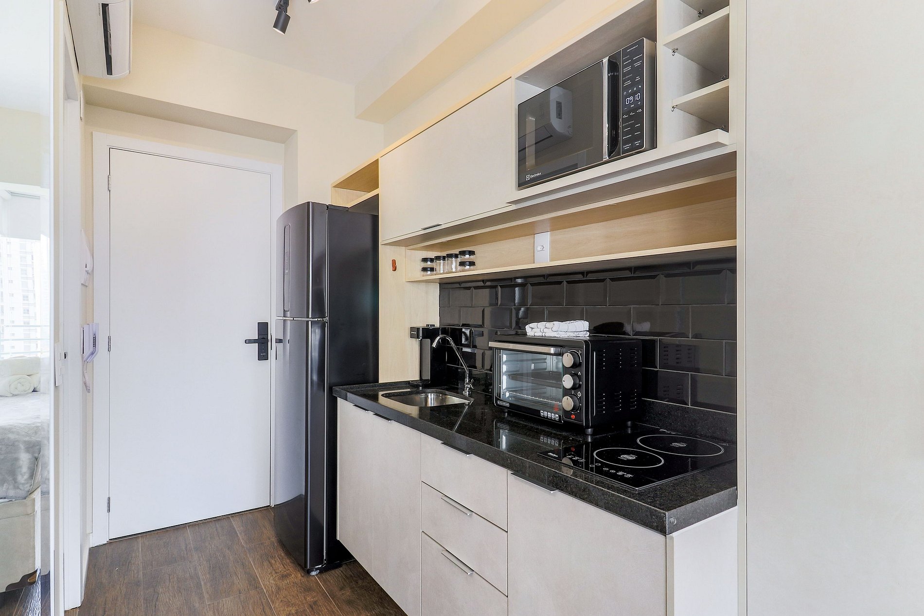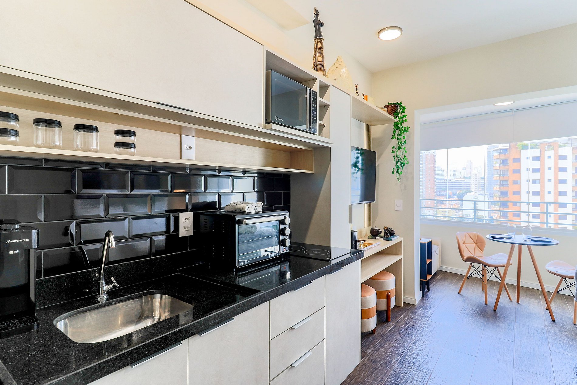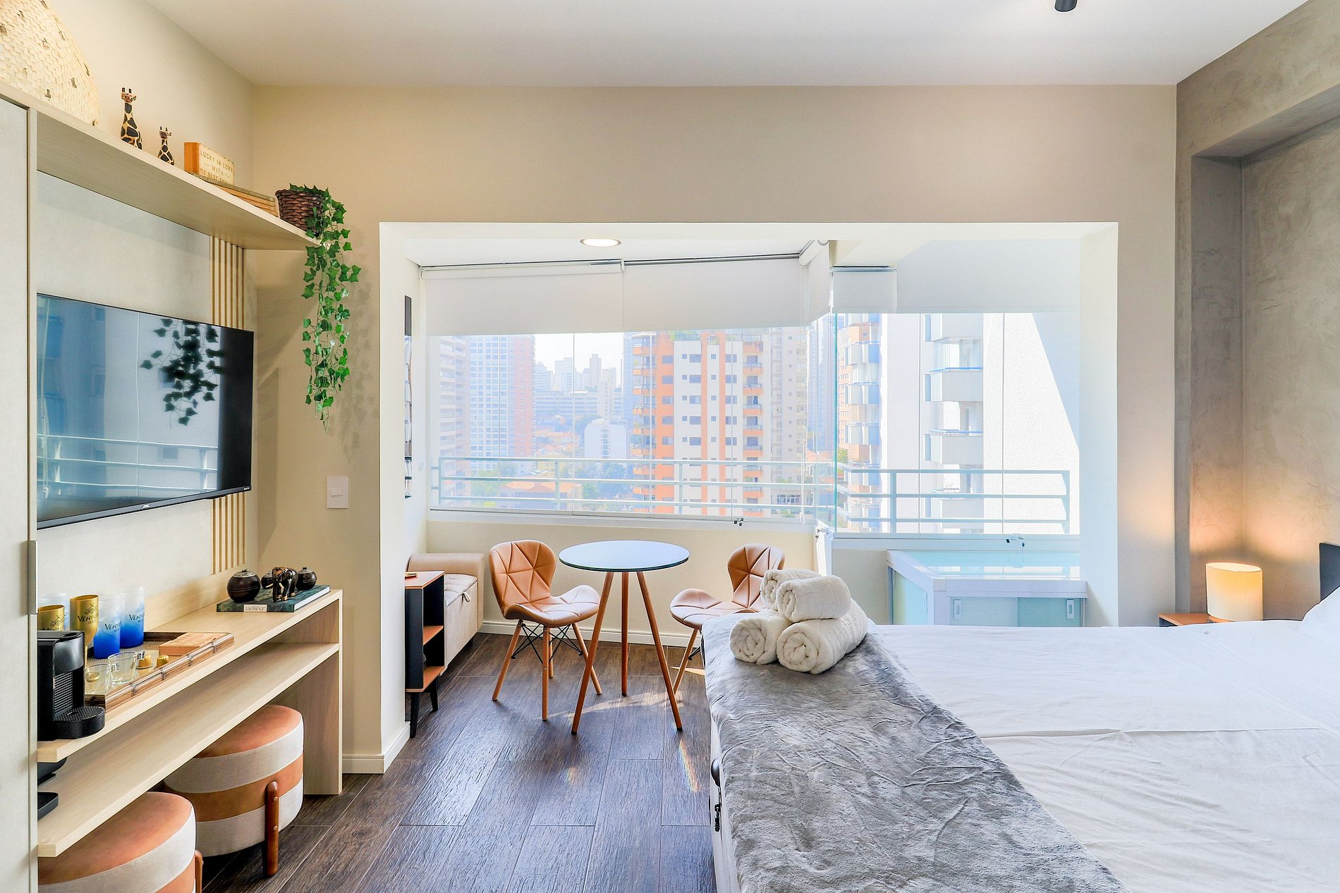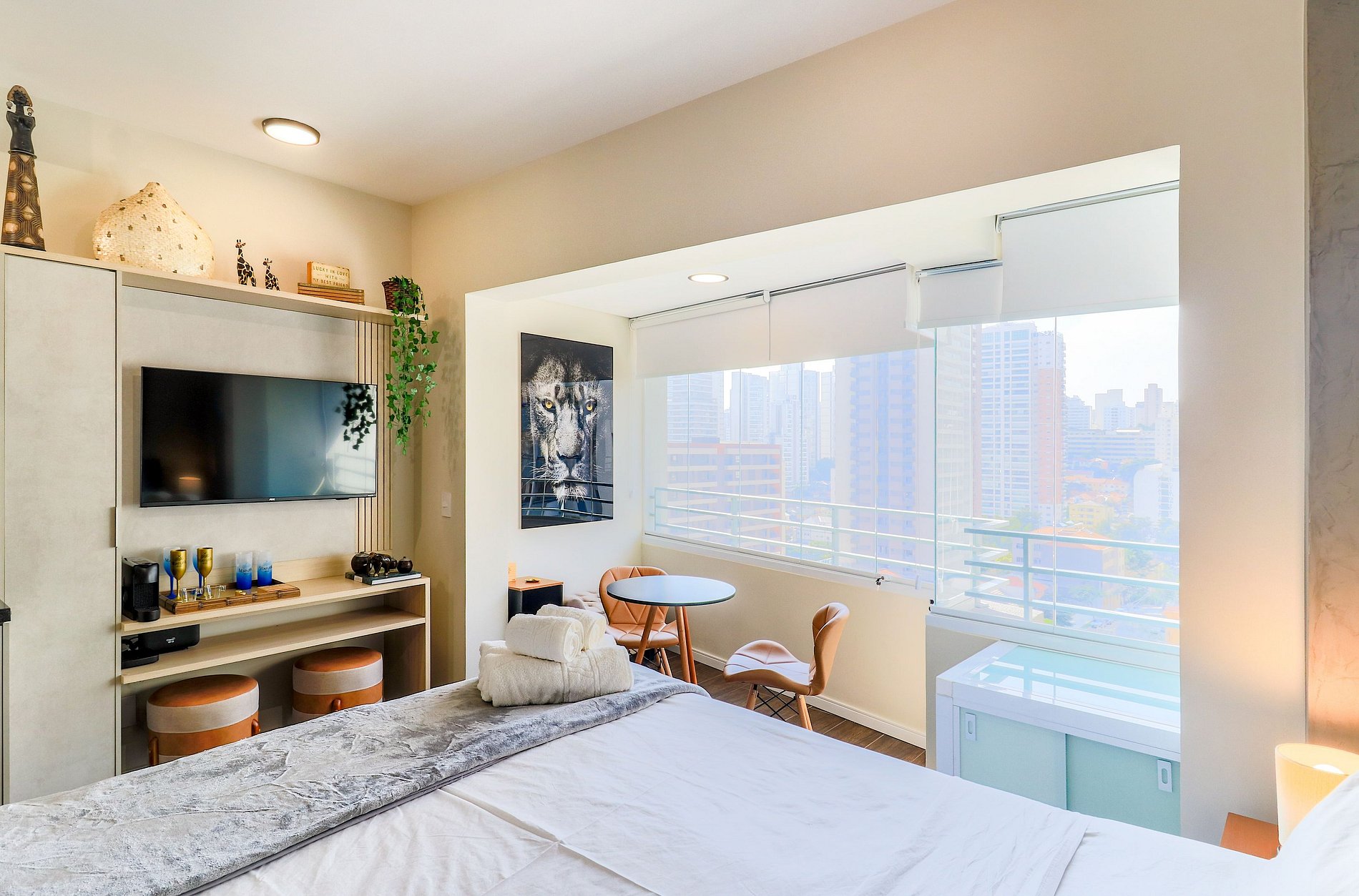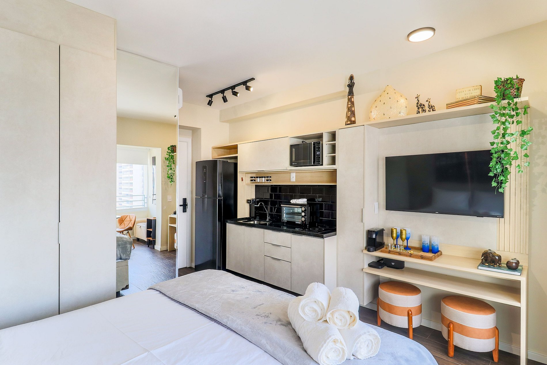 O apartamento possui 1 cama de casal Queen (1,58x1,98), e ar-condicionado. Cozinha completa com geladeira, freezer, micro-ondas, fogão de indução, jogo de talheres, cafeteira nespresso para home office, forninho, Misteira , filtro de agua potável, Liquidificador guarda-roupa, mesa, 2 Cadeira Interna, Cortina Black out TV com 2 banquetas , banheiro com ótimo chuveiro (água quente e fria). Será fornecido um jogo de enxoval (lençóis, travesseiros, fronhas e toalhas de banho) por hóspede. Outras observações Ao redor do endereço Rua Bartira 1003 você encontrará uma variedade de opções para tornar sua estadia cada vez mais agradável;