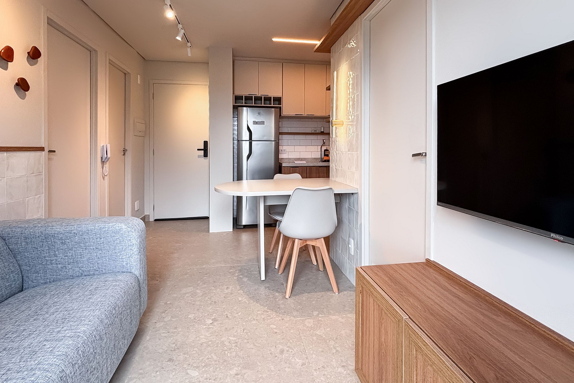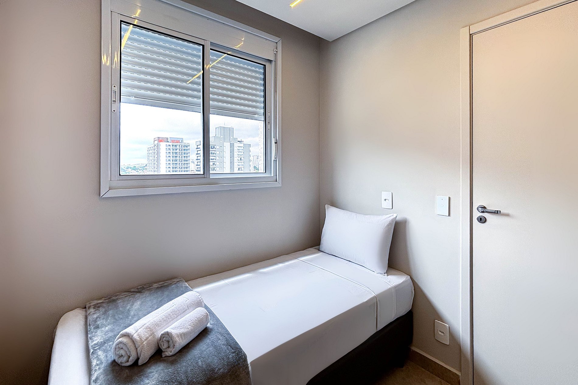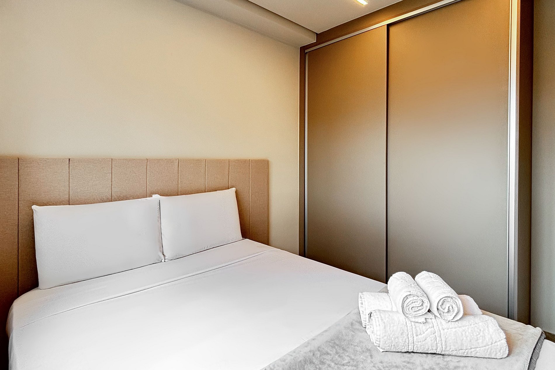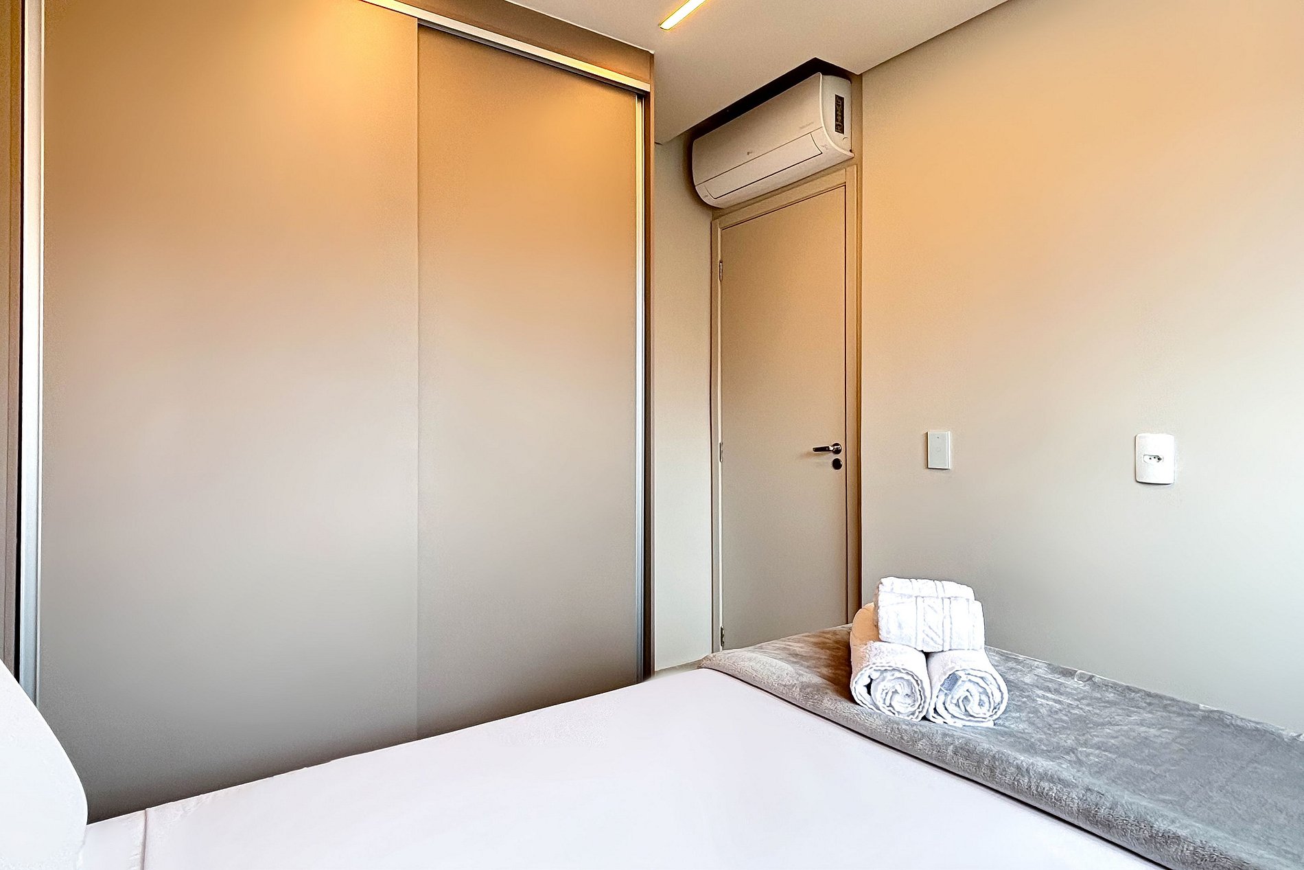 O apartamento possui dois quartos, sendo o primeiro com 1 cama de casal e ar-condicionado, e o segundo com 1 cama de solteiro. Cozinha completa com geladeira, freezer, micro-ondas, fogão de (4 bocas), Cafeteira, bancada para home office, guarda-roupa, secador de cabelo, ferro de passar, TV e banheiro com ótimo chuveiro (água quente e fria). Será fornecido um jogo de enxoval (lençóis, travesseiros, fronhas e toalhas de banho e rosto) por hóspede. Não há trocas durante a permanência.