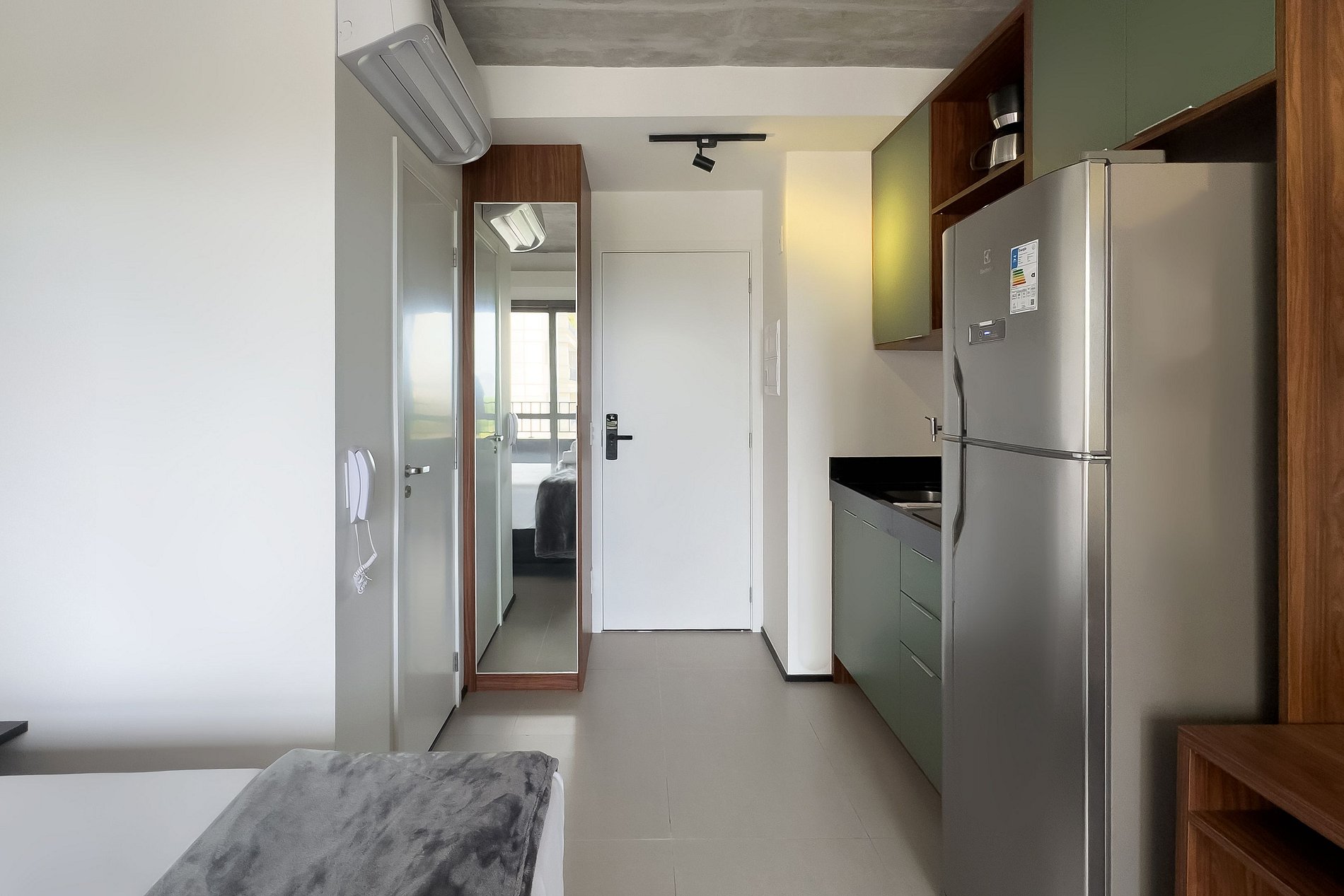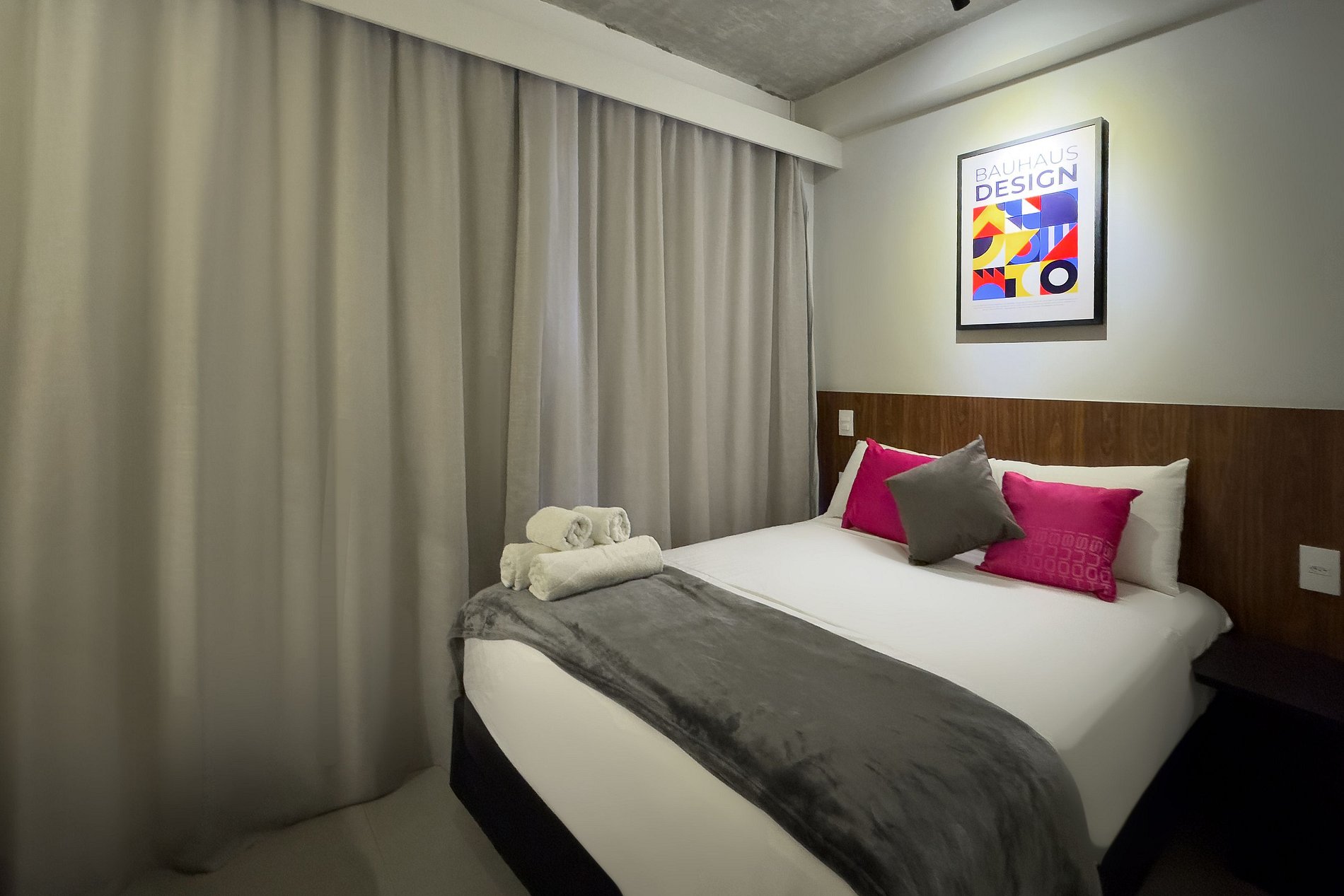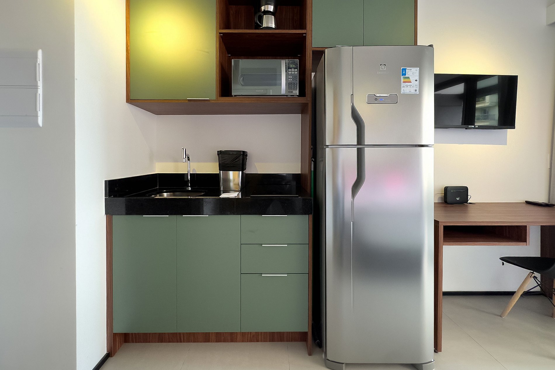 O apartamento conta com uma confortável cama de casal (1,38 x 1,88), ar-condicionado quente e frio, e uma cozinha completa equipada com geladeira, freezer, micro-ondas, fogão de indução, jogo de talheres e cafeteira Nespresso.