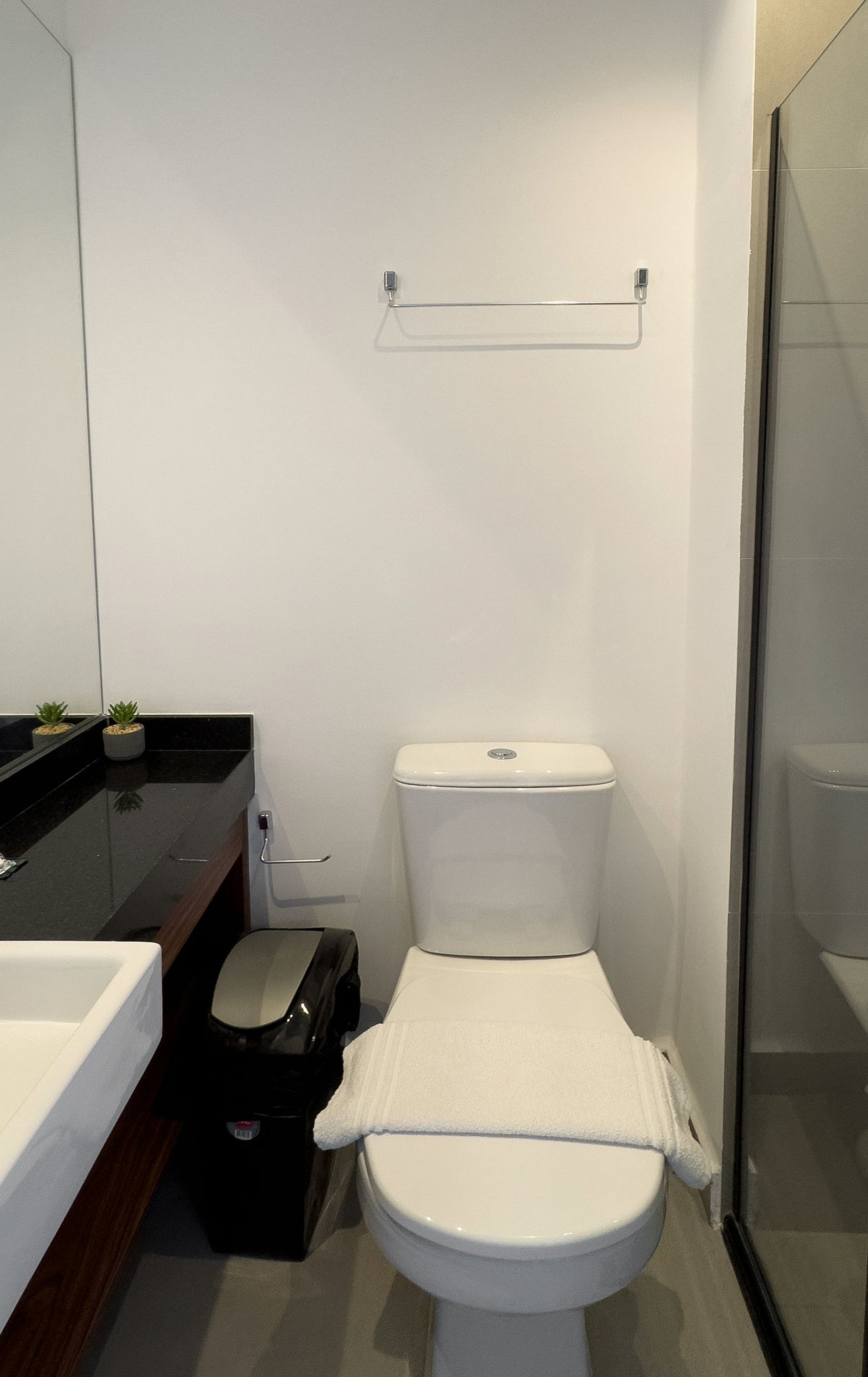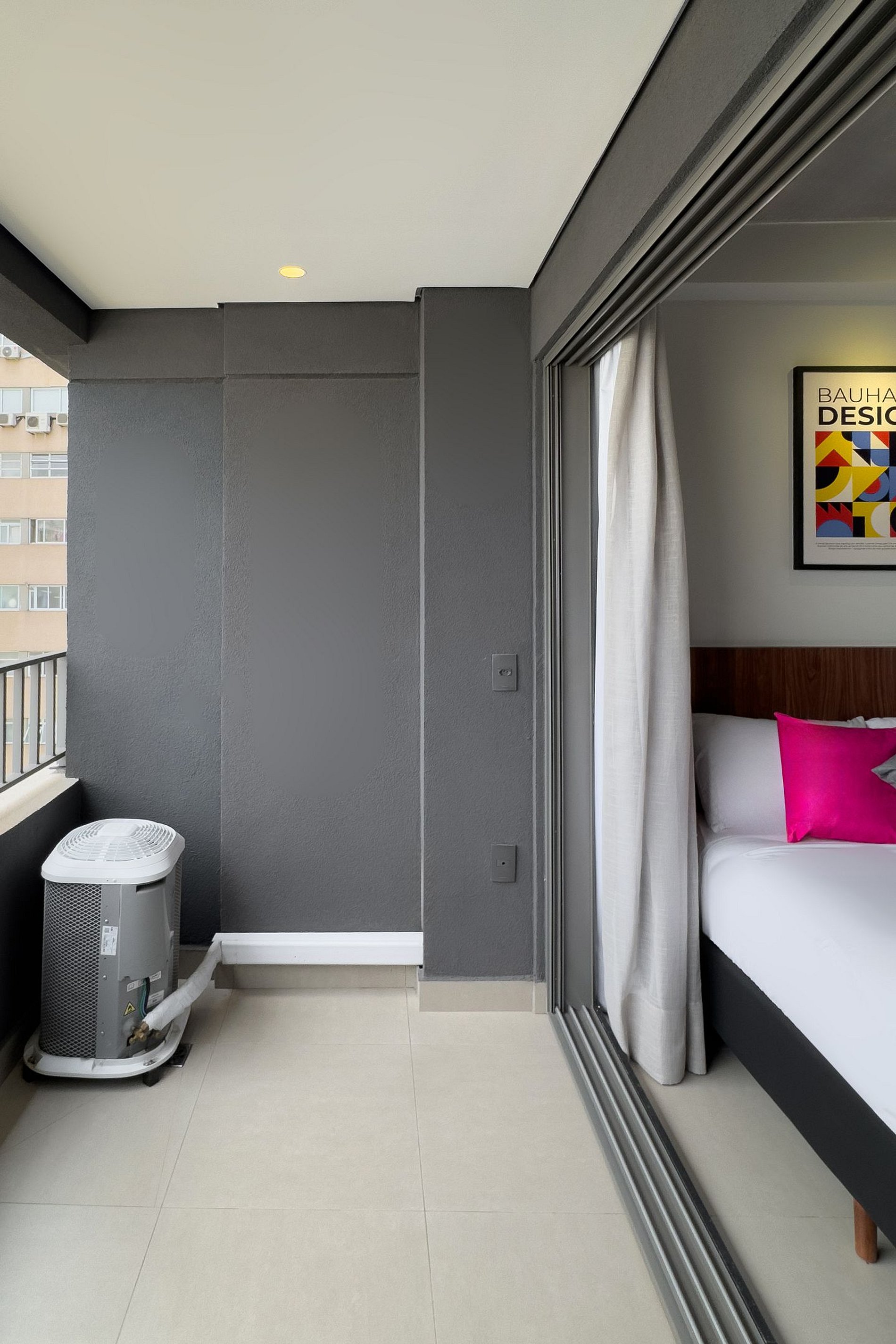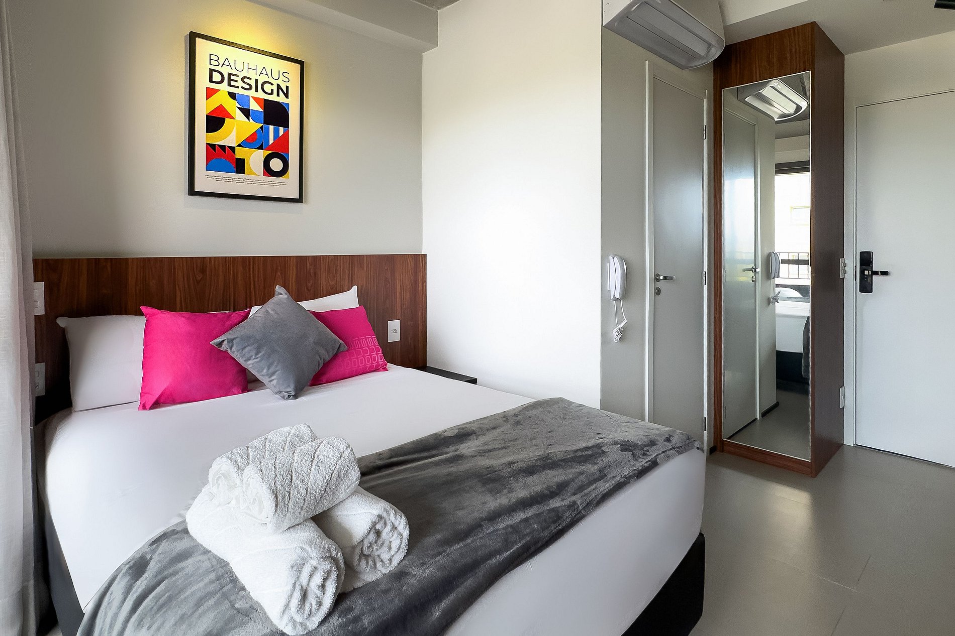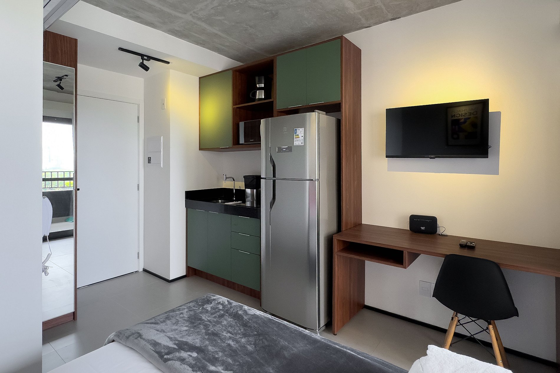 O apartamento conta com uma confortável cama de casal (1,38 x 1,88), ar-condicionado quente e frio, e uma cozinha completa equipada com geladeira, freezer, micro-ondas, fogão de indução, jogo de talheres e cafeteira Nespresso.