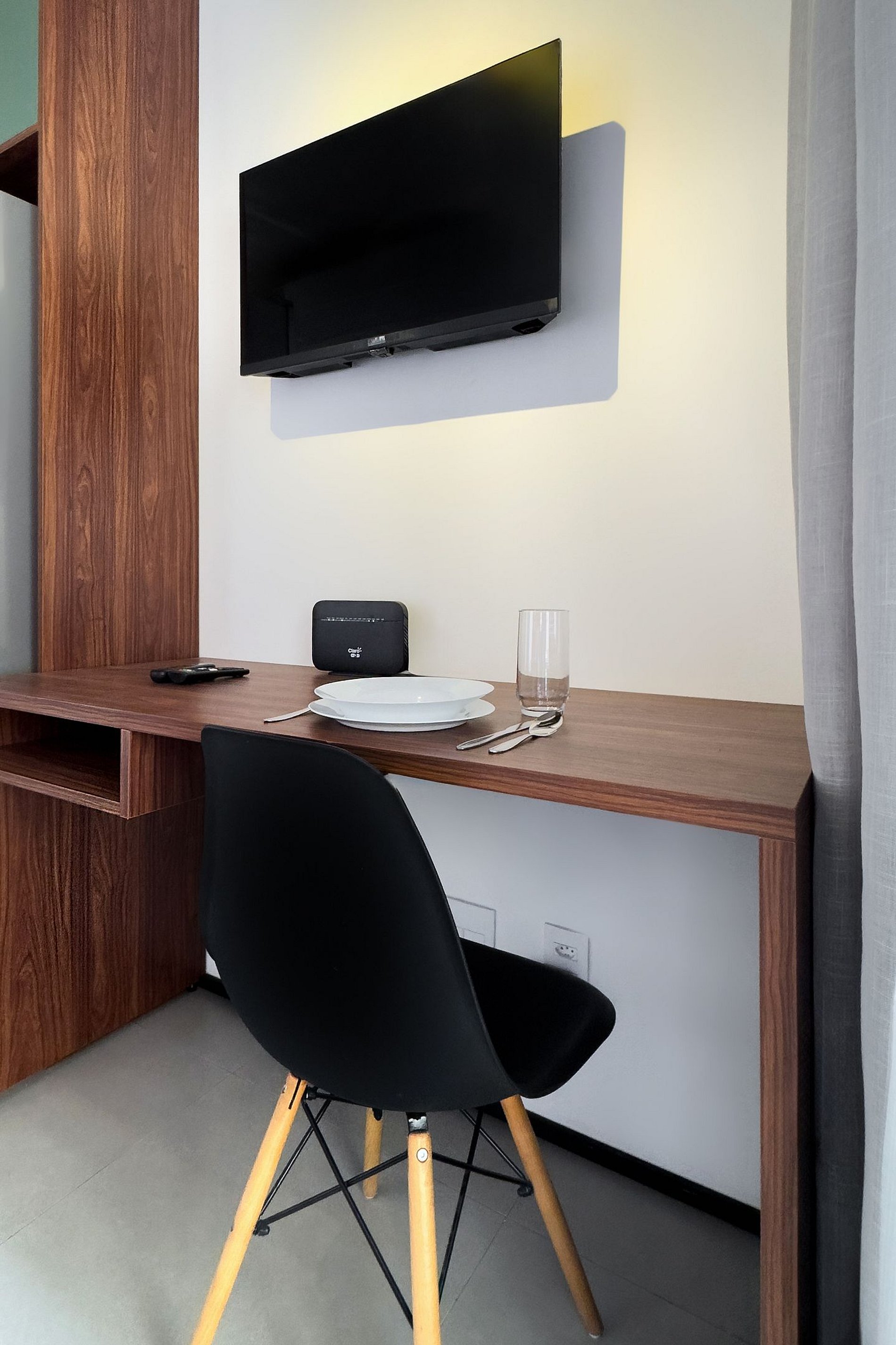 Ideal para home office, o espaço dispõe de guarda-roupa, mesa de trabalho com dois bancos e iluminação adequada.
