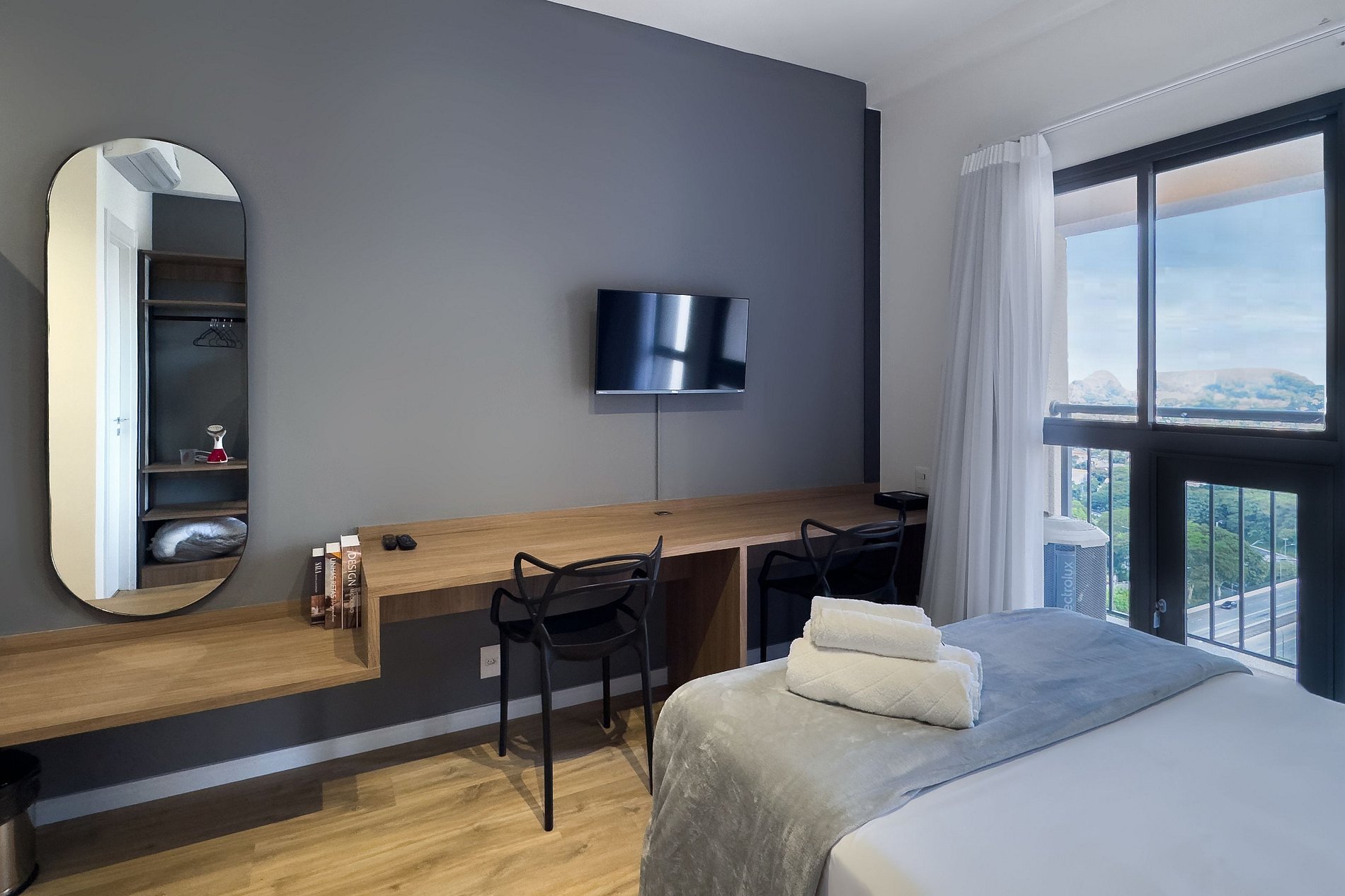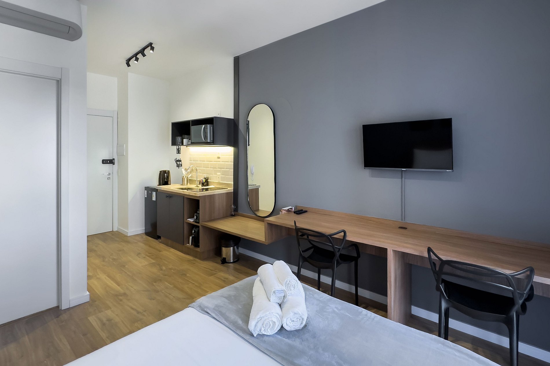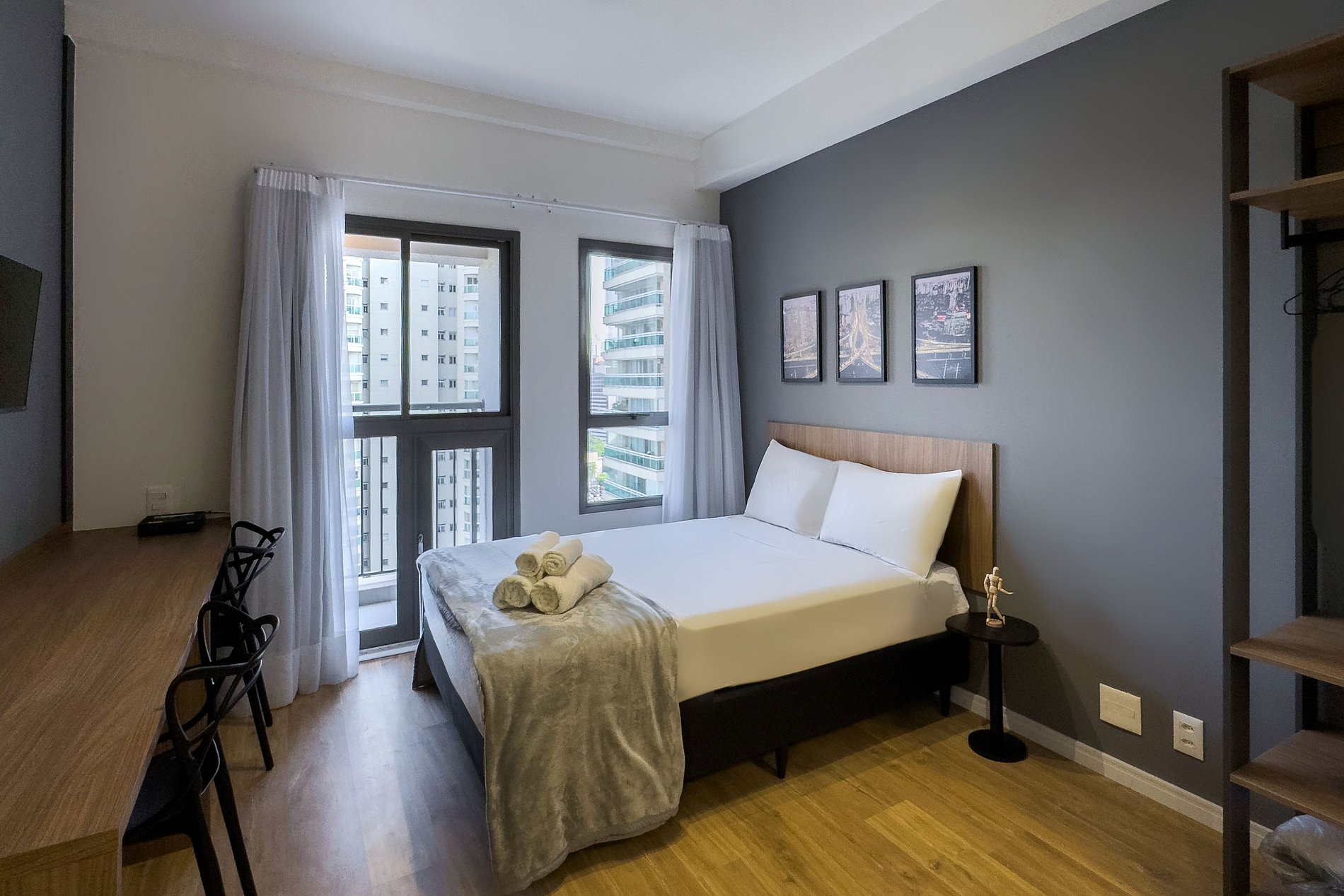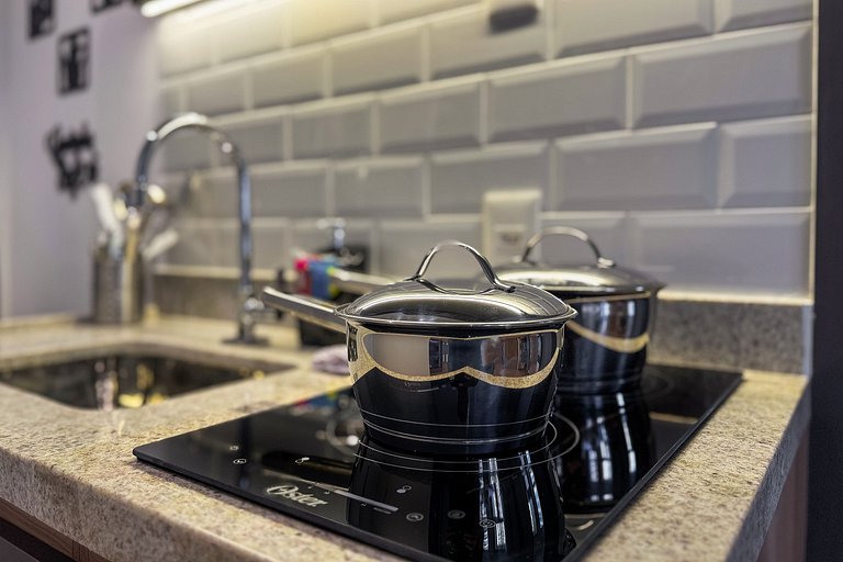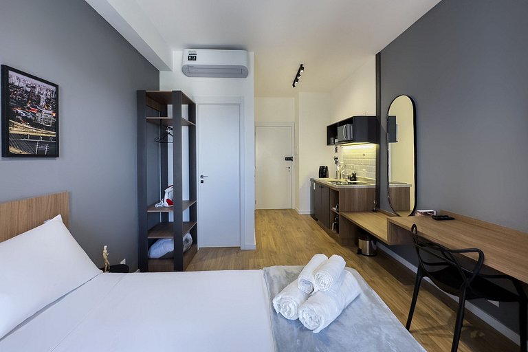 O apartamento possui 1 cama casal padrão (1,38x1,88), e ar-condicionado. Cozinha completa com frigobar, micro-ondas, fogão de indução, jogo de talheres, cafeteira Dulce gusto para home office, filtro de agua potável, Liquidificador guarda-roupa, mesa, 2 Cadeira Interna, Cortina Black out TV com 2 cadeiras , AirFrier, banheiro com ótimo chuveiro (água quente e fria). Será fornecido um jogo de enxoval (lençóis, travesseiros, fronhas e toalhas de banho) por hóspede. Outras observações Ao redor do endereço R. Sebastião Gomes, 71 você encontrará uma variedade de opções para tornar sua estadia cada vez mais agradável;