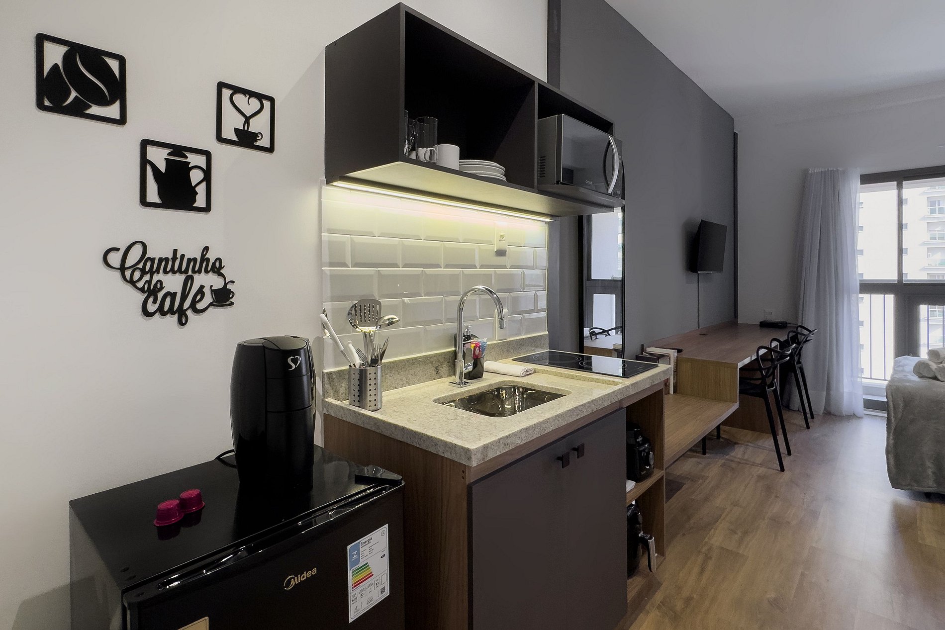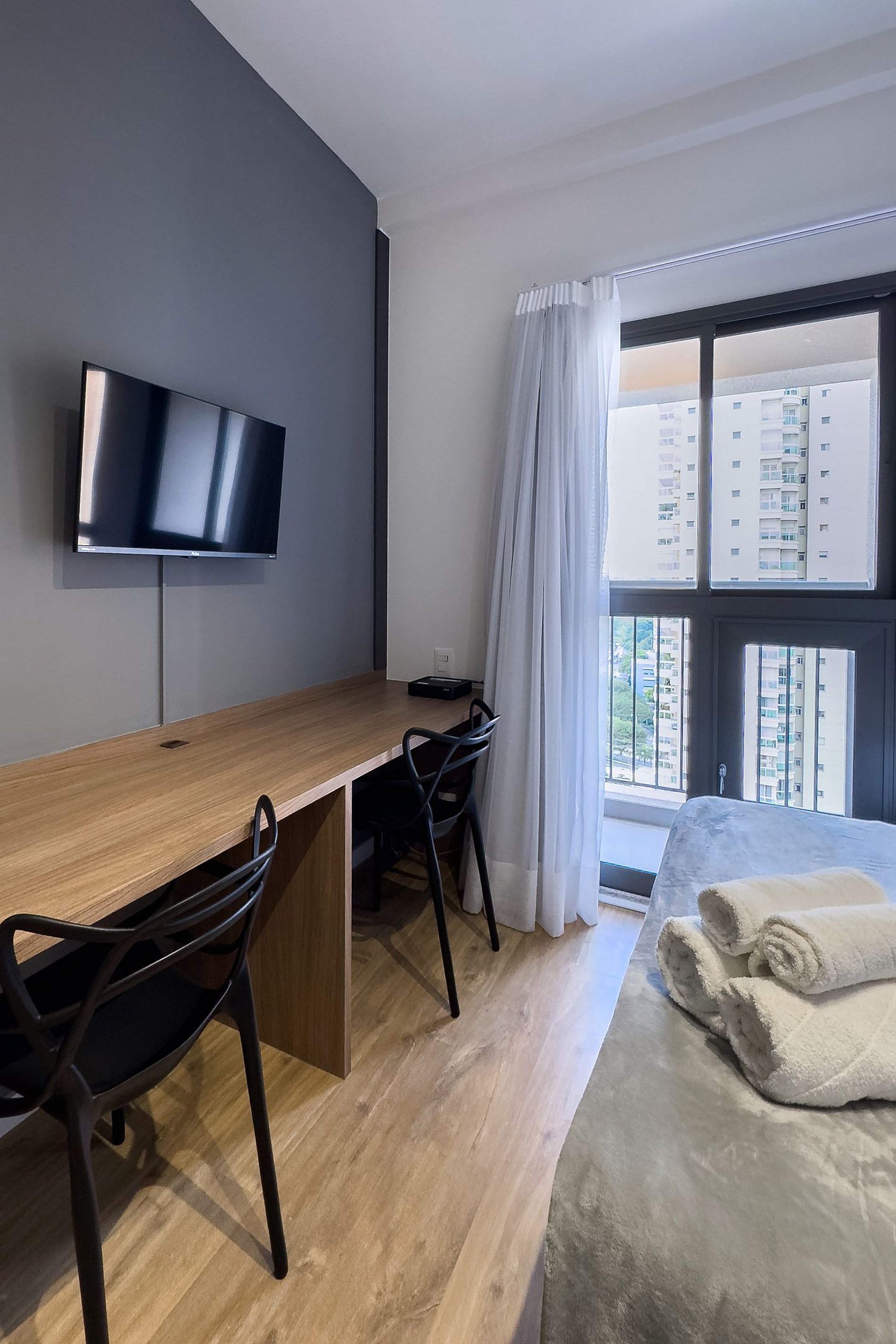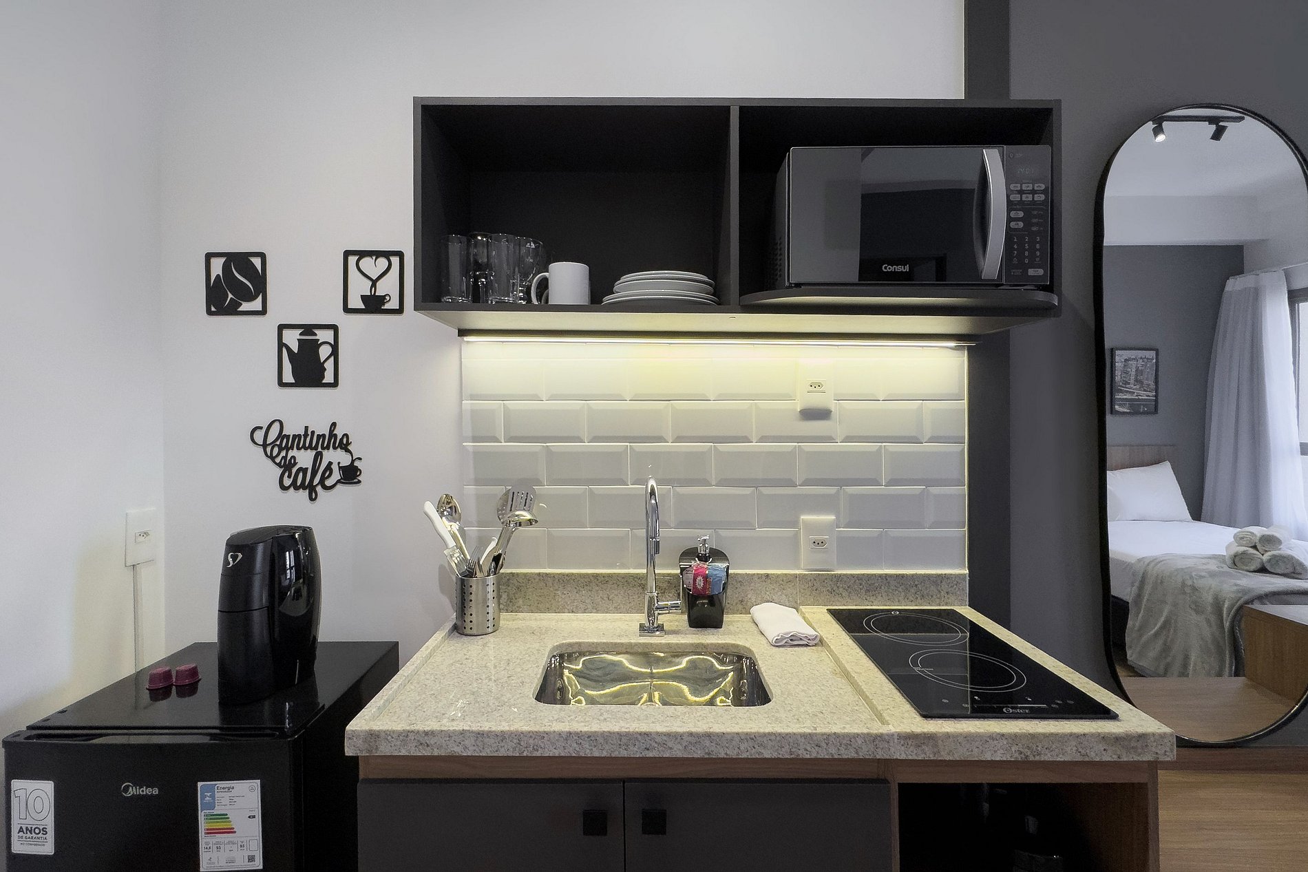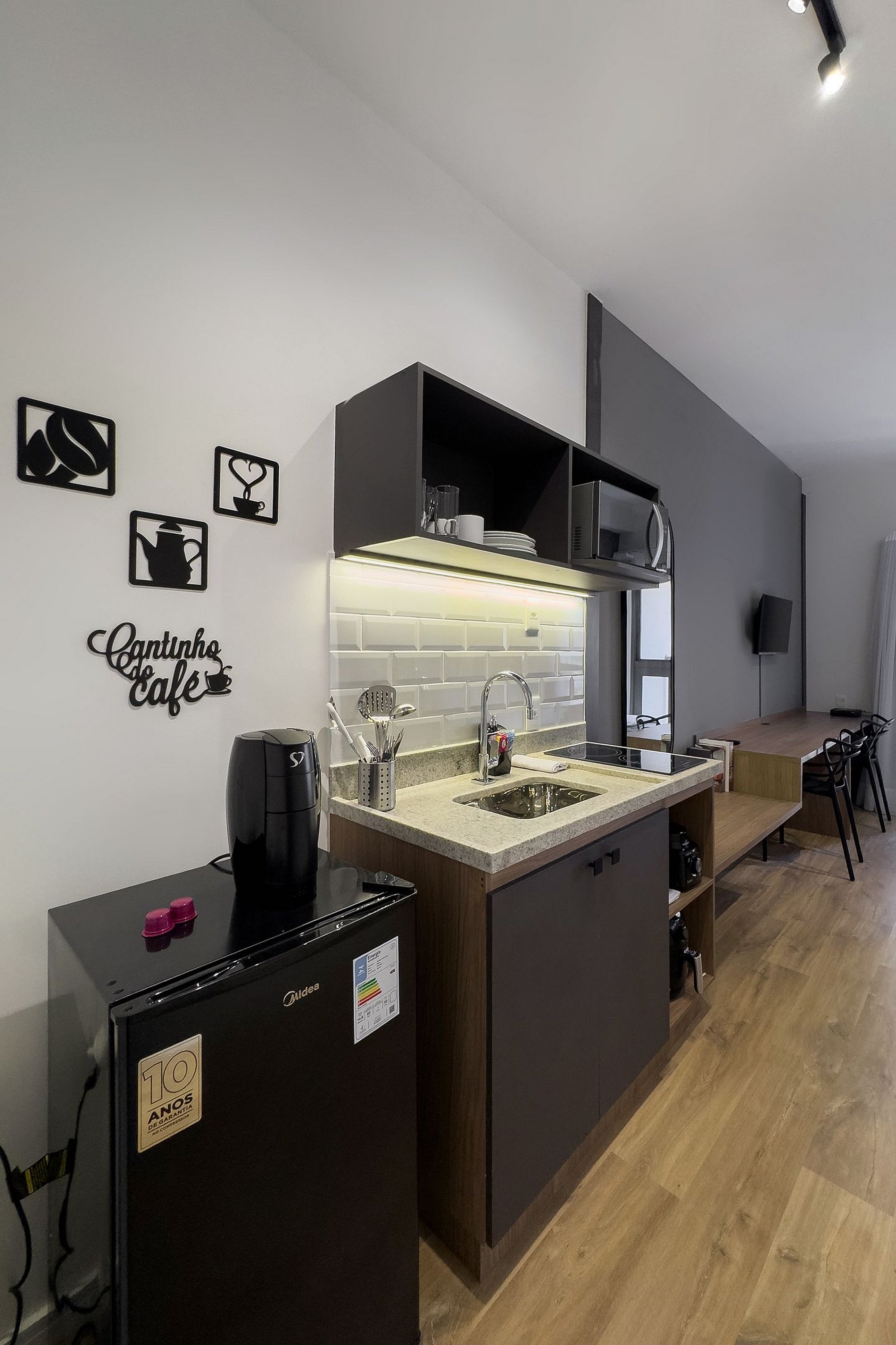 O apartamento possui 1 cama casal padrão (1,38x1,88), e ar-condicionado. Cozinha completa com frigobar, micro-ondas, fogão de indução, jogo de talheres, cafeteira Dulce gusto para home office, filtro de agua potável, Liquidificador guarda-roupa, mesa, 2 Cadeira Interna, Cortina Black out TV com 2 cadeiras , AirFrier, banheiro com ótimo chuveiro (água quente e fria). Será fornecido um jogo de enxoval (lençóis, travesseiros, fronhas e toalhas de banho) por hóspede. Outras observações Ao redor do endereço R. Sebastião Gomes, 71 você encontrará uma variedade de opções para tornar sua estadia cada vez mais agradável;