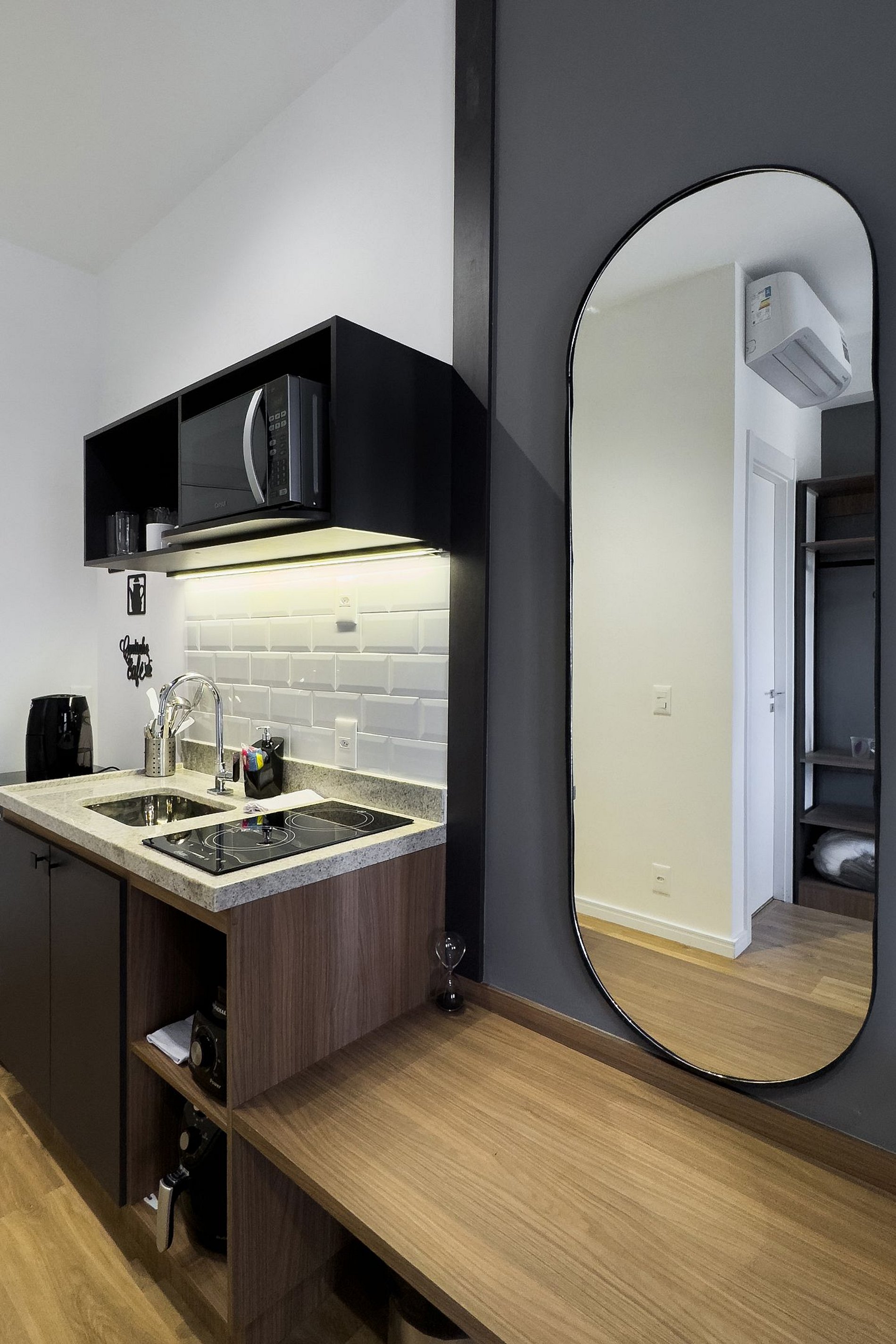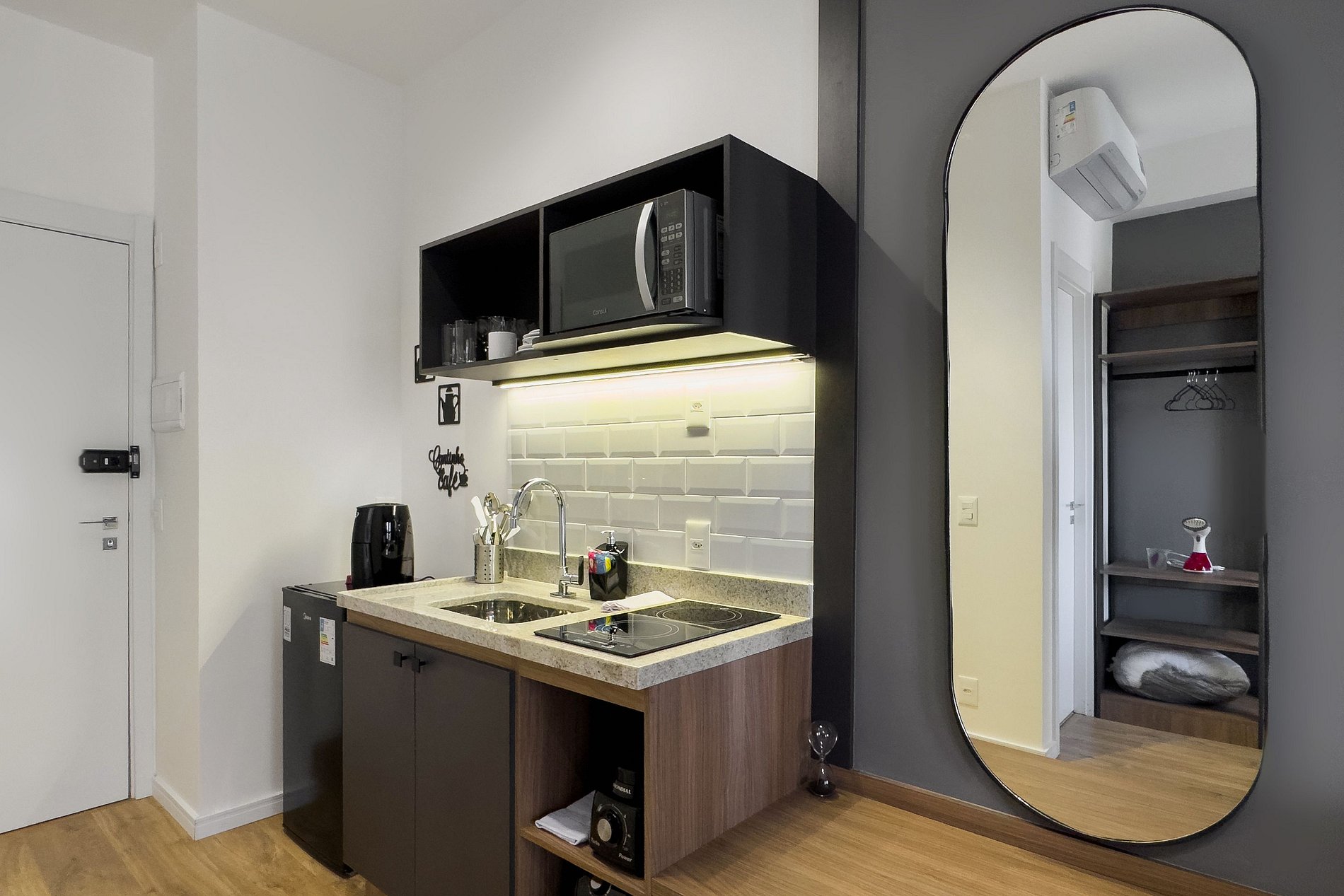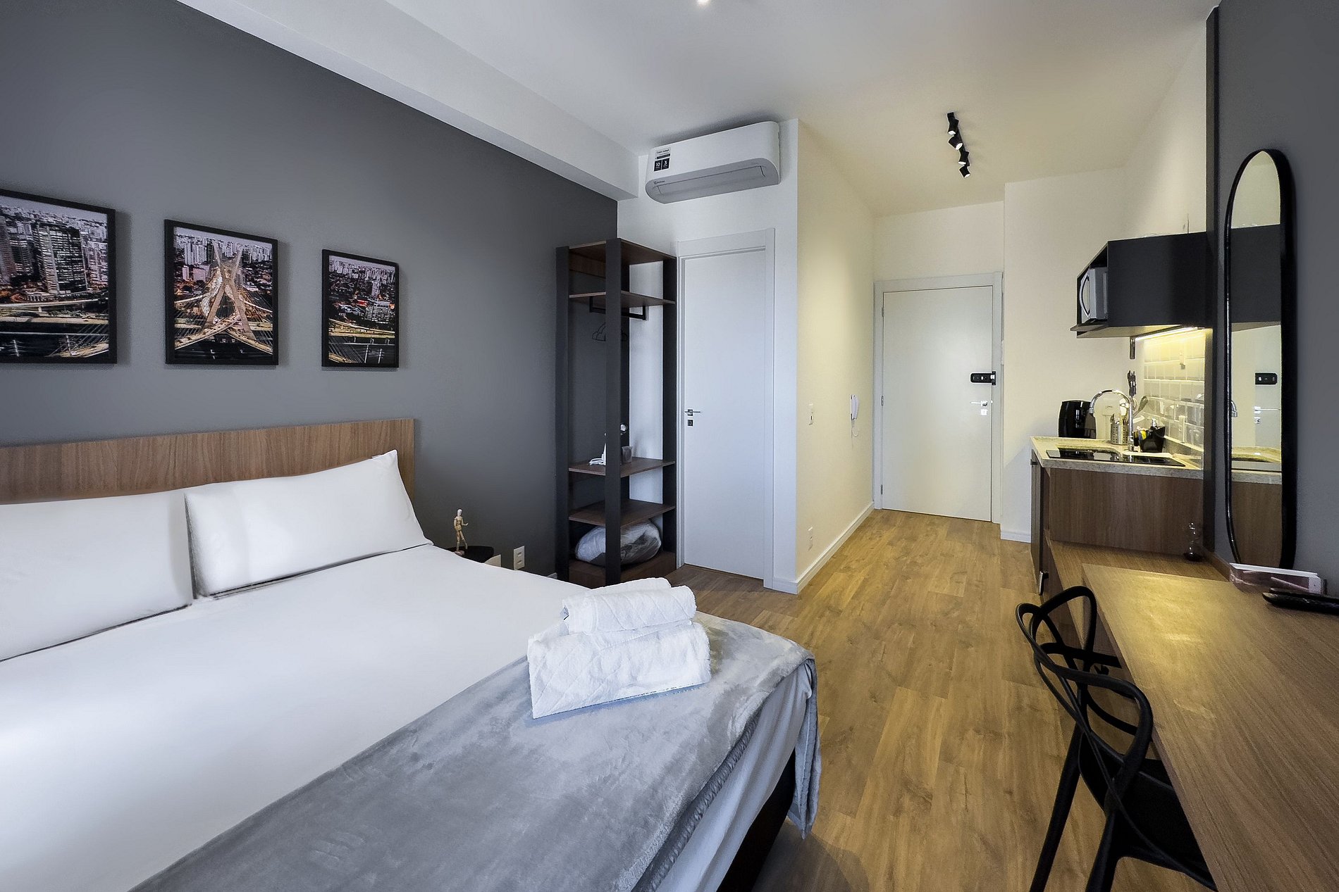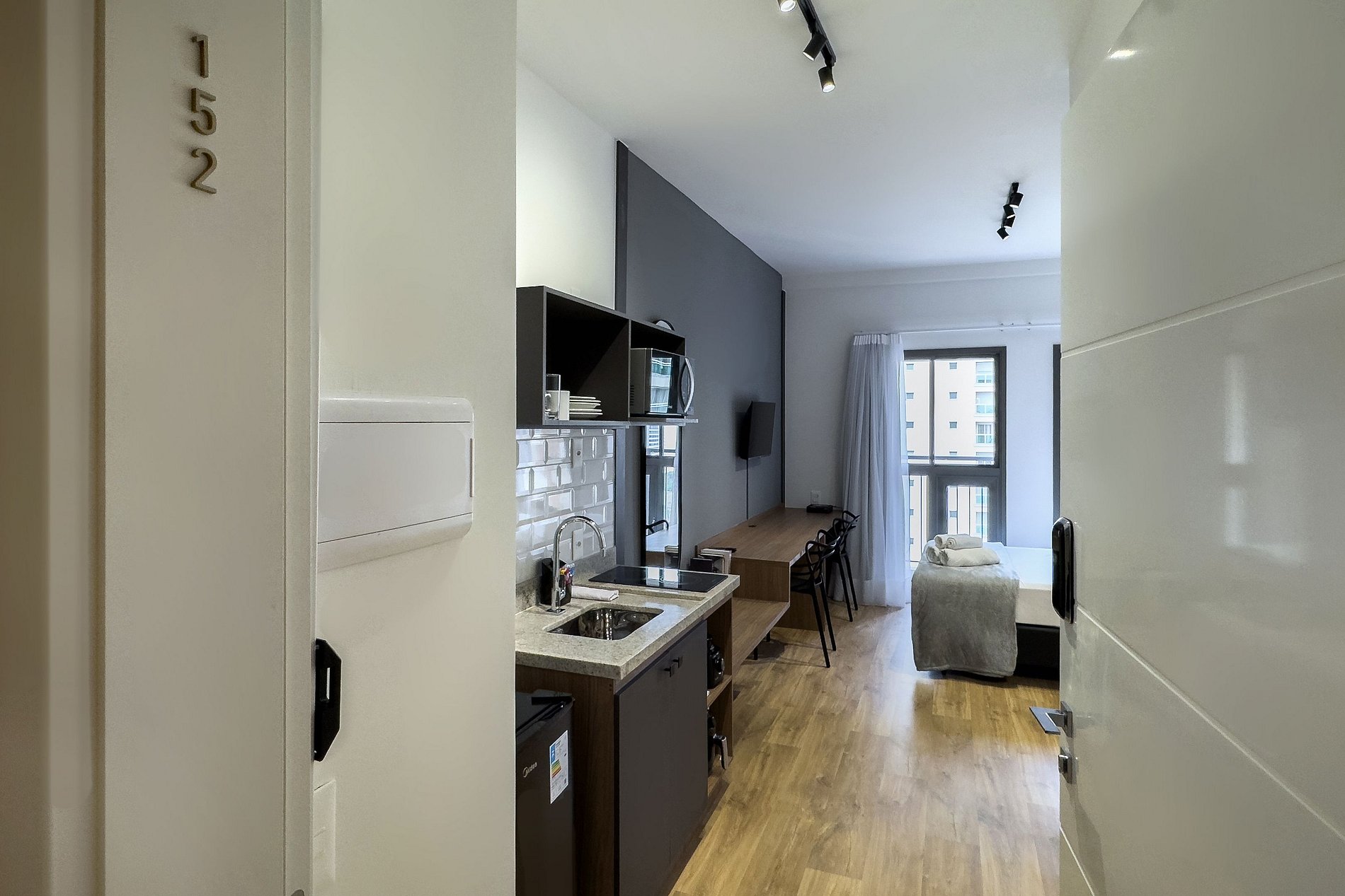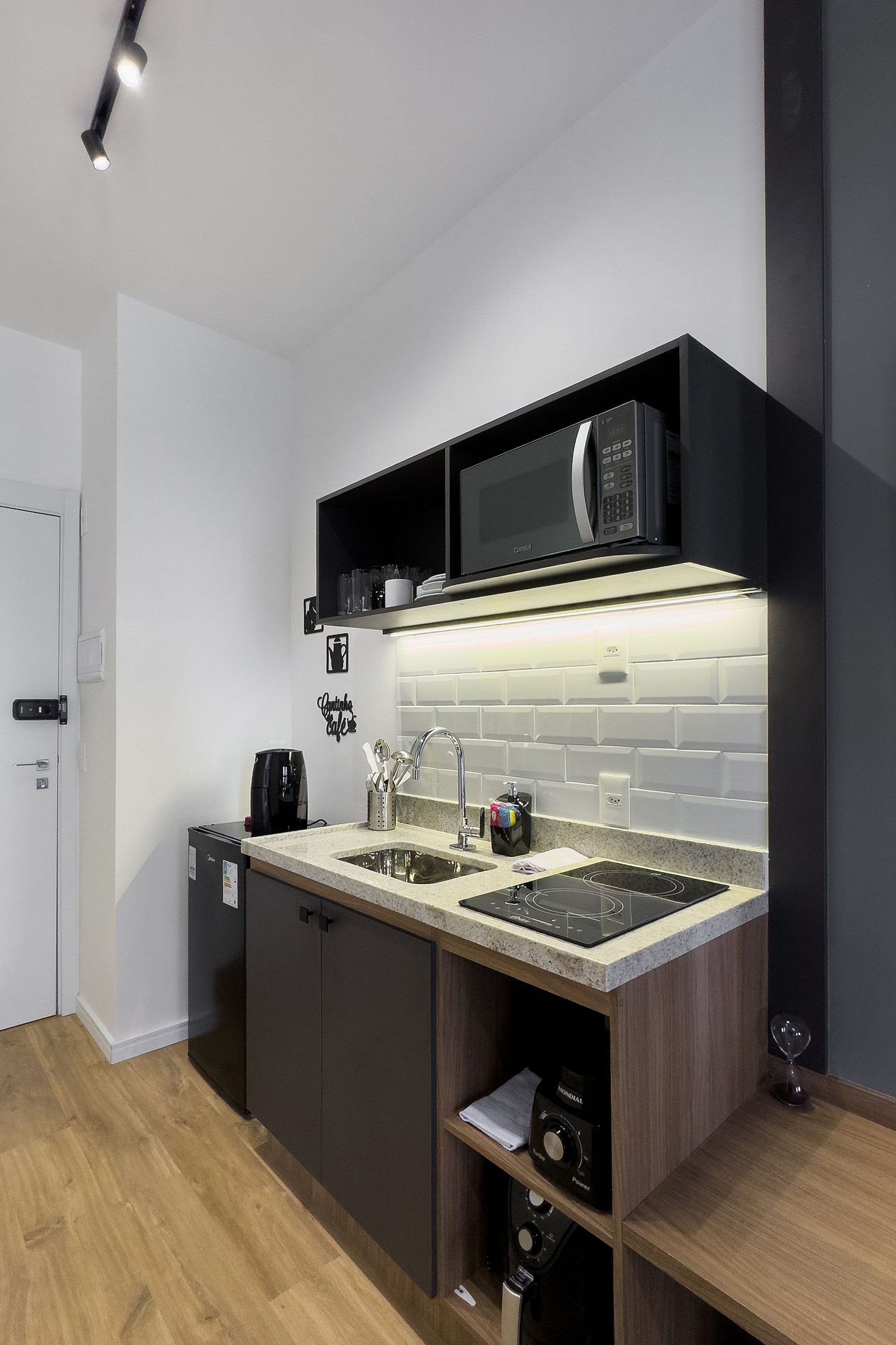 O apartamento possui 1 cama casal padrão (1,38x1,88), e ar-condicionado. Cozinha completa com frigobar, micro-ondas, fogão de indução, jogo de talheres, cafeteira Dulce gusto para home office, filtro de agua potável, Liquidificador guarda-roupa, mesa, 2 Cadeira Interna, Cortina Black out TV com 2 cadeiras , AirFrier, banheiro com ótimo chuveiro (água quente e fria). Será fornecido um jogo de enxoval (lençóis, travesseiros, fronhas e toalhas de banho) por hóspede. Outras observações Ao redor do endereço R. Sebastião Gomes, 71 você encontrará uma variedade de opções para tornar sua estadia cada vez mais agradável;