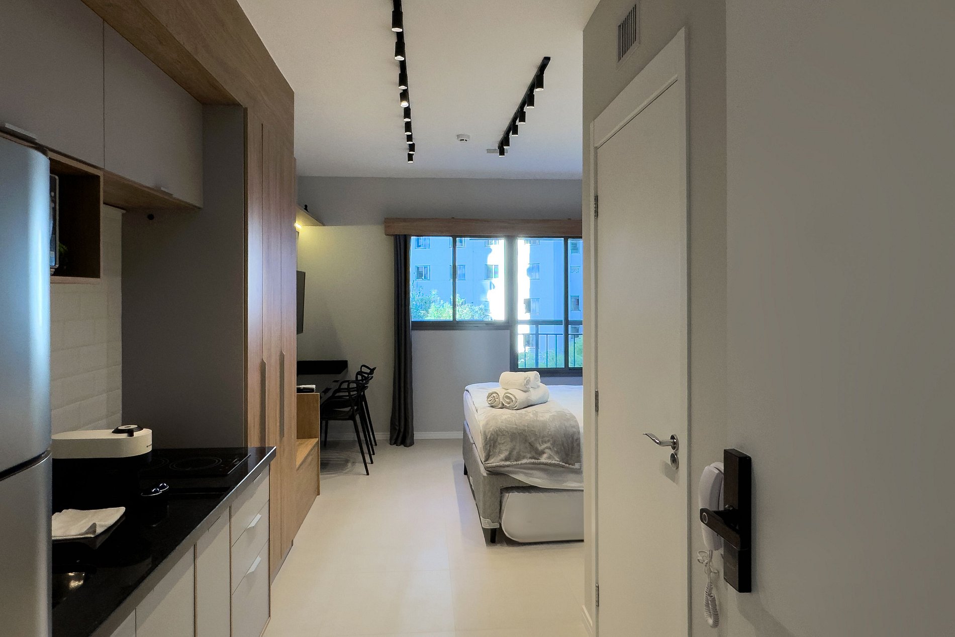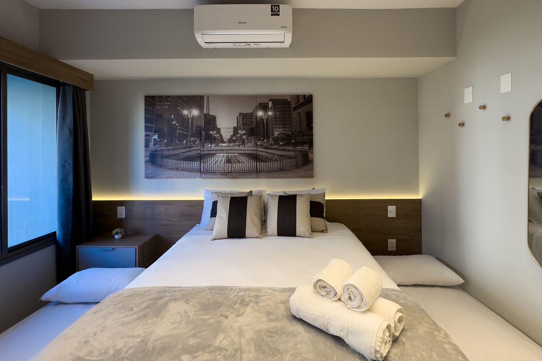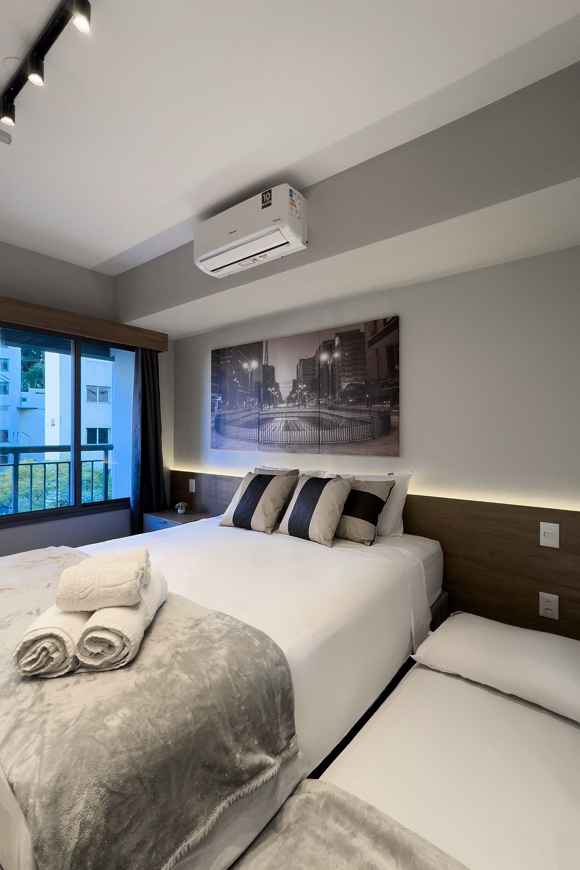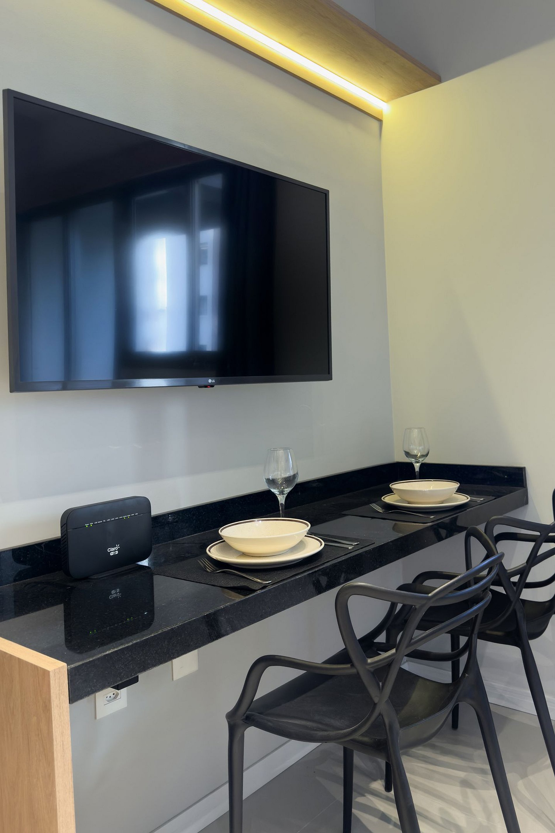 O apartamento possui 1 cama de casal Queen (1,58x1,98), 2 camas bi-camas de solteiro e ar-condicionado. Cozinha completa com geladeira, freezer, micro-ondas, fogão de indução, jogo de talheres, air fryer, cafeteira elétrica para home office, guarda-roupa, mesa, 2 Cadeira Interna, TV e banheiro com ótimo chuveiro (água quente e fria). Será fornecido um jogo de enxoval (lençóis, travesseiros, fronhas e toalhas de banho) por hóspede. Outras observações Ao redor do Edidício você encontrará uma variedade de opções para tornar sua estadia cada vez mais agradável;
