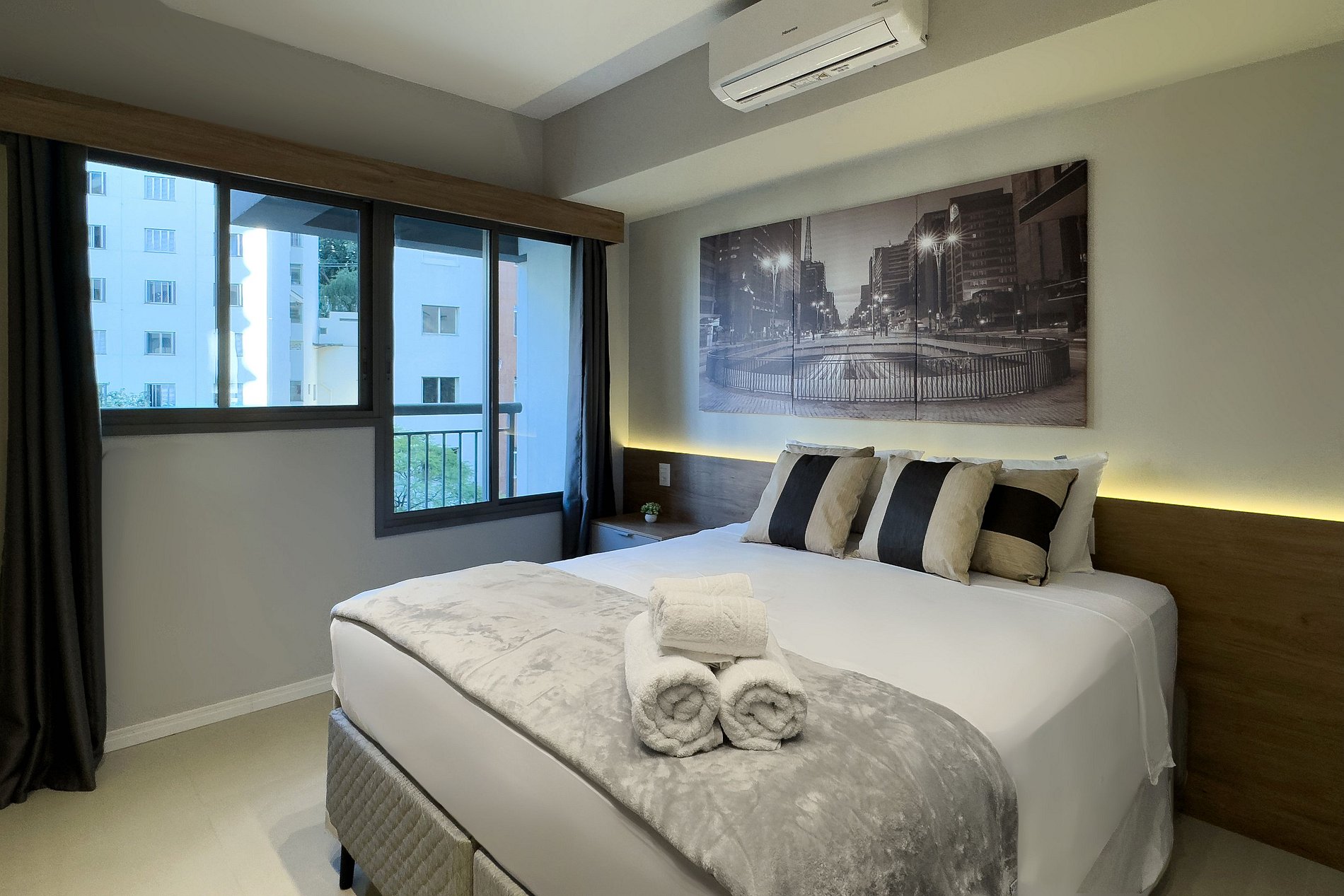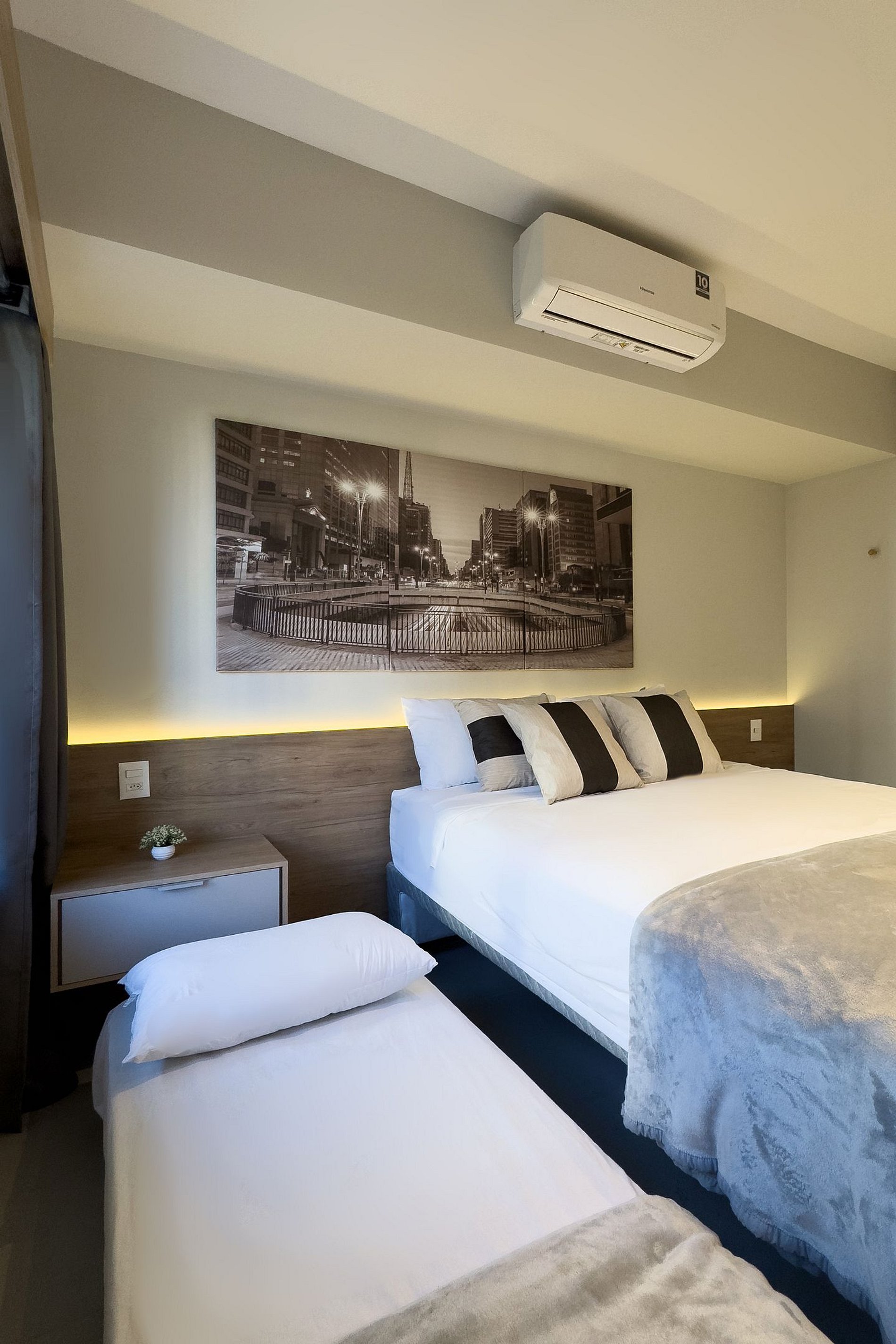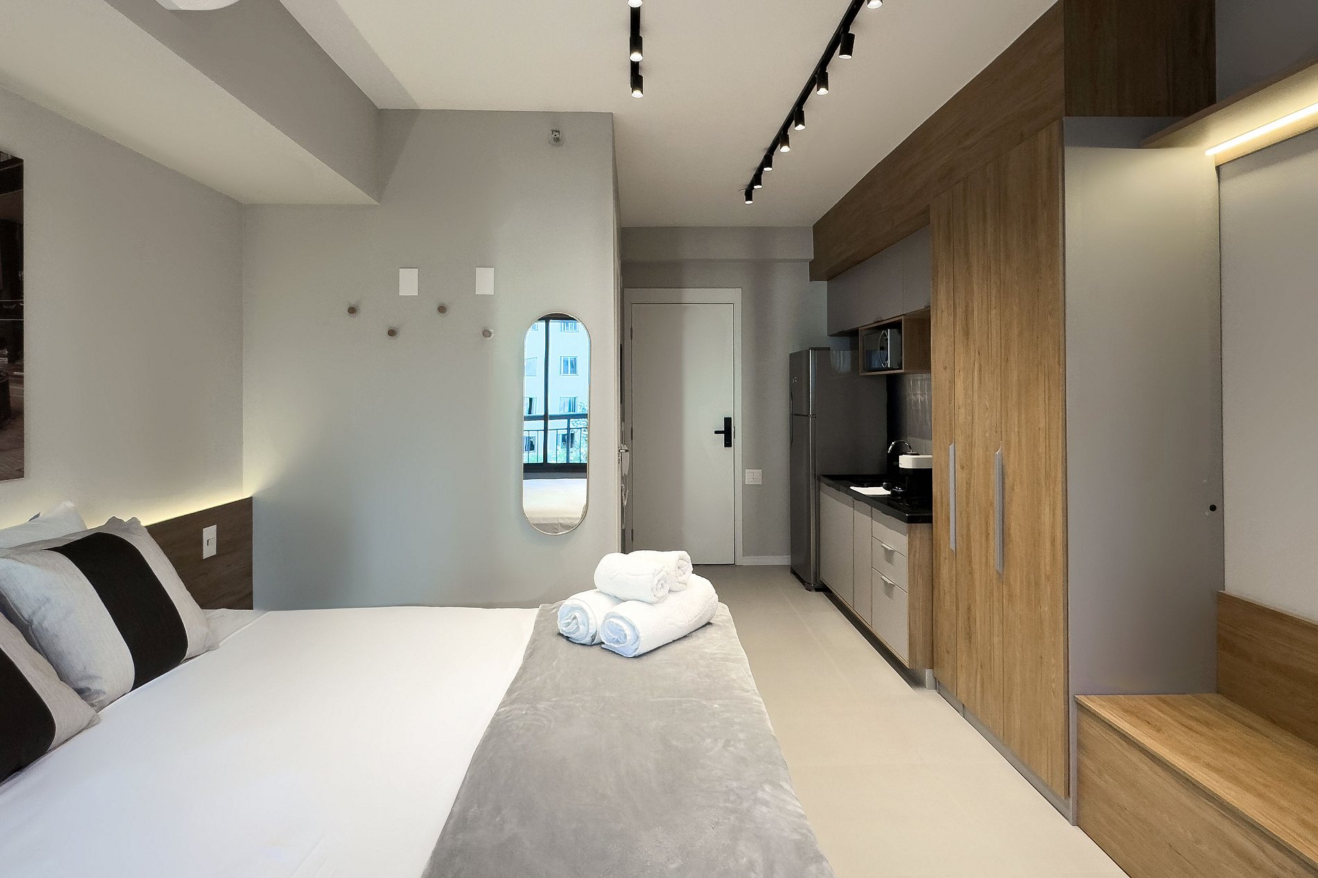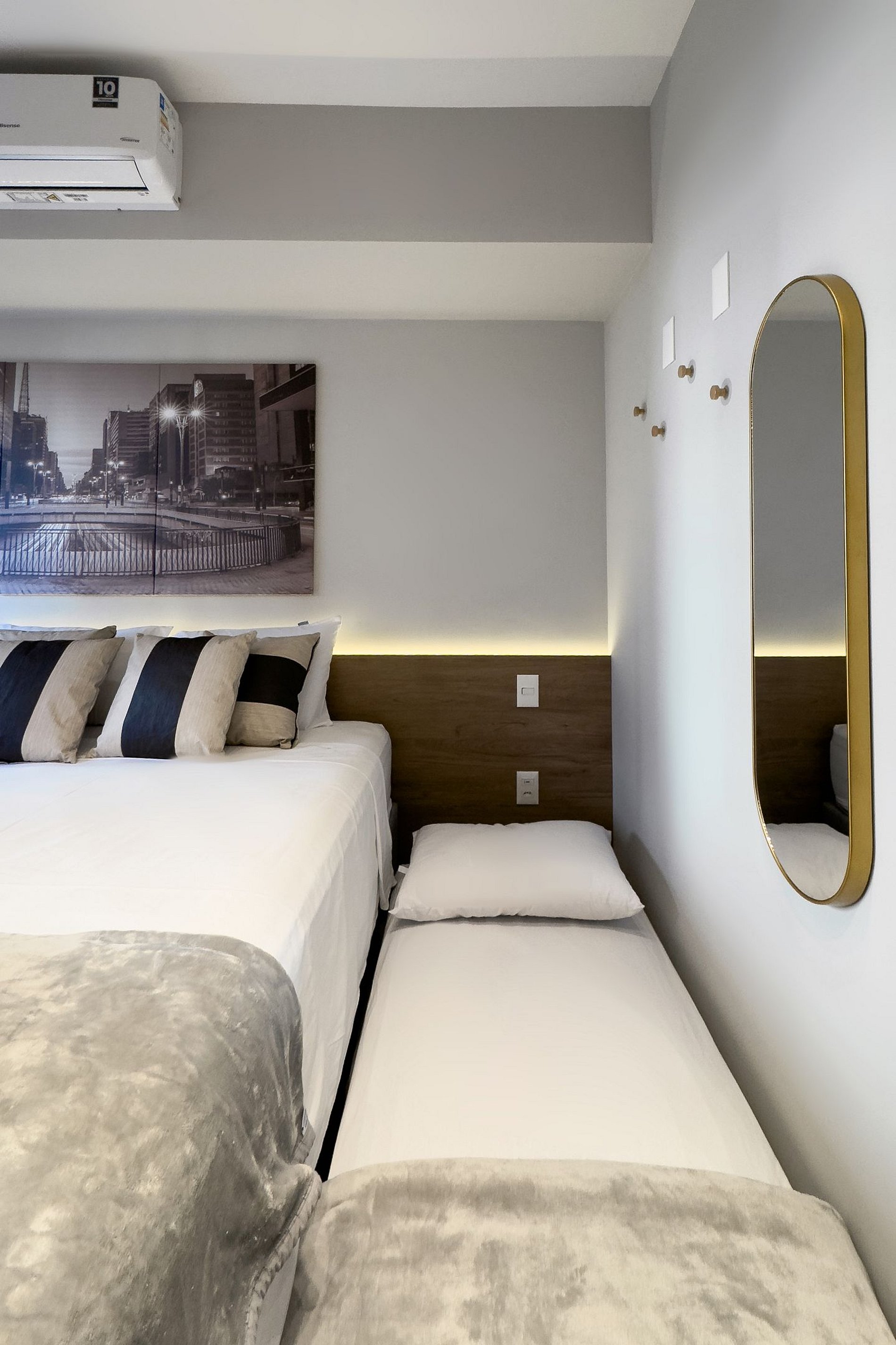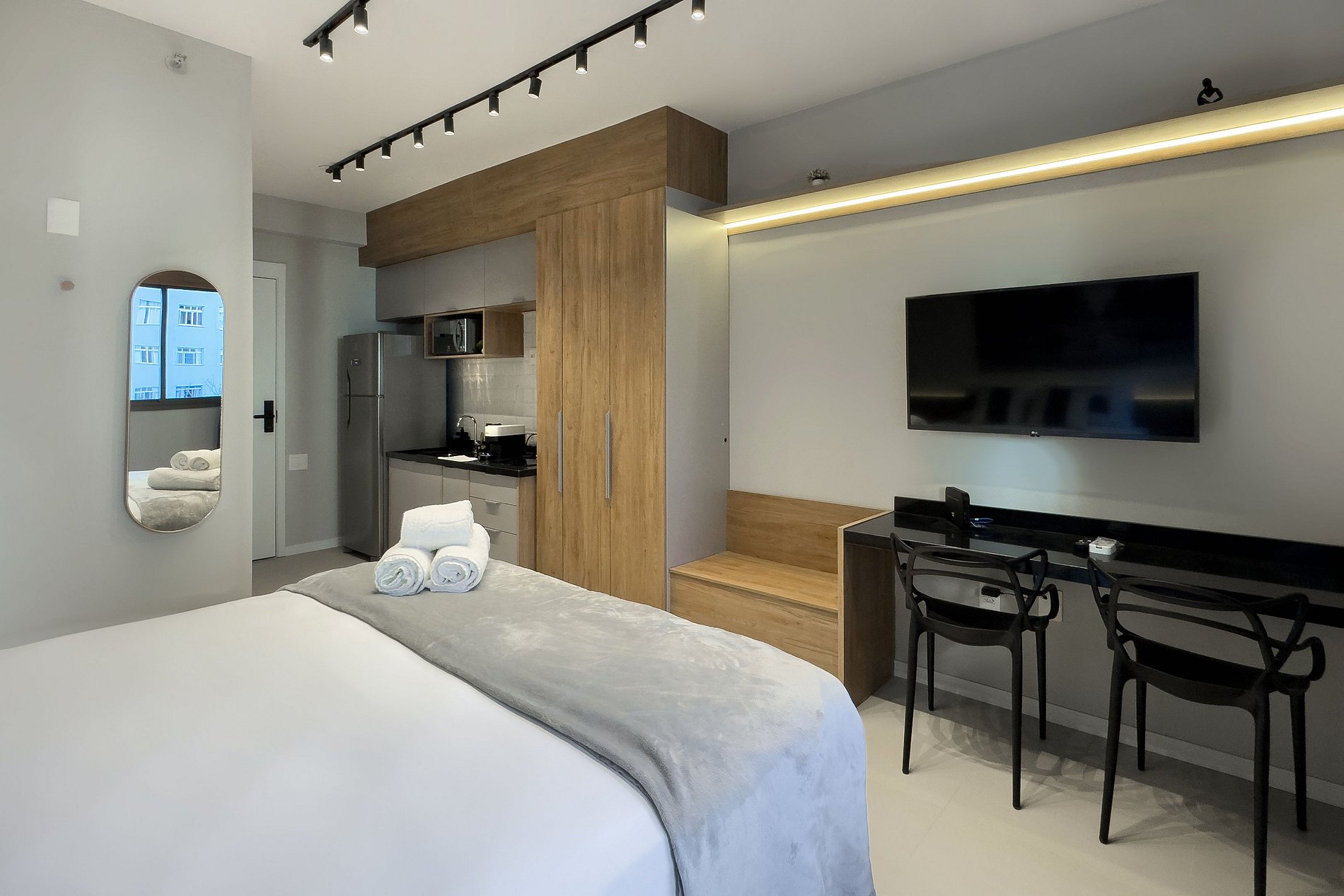 O apartamento possui 1 cama de casal Queen (1,58x1,98), 2 camas bi-camas de solteiro e ar-condicionado. Cozinha completa com geladeira, freezer, micro-ondas, fogão de indução, jogo de talheres, air fryer, cafeteira elétrica para home office, guarda-roupa, mesa, 2 Cadeira Interna, TV e banheiro com ótimo chuveiro (água quente e fria). Será fornecido um jogo de enxoval (lençóis, travesseiros, fronhas e toalhas de banho) por hóspede. Outras observações Ao redor do Edidício você encontrará uma variedade de opções para tornar sua estadia cada vez mais agradável;