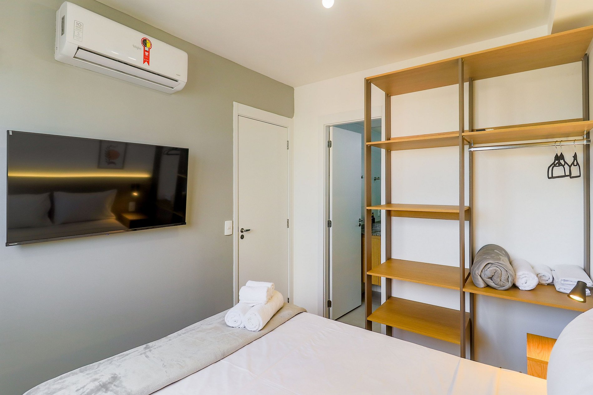 O apartamento possui 1 cama de casal padrão (1,38x1,88), ar-condicionado. Cozinha completa com geladeira, freezer, micro-ondas, fogão de indução, jogo de talheres, cafeteira nespresso para home office, guarda-roupa, mesa, 2 Cadeira Interna, TV na sala e quarto. banheiro com ótimo chuveiro (água quente e fria). Será fornecido um jogo de enxoval (lençóis, travesseiros, fronhas e toalhas de banho) por hóspede. Outras observações Ao redor do endereço você encontrará uma variedade de opções para tornar sua estadia cada vez mais agradável;