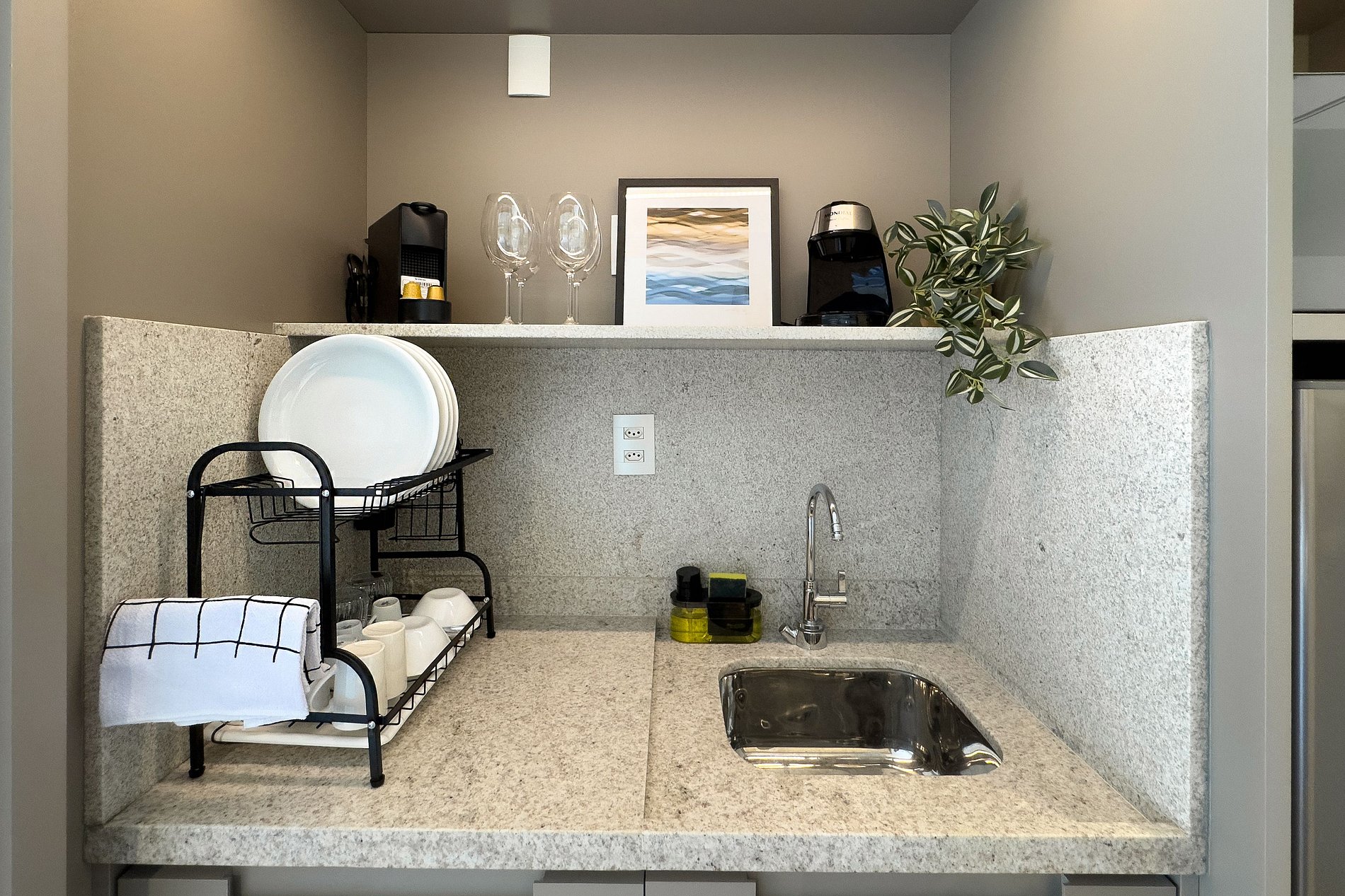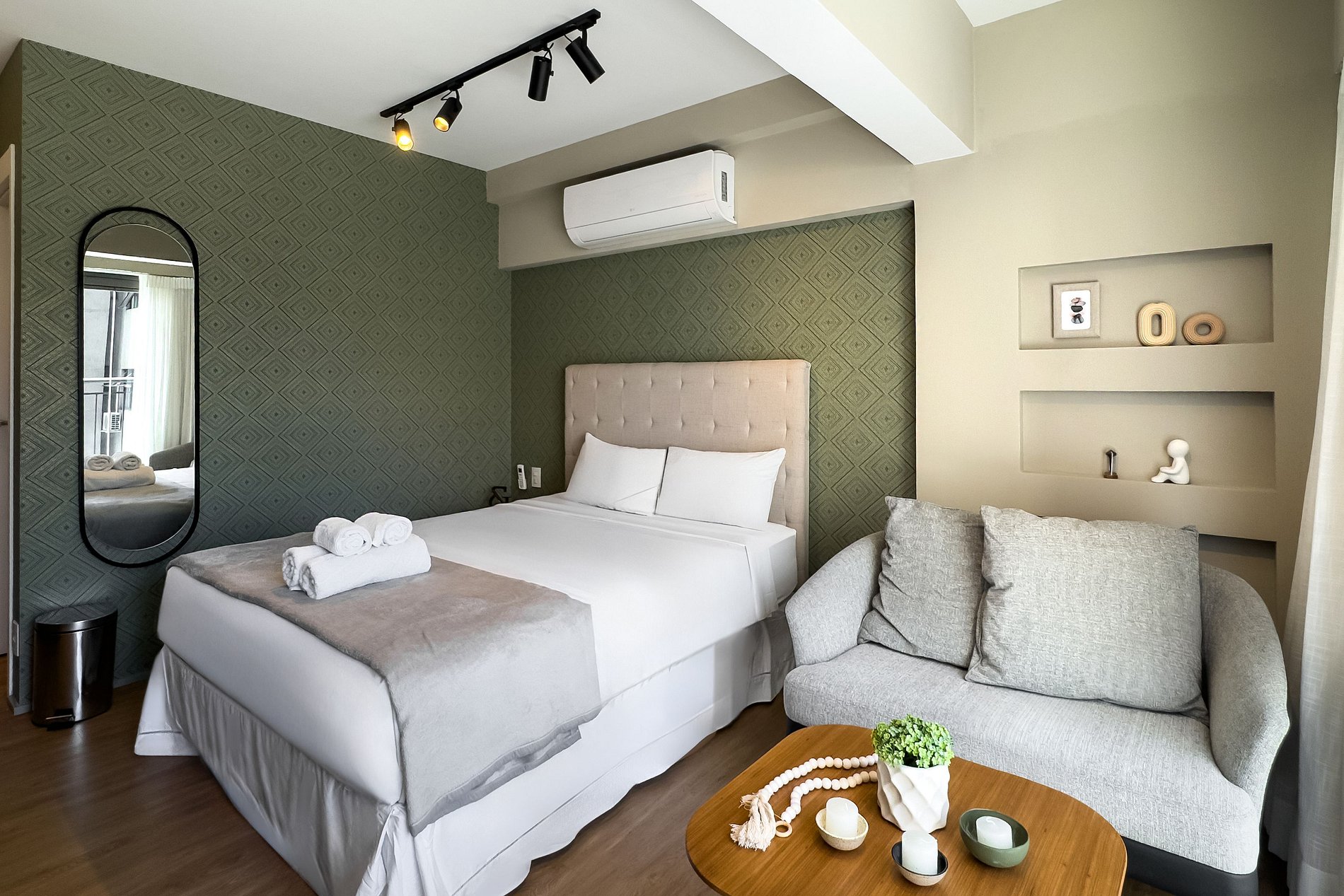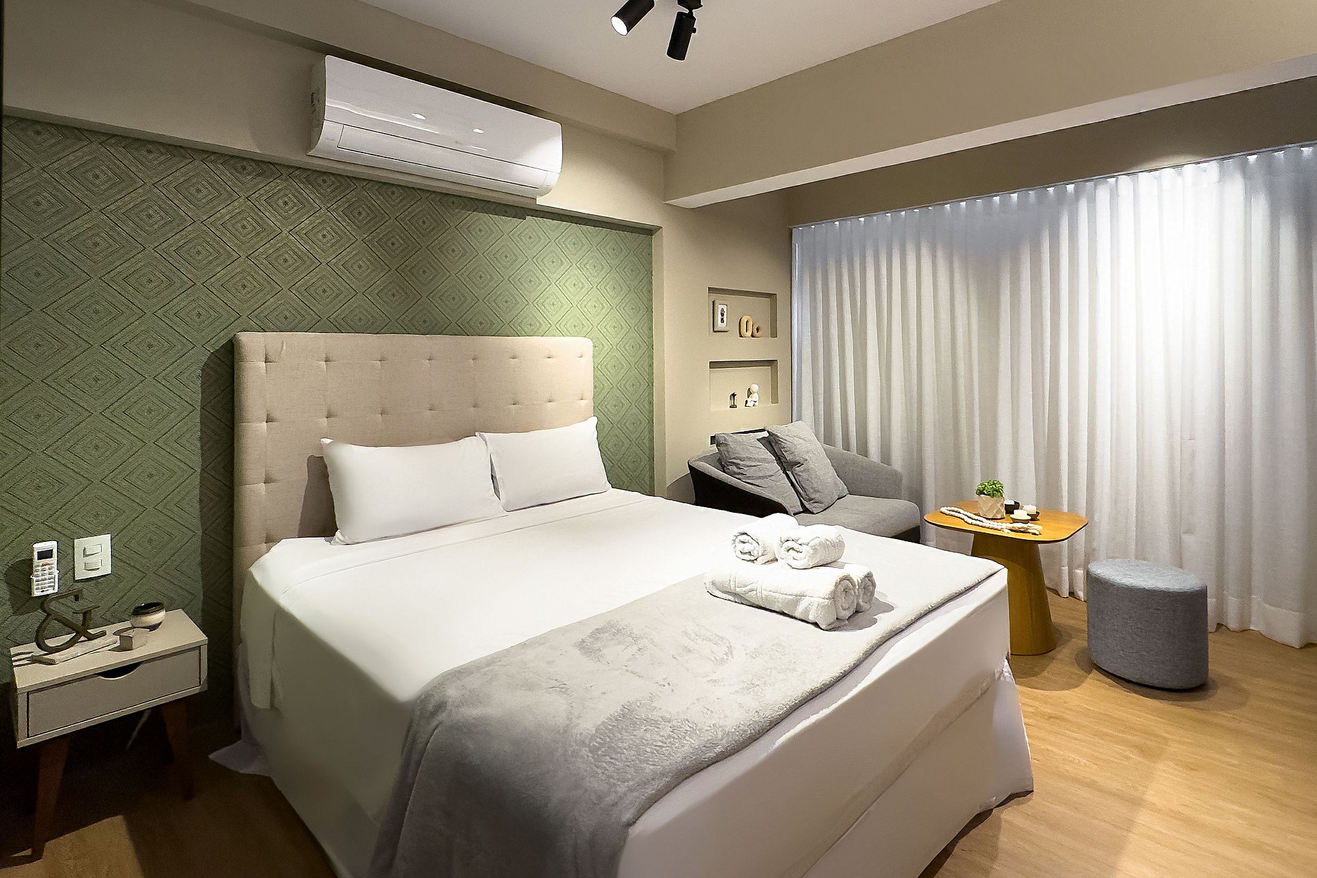 O apartamento possui 1 cama de casal (1,85x1,98). Cozinha completa com geladeira, freezer, micro-ondas, fogão de indução (2 bocas), taças de vinho, cafeteira expresso , bancada para home office, guarda-roupa, TV e banheiro com ótimo chuveiro (água quente e fria). Será fornecido um jogo de enxoval (lençóis, travesseiros, fronhas , manta , toalhas de banho e rosto) por hóspede. Não há trocas durante a permanência.