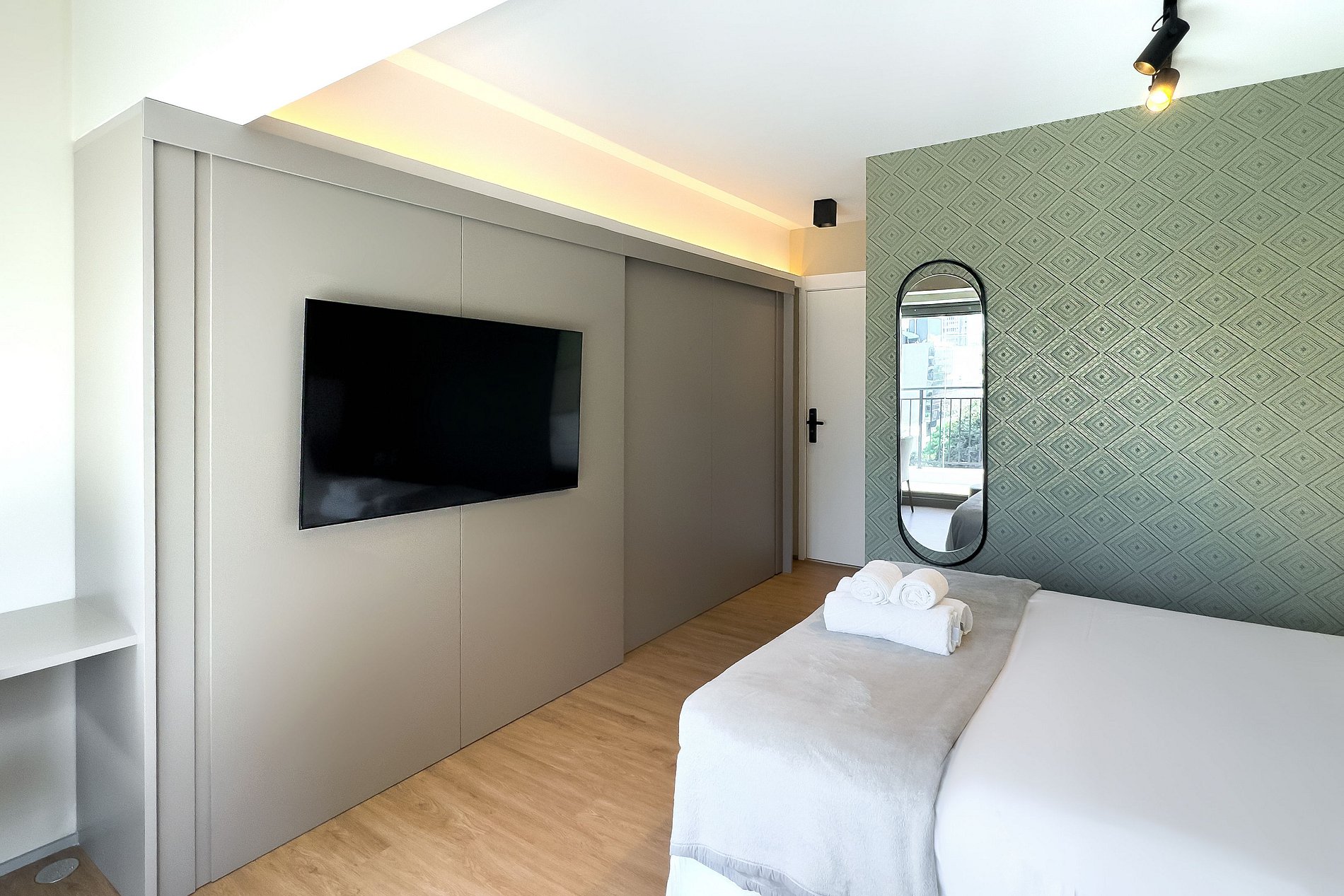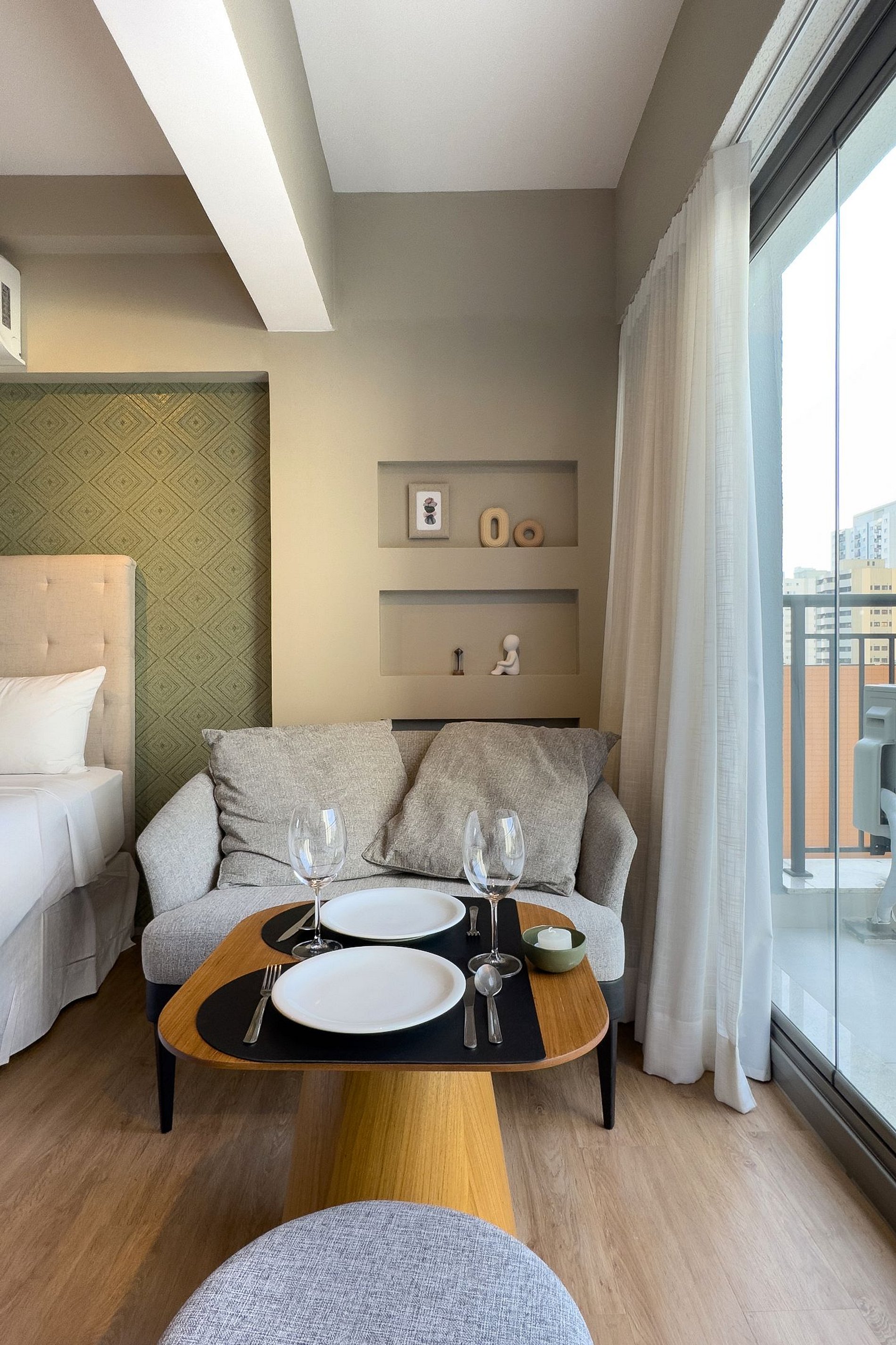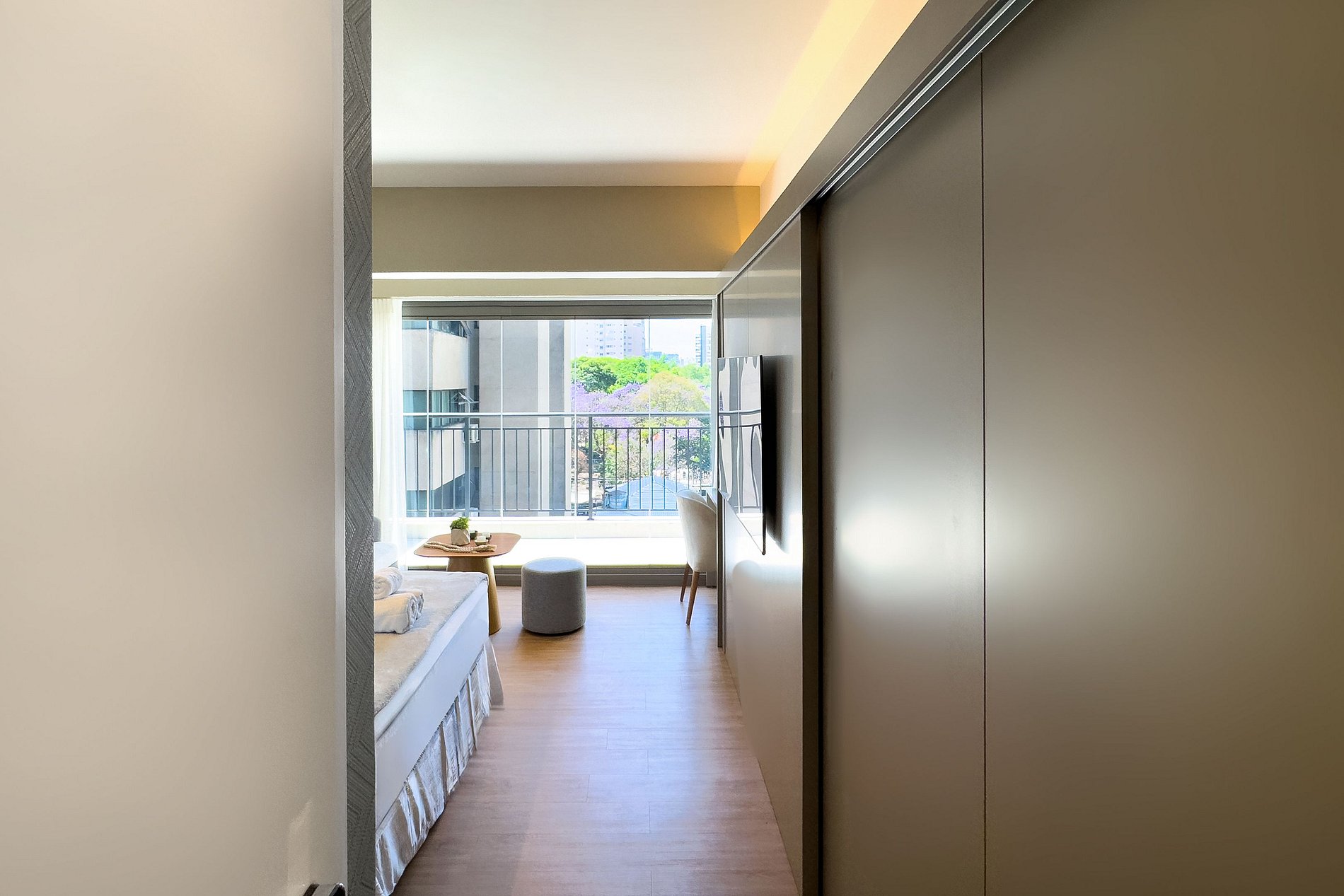 O apartamento possui 1 cama de casal (1,85x1,98). Cozinha completa com geladeira, freezer, micro-ondas, fogão de indução (2 bocas), taças de vinho, cafeteira expresso , bancada para home office, guarda-roupa, TV e banheiro com ótimo chuveiro (água quente e fria). Será fornecido um jogo de enxoval (lençóis, travesseiros, fronhas , manta , toalhas de banho e rosto) por hóspede. Não há trocas durante a permanência.
