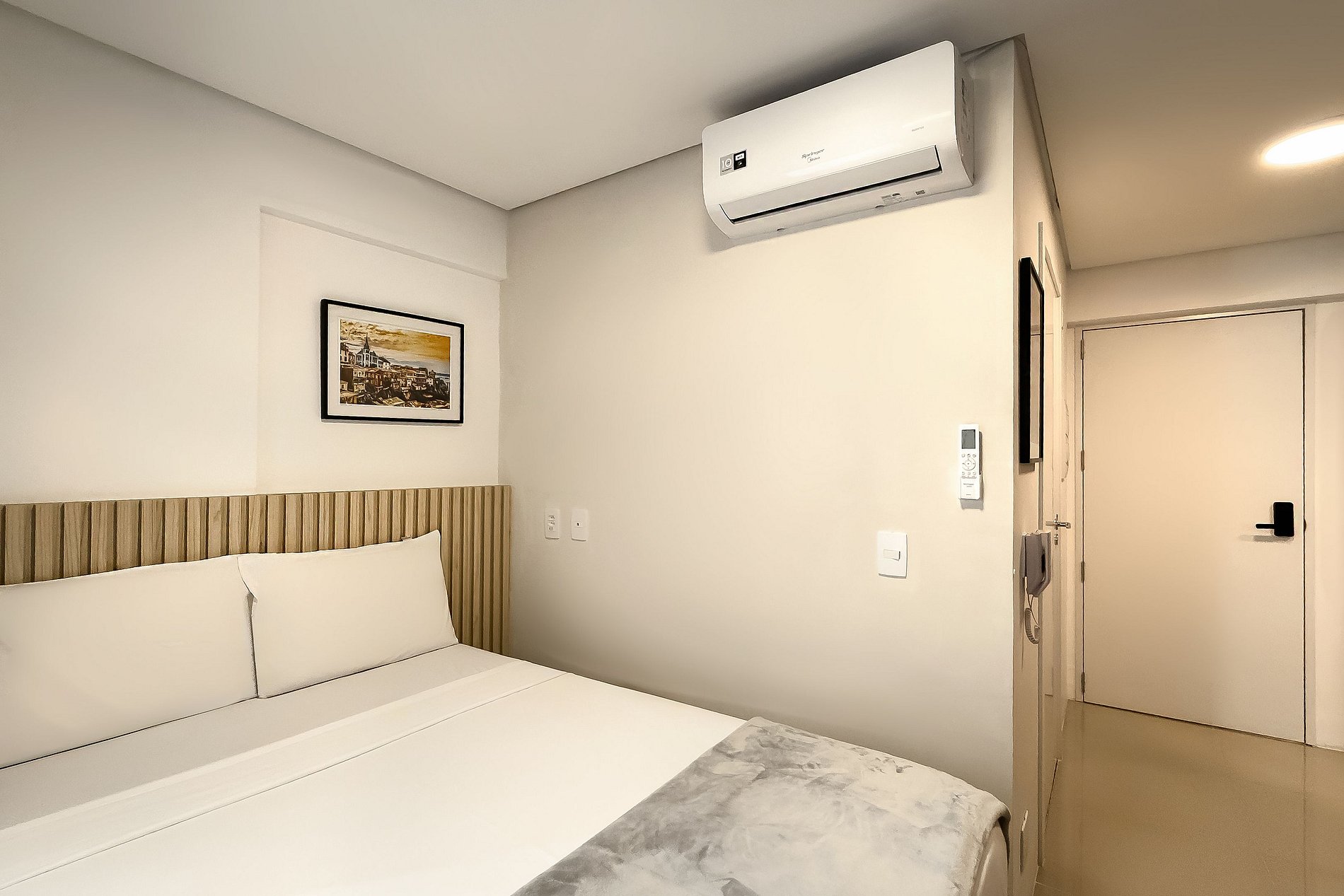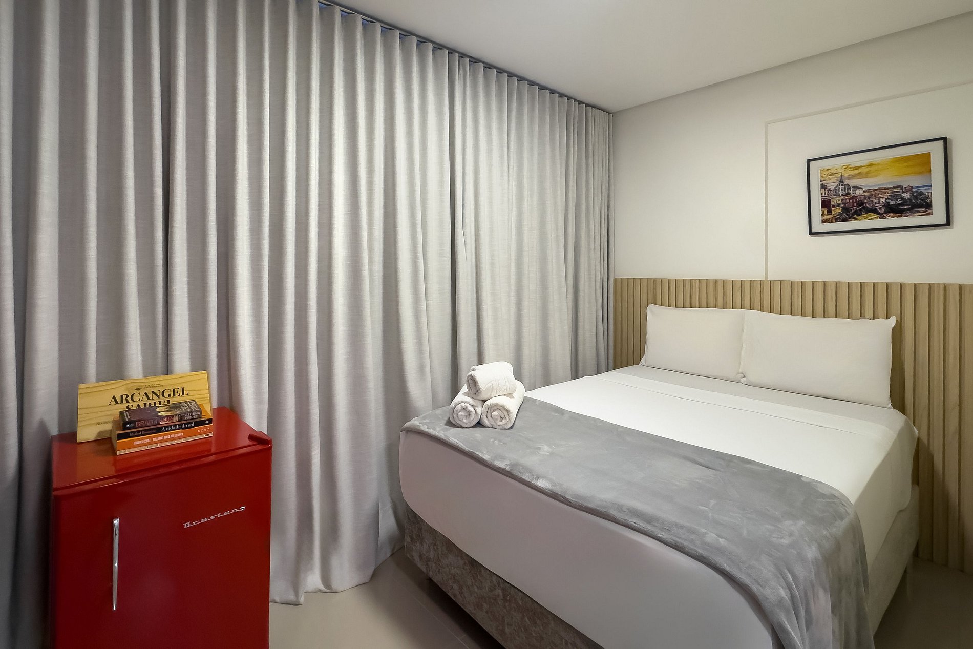 O apartamento possui 1 cama de casal (1,38x1,88) Cozinha completa com geladeira, freezer, micro-ondas, fogão de (2 bocas), misteira, bancada para home office, guarda-roupa, secador de cabelo, ferro de passar, TV e banheiro com ótimo chuveiro (água quente e fria). Será fornecido um jogo de enxoval (lençóis, travesseiros, fronhas e toalhas de banho e rosto) por hóspede. Não há trocas durante a permanência.