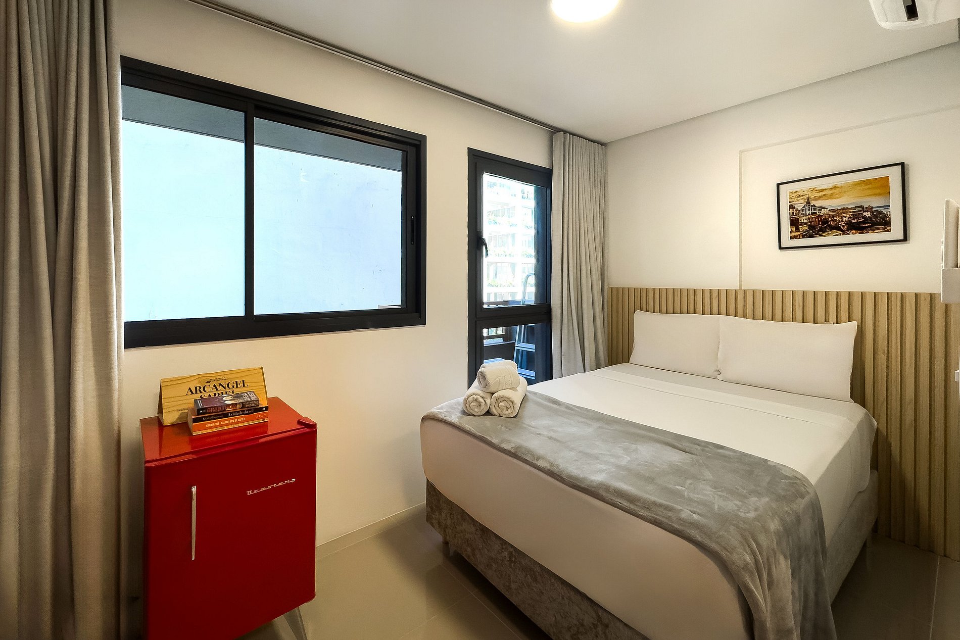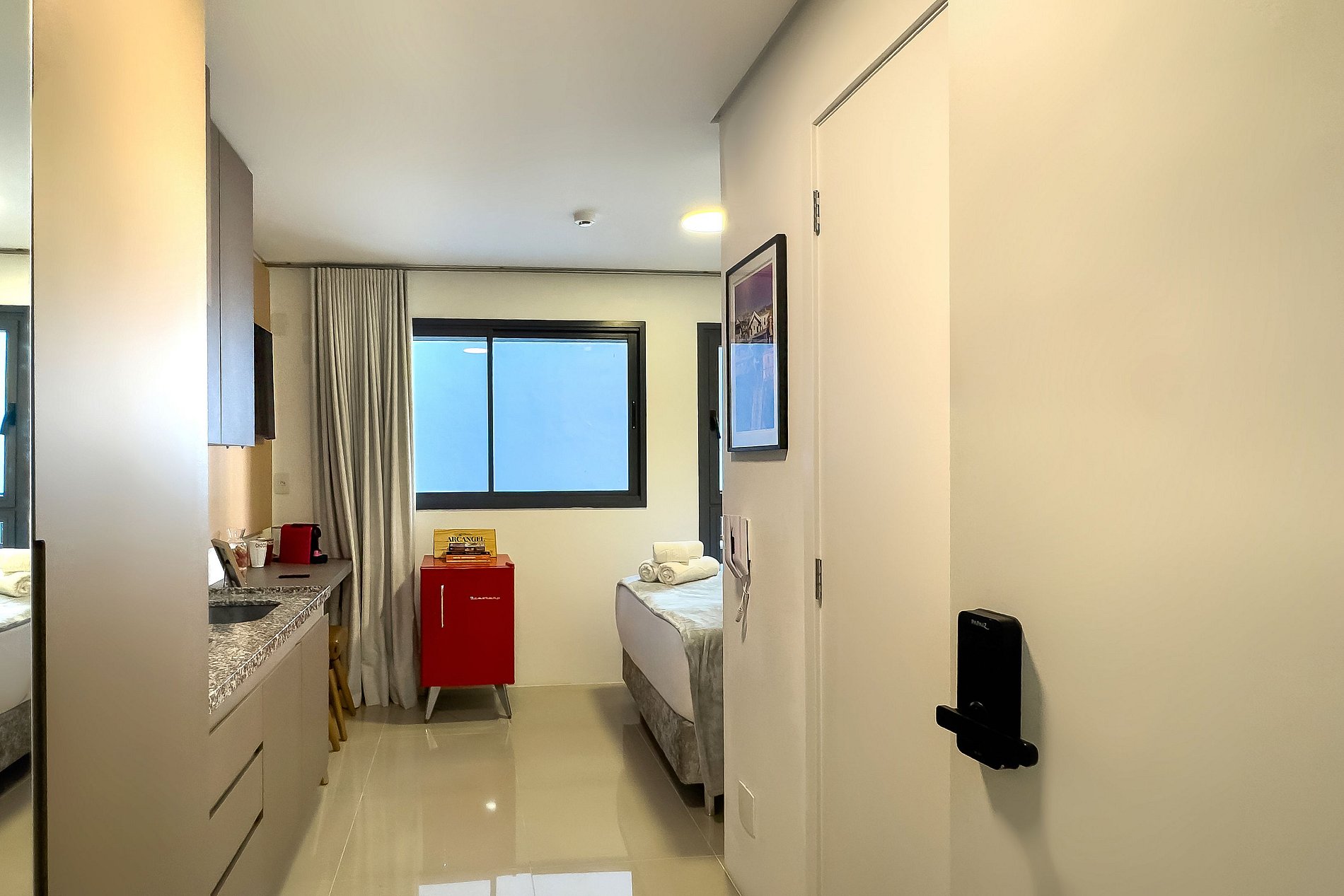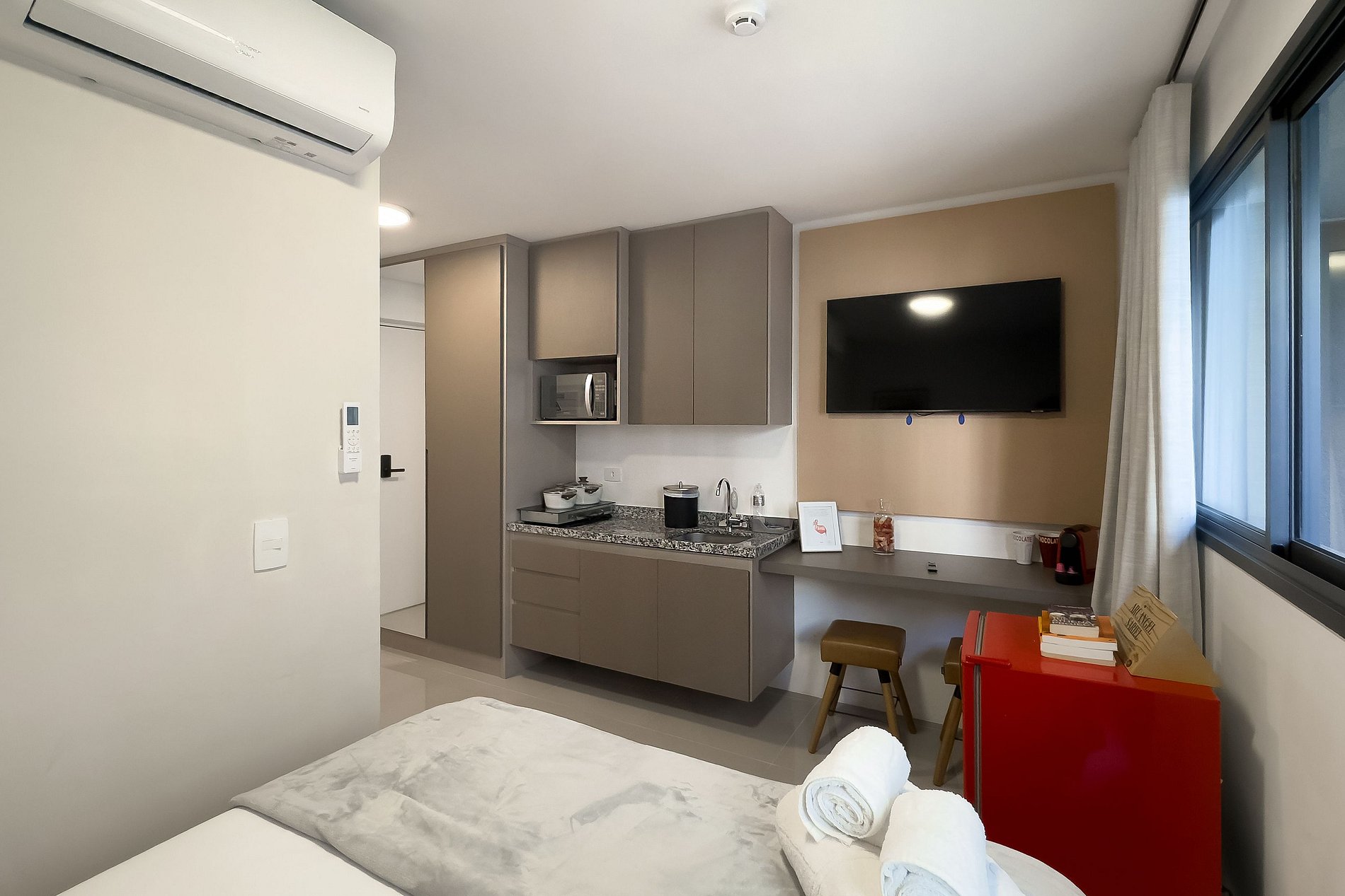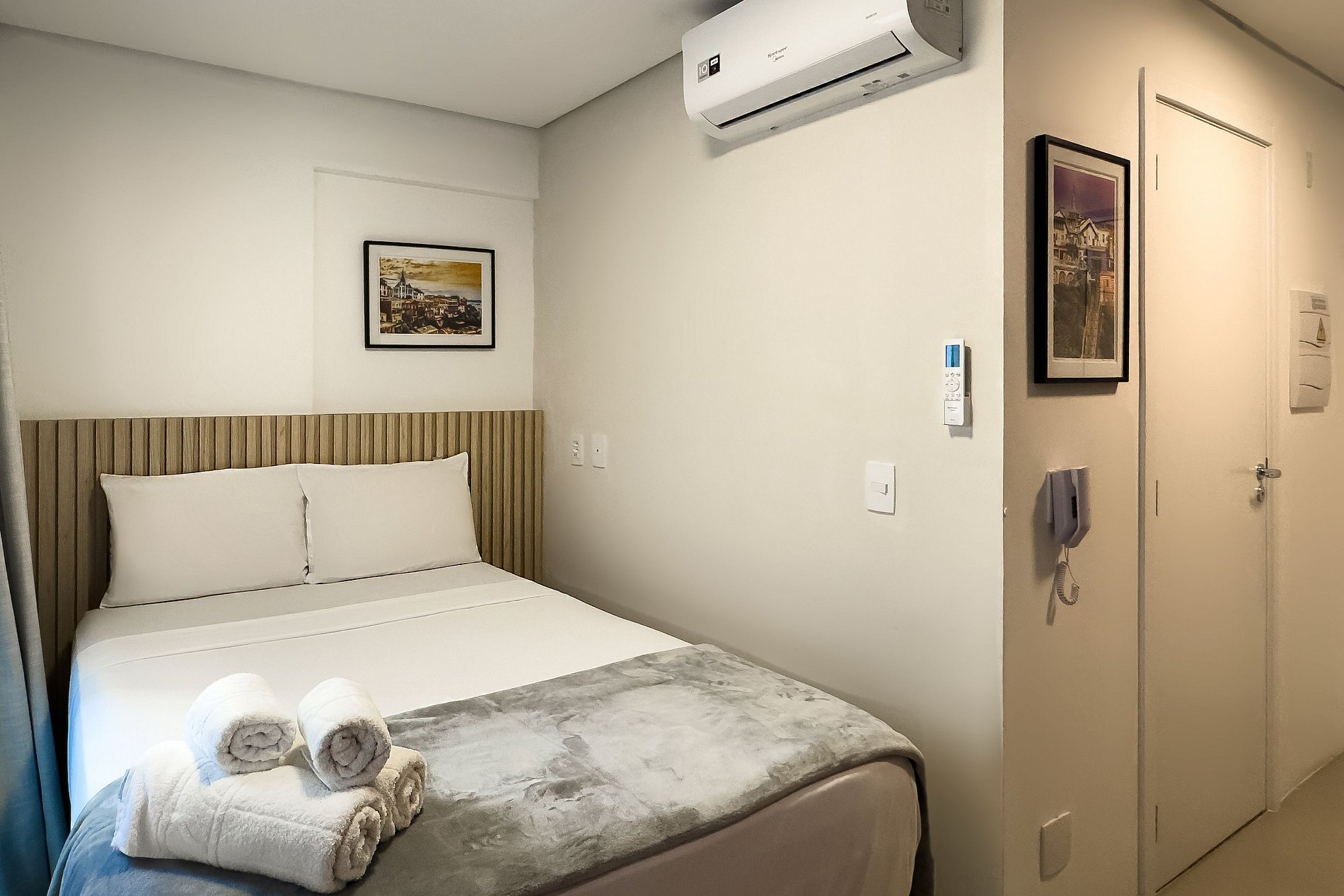 O apartamento possui 1 cama de casal (1,38x1,88) Cozinha completa com geladeira, freezer, micro-ondas, fogão de (2 bocas), misteira, bancada para home office, guarda-roupa, secador de cabelo, ferro de passar, TV e banheiro com ótimo chuveiro (água quente e fria). Será fornecido um jogo de enxoval (lençóis, travesseiros, fronhas e toalhas de banho e rosto) por hóspede. Não há trocas durante a permanência.