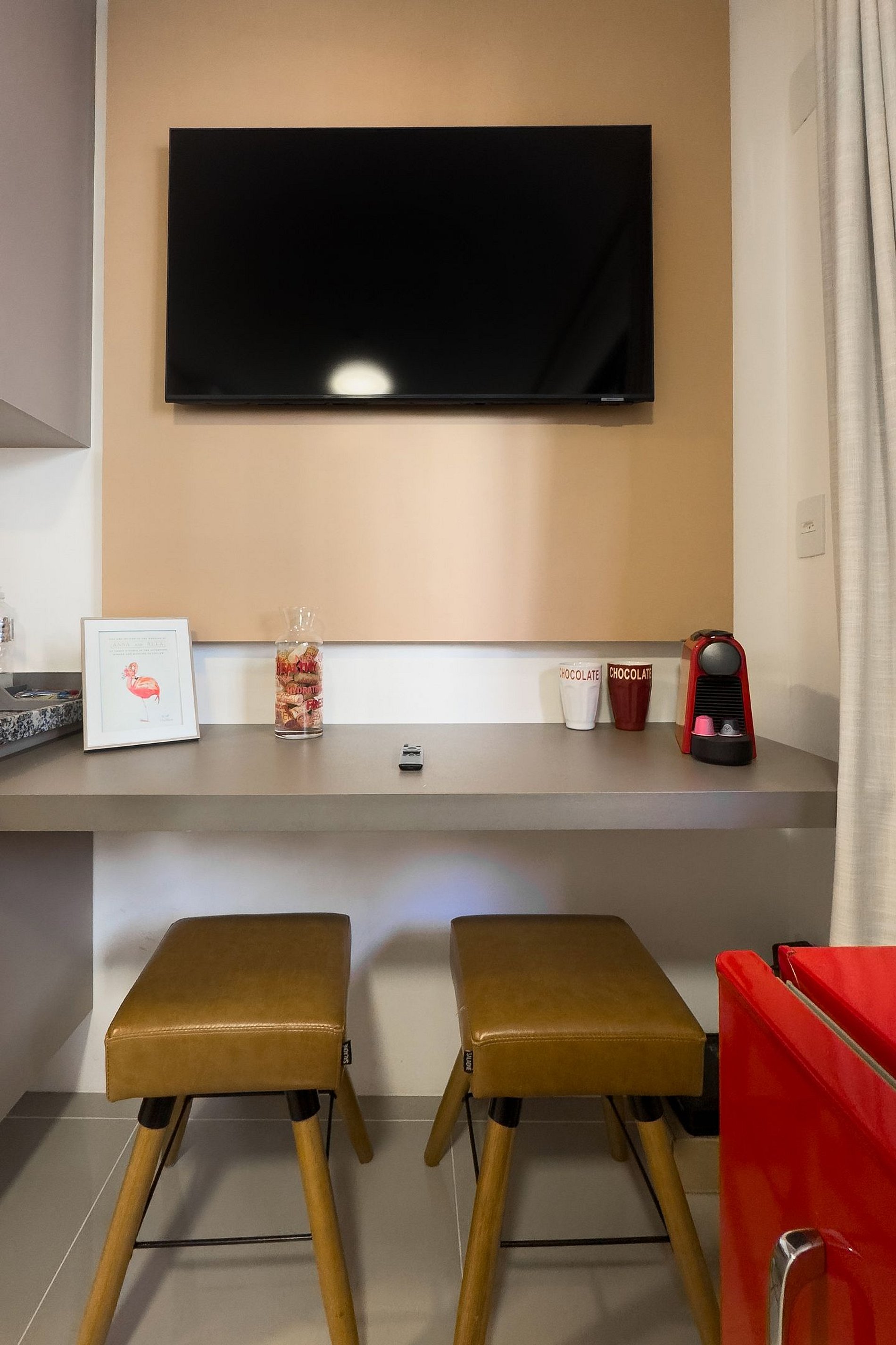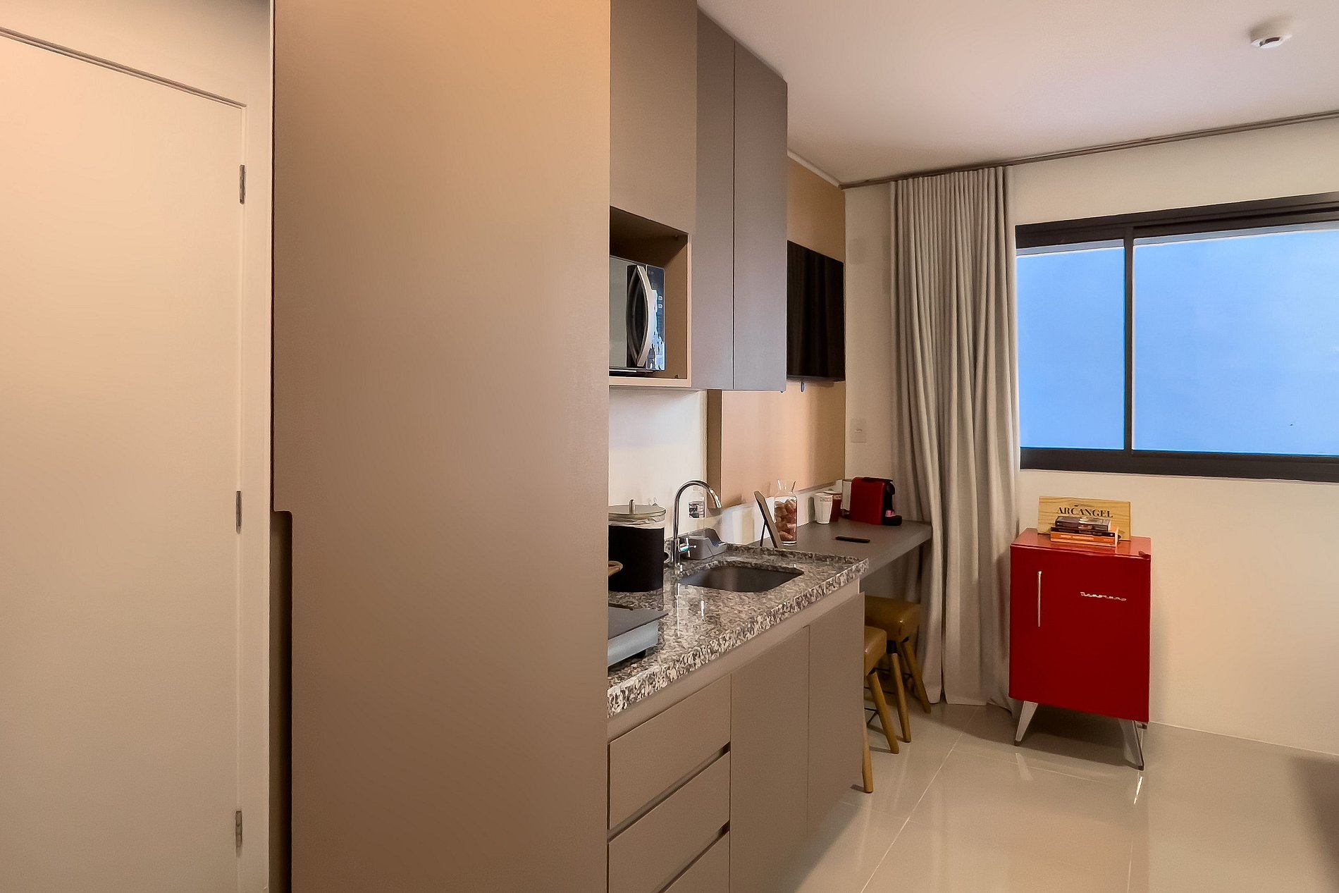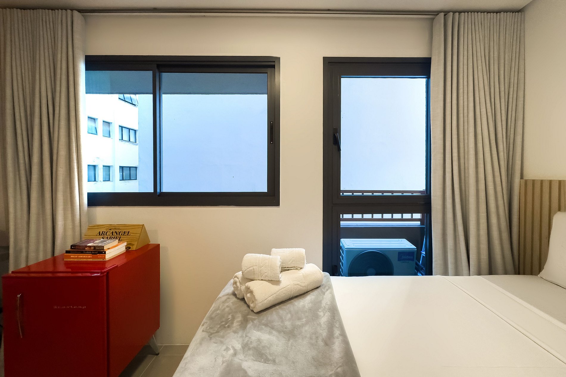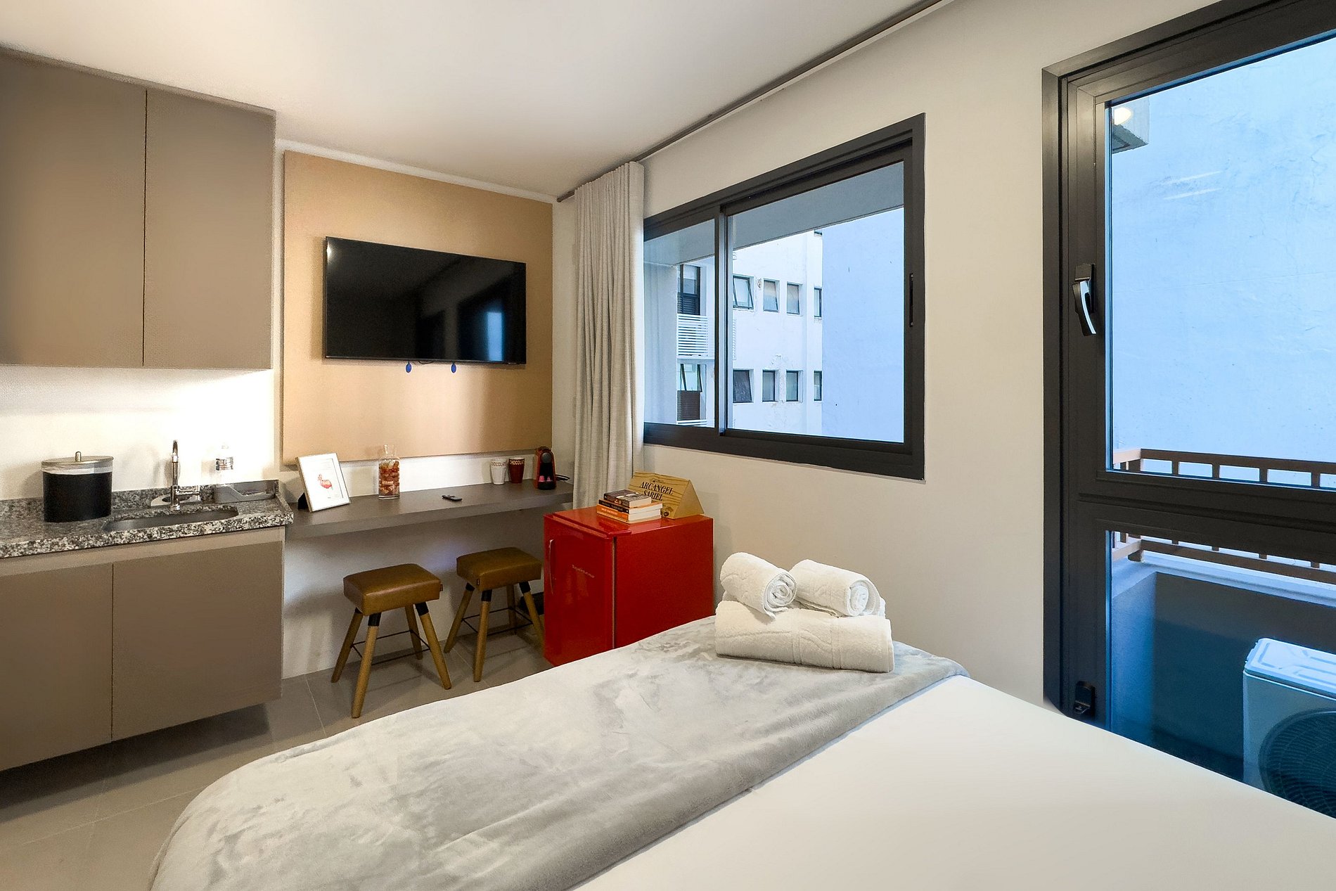 O apartamento possui 1 cama de casal (1,38x1,88) Cozinha completa com geladeira, freezer, micro-ondas, fogão de (2 bocas), misteira, bancada para home office, guarda-roupa, secador de cabelo, ferro de passar, TV e banheiro com ótimo chuveiro (água quente e fria). Será fornecido um jogo de enxoval (lençóis, travesseiros, fronhas e toalhas de banho e rosto) por hóspede. Não há trocas durante a permanência.