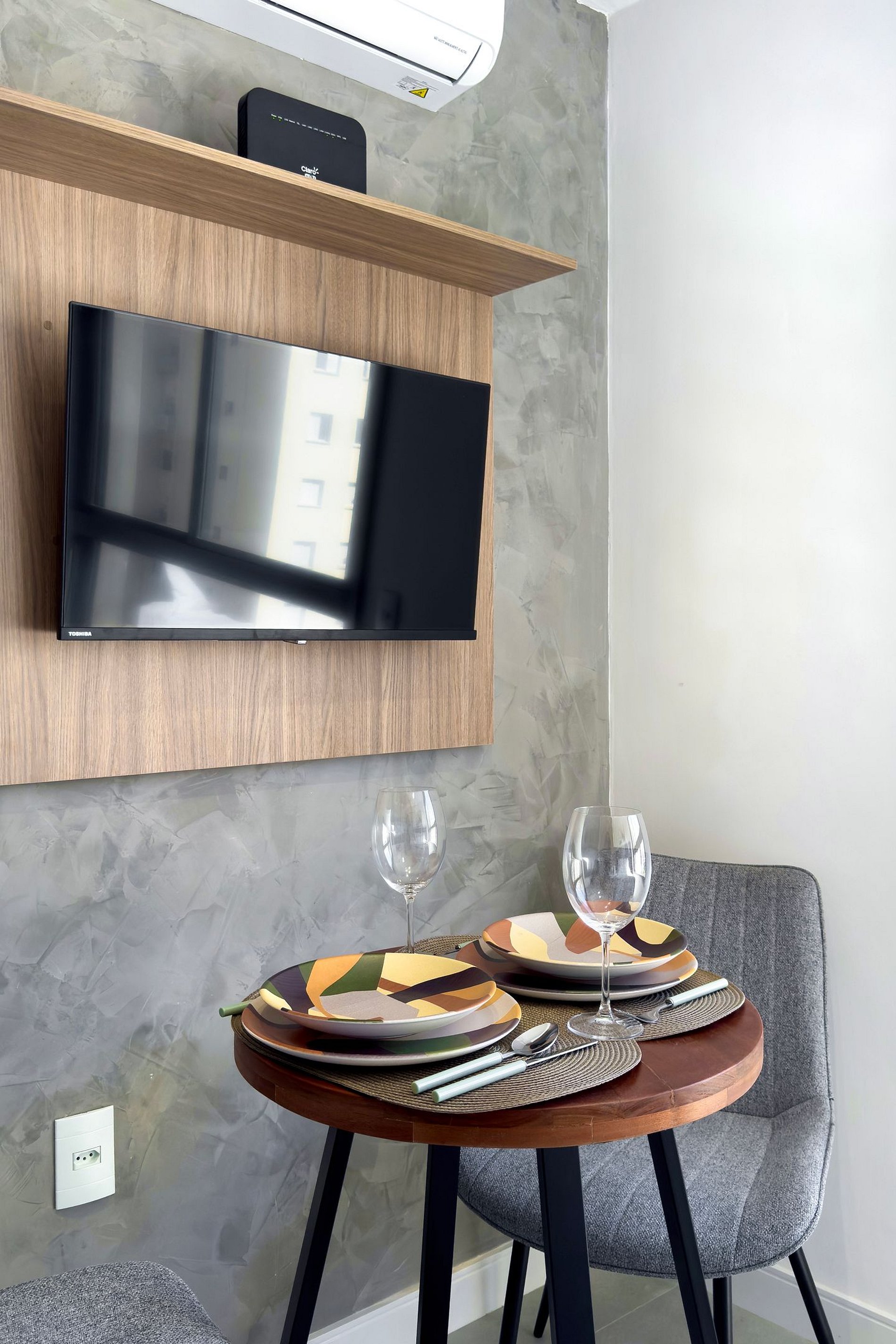 O apartamento possui 1 cama de casal (1,38x1,88), e ar-condicionado. Cozinha completa com frigobar , freezer, micro-ondas, fogão de indução, jogo de talheres, cafeteira nespresso para home office, Misteira , filtro de agua potável, Liquidificador guarda-roupa, secador de cabelo, ferro de passar ,mesa, 2 Cadeira Interna, Cortina Black out TV com 2 banquetas , banheiro com ótimo chuveiro (água quente e fria). Será fornecido um jogo de enxoval (lençóis, travesseiros, fronhas e toalhas de banho) por hóspede. Outras observações Ao redor do endereço R. Iperoig você encontrará uma variedade de opções para tornar sua estadia cada vez mais agradável;