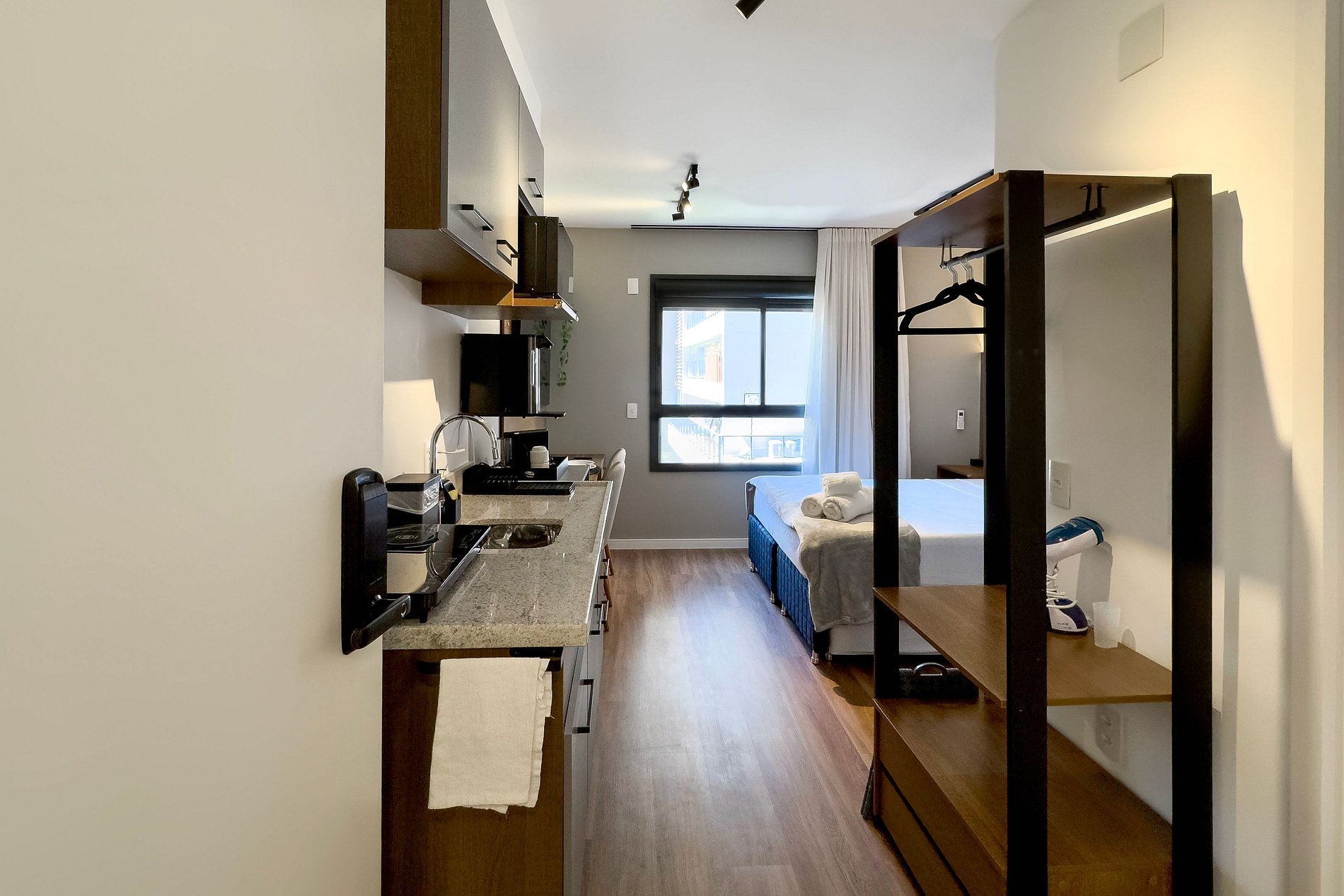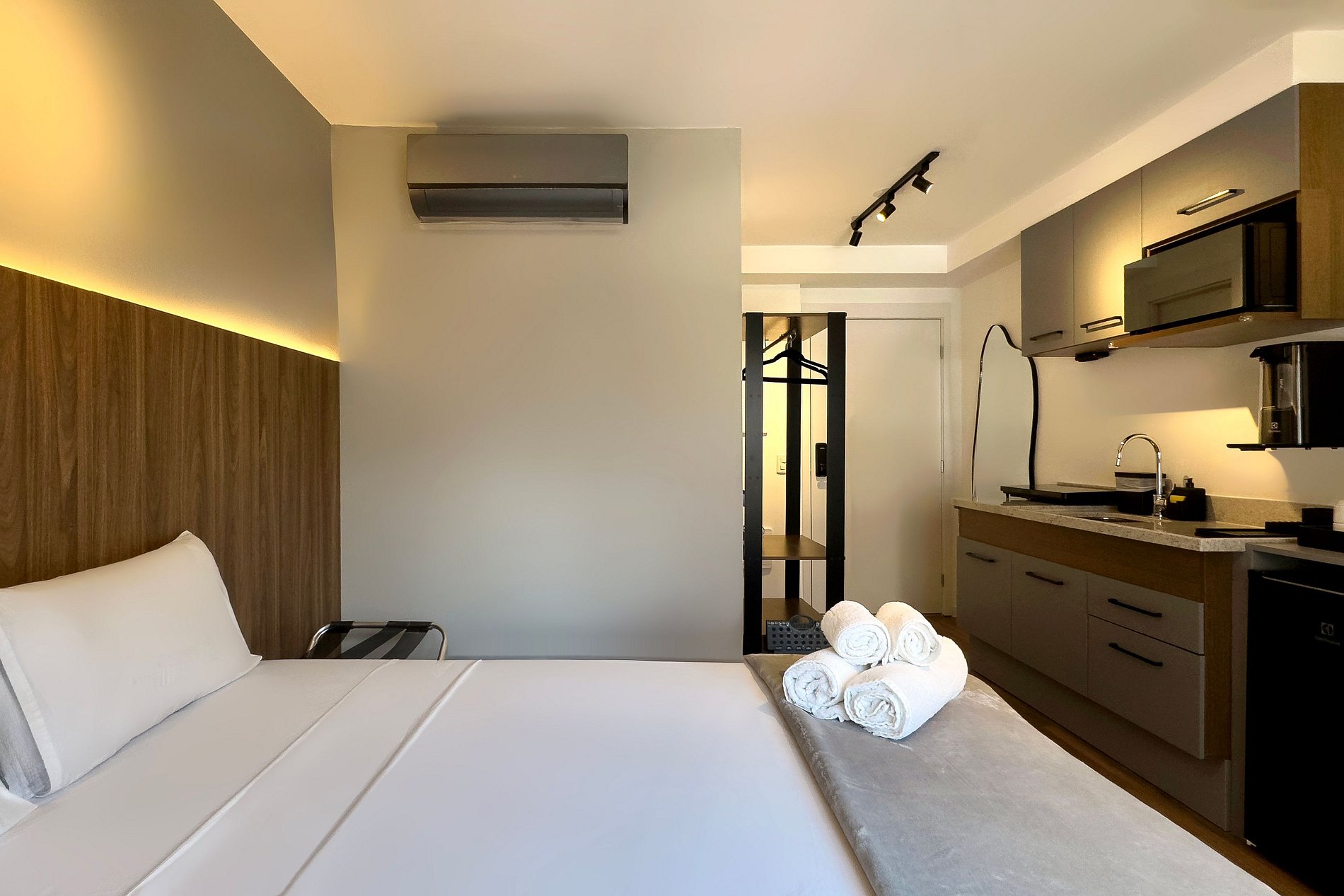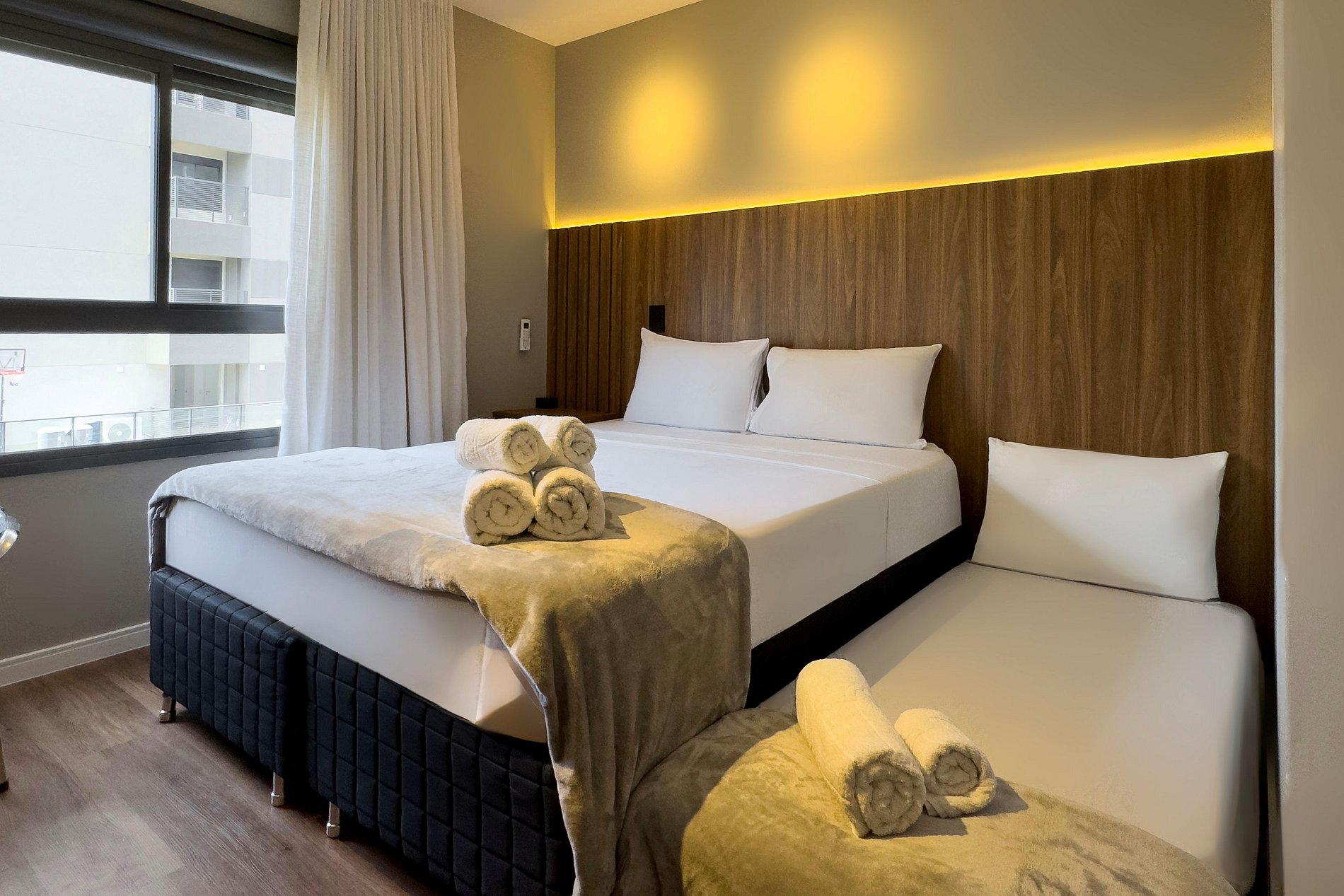 O apartamento possui 1 cama de casal Queen (1,58x1,98) e uma bi cama de solteiro alem ar-condicionado. Cozinha completa com frigobar , freezer, micro-ondas, fogão de indução, jogo de talheres, cafeteira nespresso para home office, sanduicheira , filtro de agua potável, Airfrier , guarda-roupa, secador de cabelo, ferro de passar , mesa, 2 Cadeiras , Cortina Black out TV , banheiro com ótimo chuveiro (água quente e fria).O apartamento é automatizado com Alexa para maior conforto. Será fornecido um jogo de enxoval (lençóis, travesseiros, fronhas e toalhas de banho) por hóspede. Outras observações Ao redor do endereço R. Iperoig você encontrará uma variedade de opções para tornar sua estadia cada vez mais agradável;
