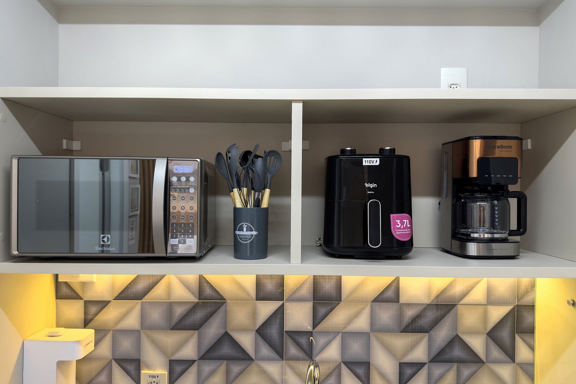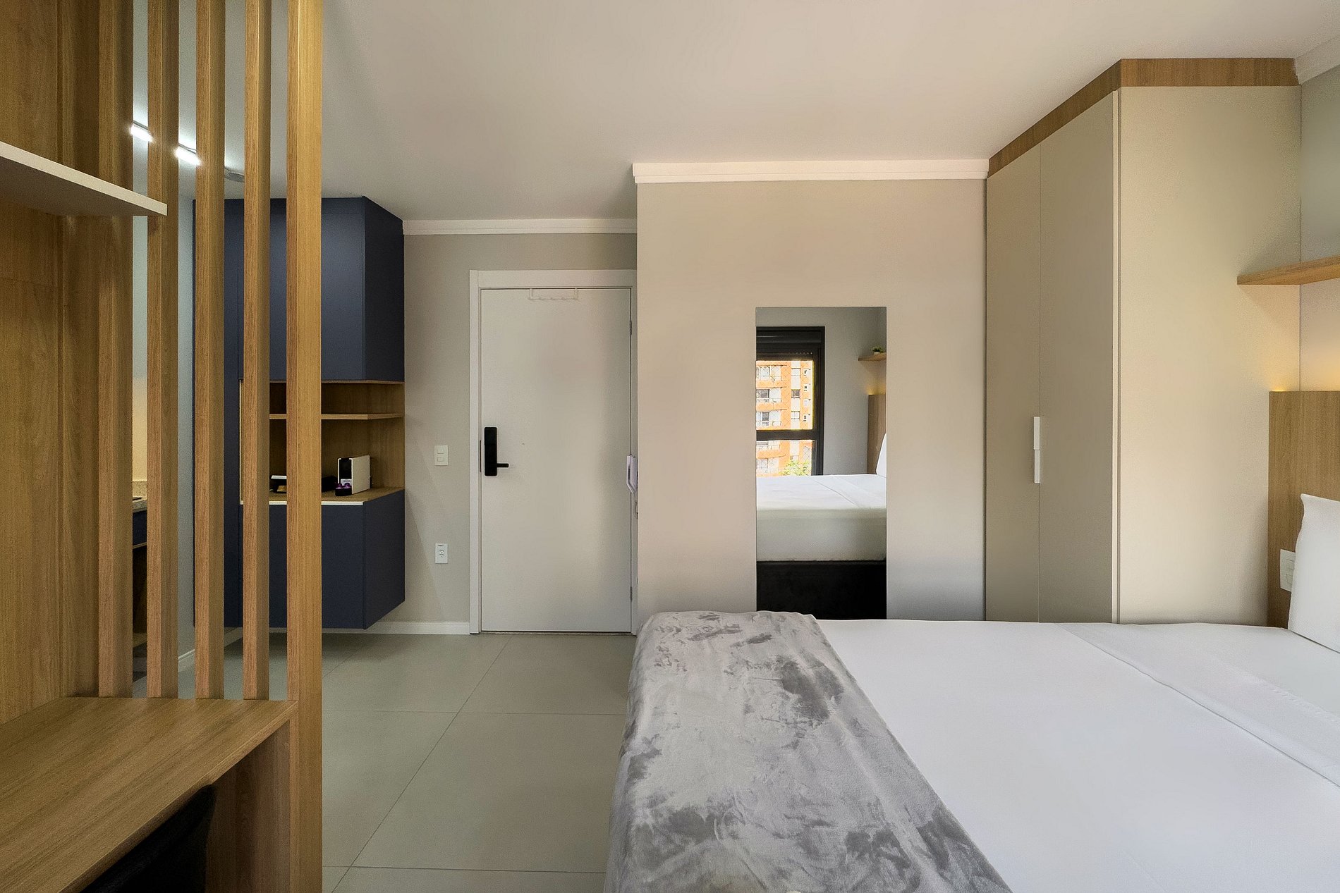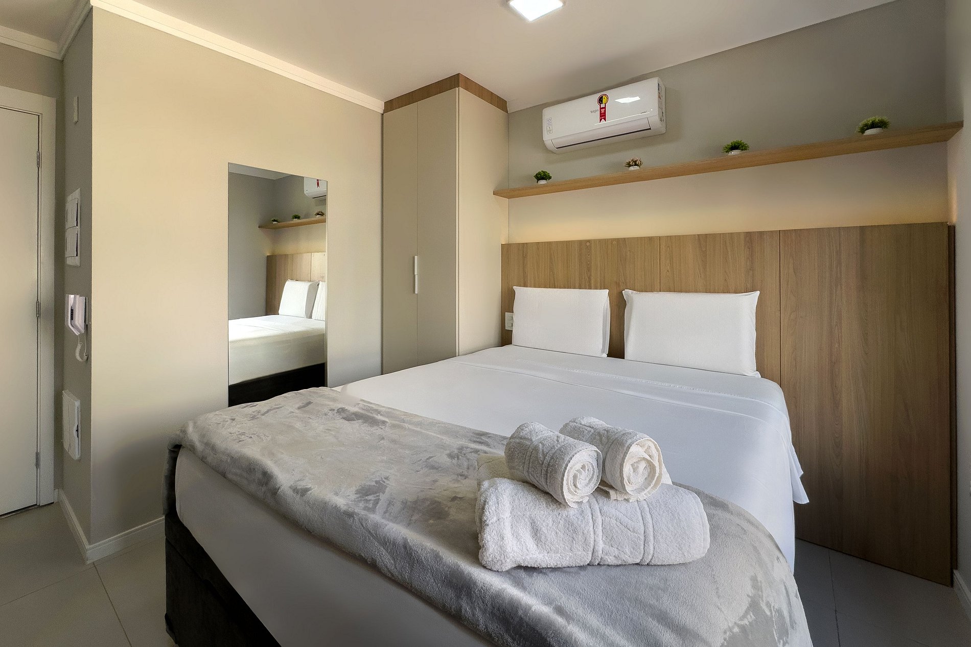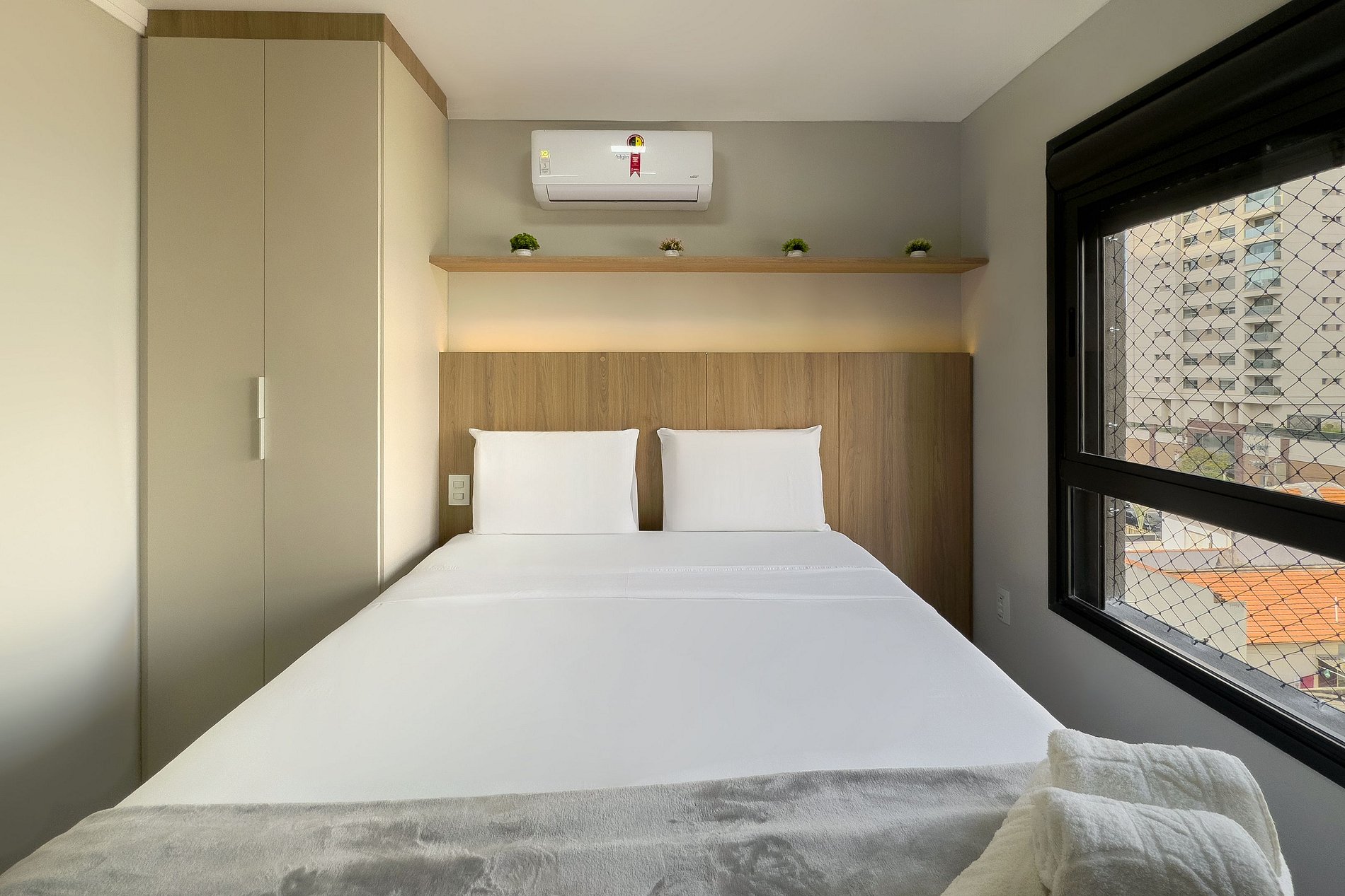 O apartamento possui 1 cama de casal Queen (1,58x1,98), e ar-condicionado. Cozinha completa com frigobar , freezer, micro-ondas, fogão de indução, jogo de talheres, cafeteira nespresso para home office, sanduicheira , filtro de agua potável, guarda-roupa, secador de cabelo, ferro de passar , Airfrier, mesa, 2 Cadeiras , Cortina Black out TV , banheiro com ótimo chuveiro (água quente e fria).O apartamento é automatizado com Alexa para maior conforto. Será fornecido um jogo de enxoval (lençóis, travesseiros, fronhas e toalhas de banho) por hóspede. Outras observações Ao redor do endereço R. Iperoig você encontrará uma variedade de opções para tornar sua estadia cada vez mais agradável;