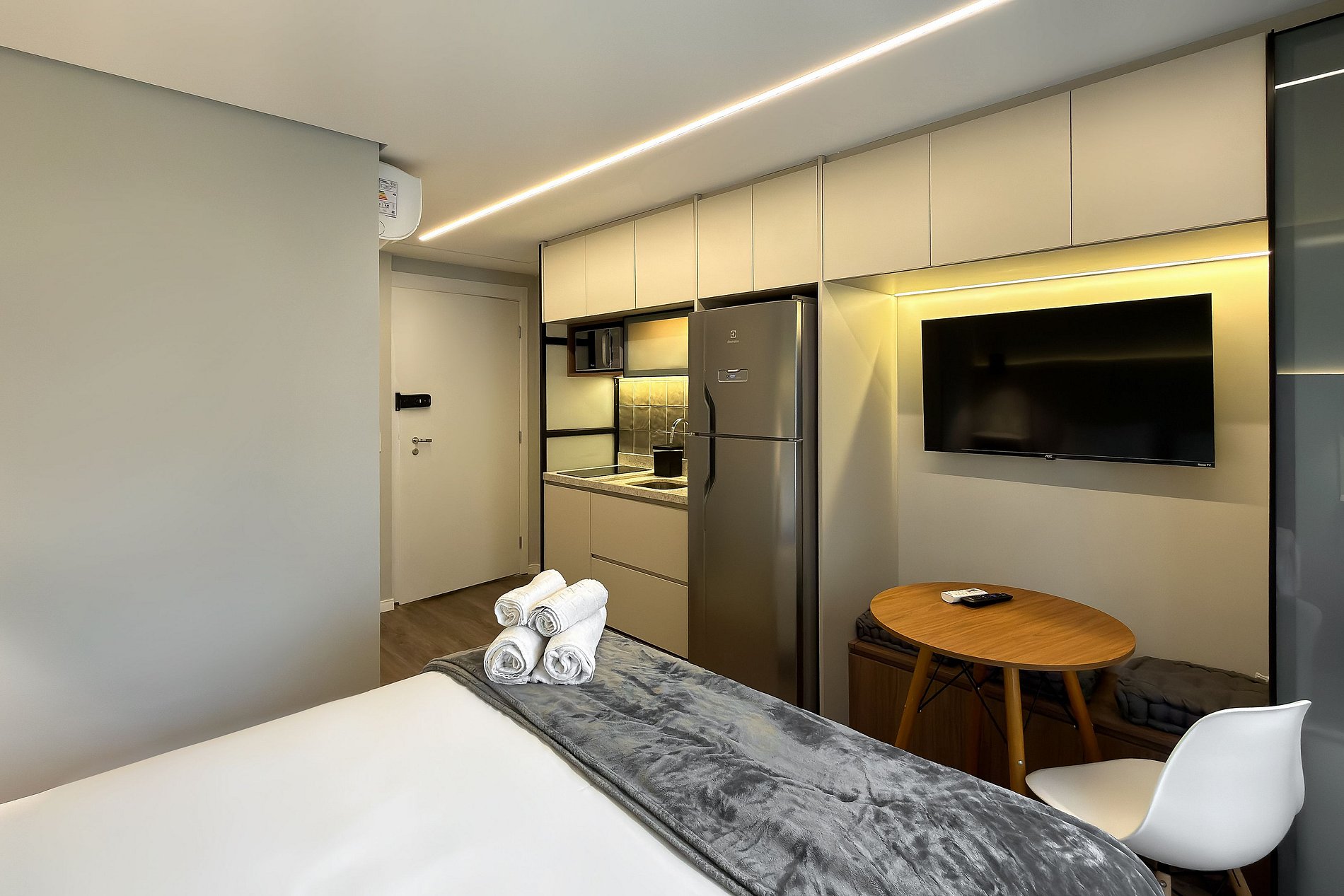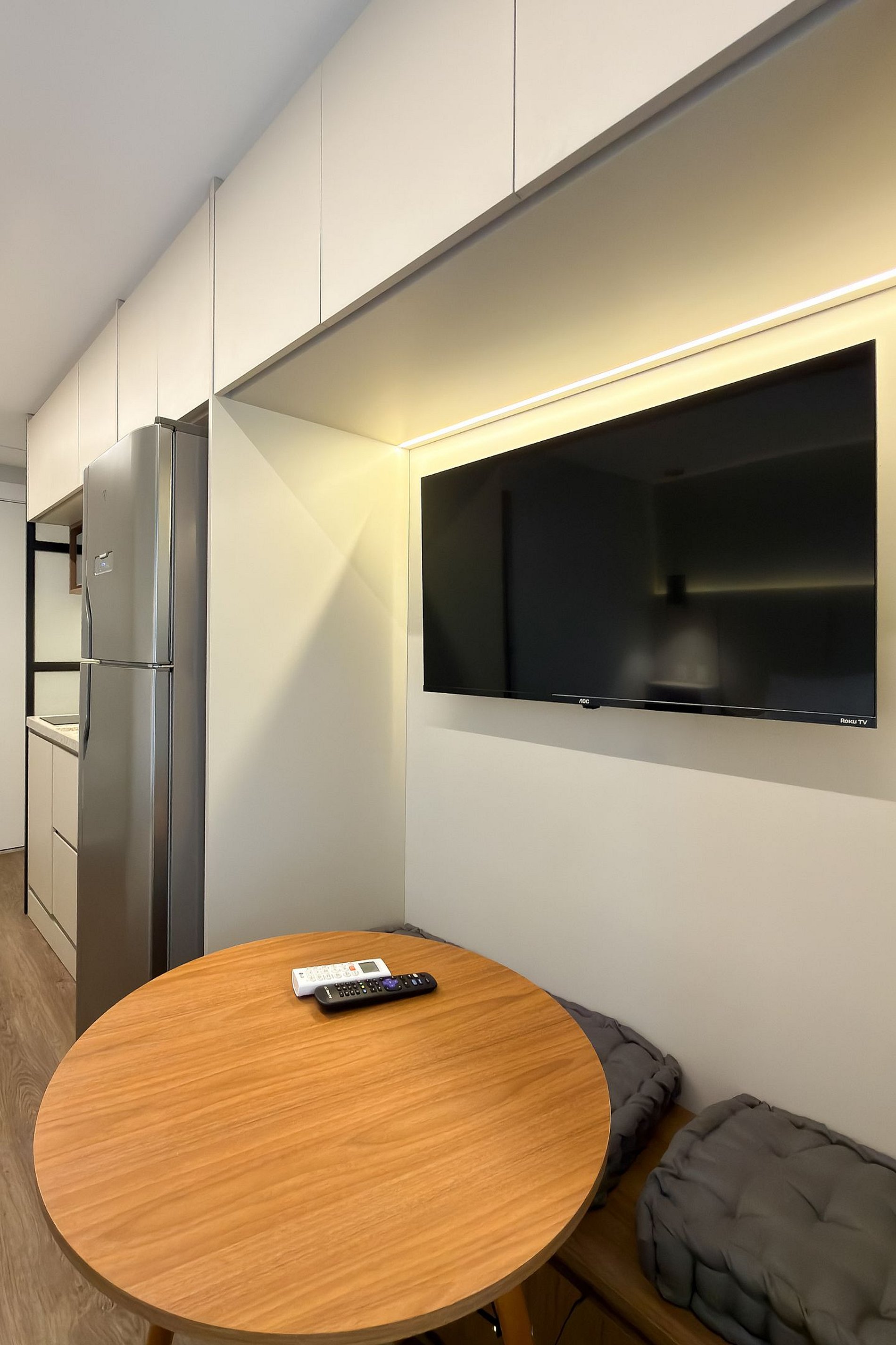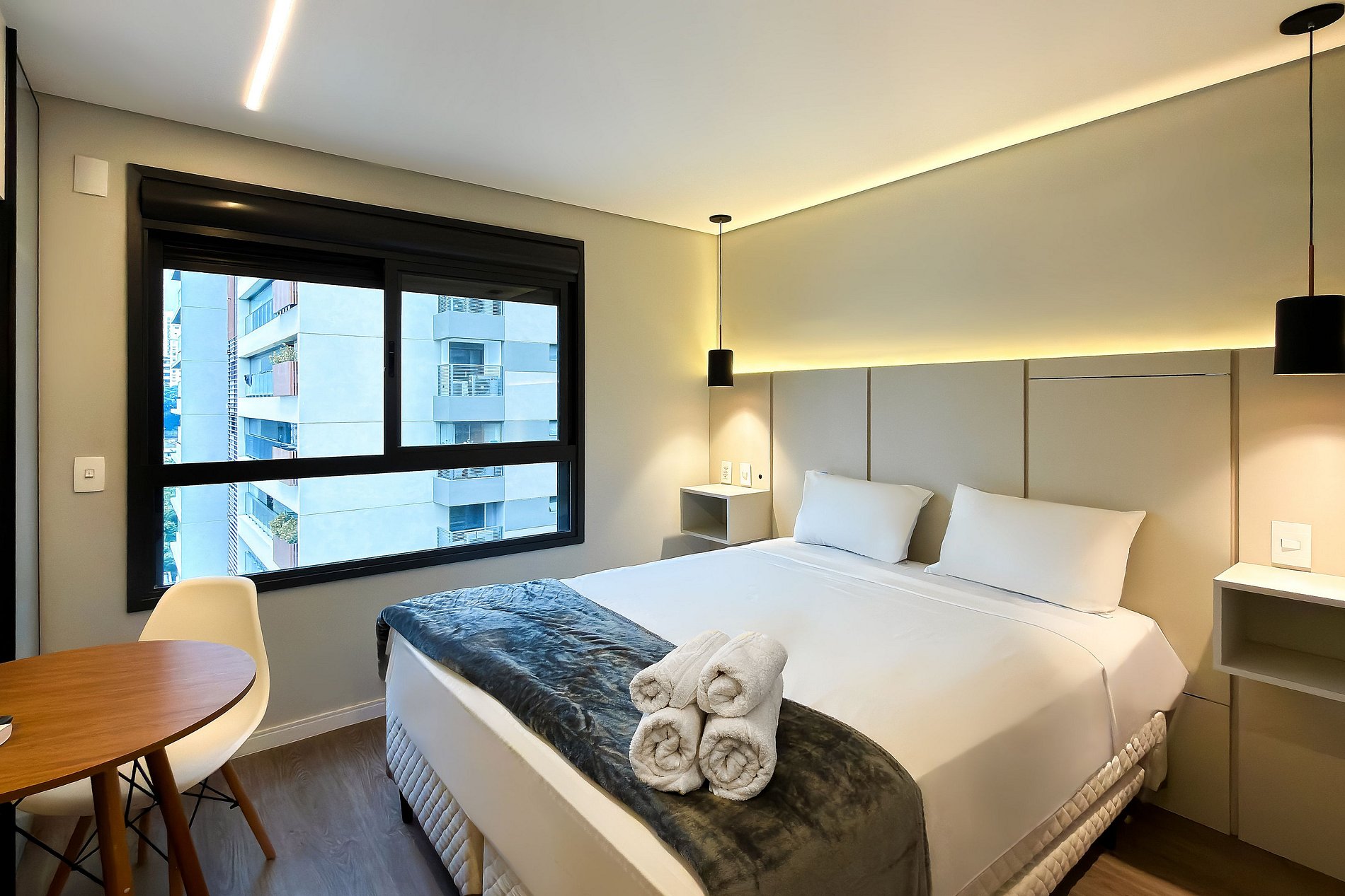 O apartamento possui 1 cama de casal Queen (1,58x1,98), e ar-condicionado. Cozinha completa com geladeira, freezer, micro-ondas, fogão de indução, jogo de talheres, cafeteira nespresso para home office, sanduicheira, guarda-roupa, secador de cabelo, ferro de passar , mesa, 2 Cadeiras , Cortina Black out TV , banheiro com ótimo chuveiro (água quente e fria). Será fornecido um jogo de enxoval (lençóis, travesseiros, fronhas e toalhas de banho) por hóspede. Outras observações Ao redor do endereço R. Iperoig você encontrará uma variedade de opções para tornar sua estadia cada vez mais agradável;