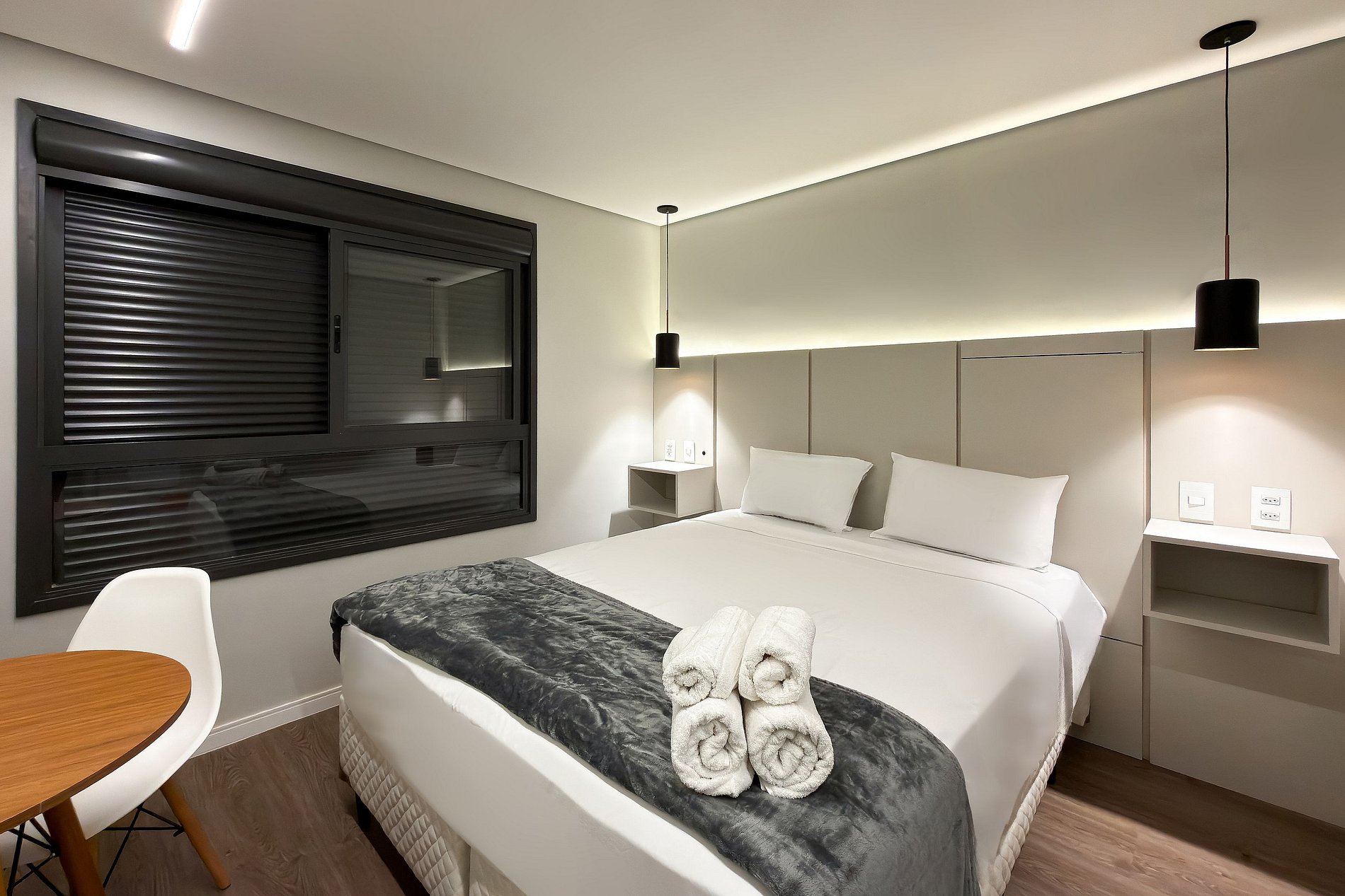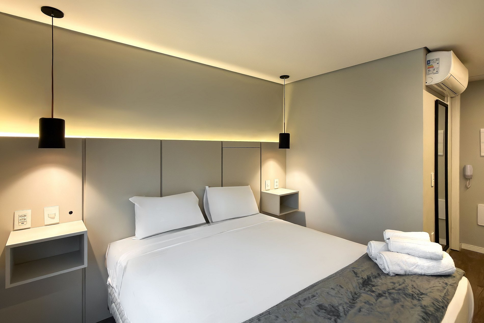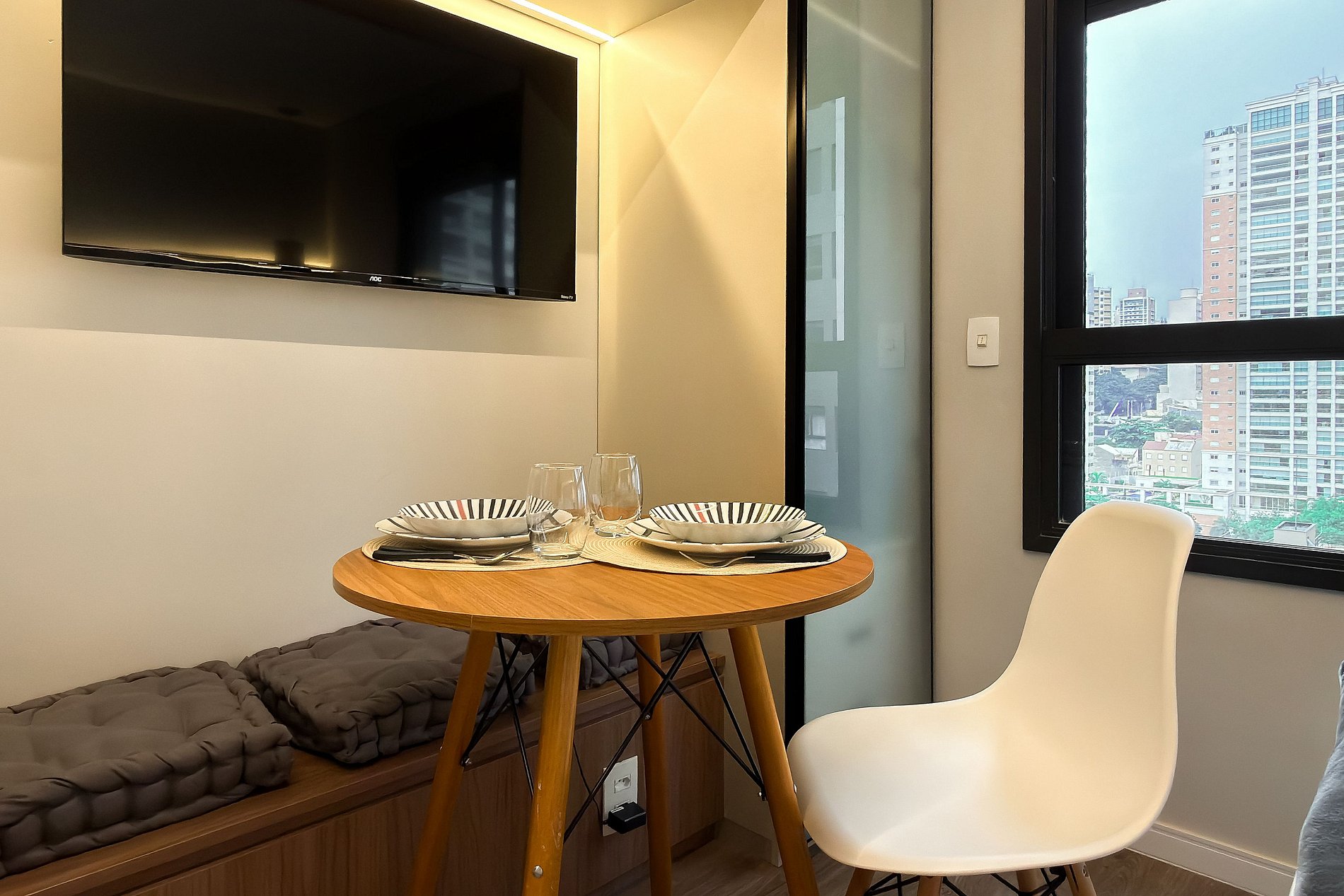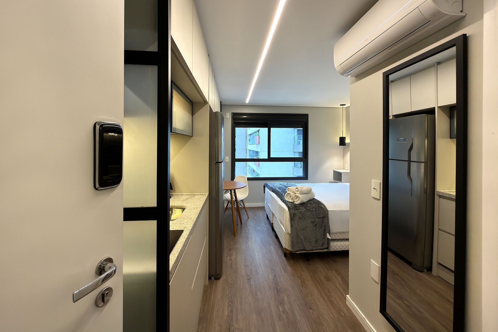 O apartamento possui 1 cama de casal Queen (1,58x1,98), e ar-condicionado. Cozinha completa com geladeira, freezer, micro-ondas, fogão de indução, jogo de talheres, cafeteira nespresso para home office, sanduicheira, guarda-roupa, secador de cabelo, ferro de passar , mesa, 2 Cadeiras , Cortina Black out TV , banheiro com ótimo chuveiro (água quente e fria). Será fornecido um jogo de enxoval (lençóis, travesseiros, fronhas e toalhas de banho) por hóspede. Outras observações Ao redor do endereço R. Iperoig você encontrará uma variedade de opções para tornar sua estadia cada vez mais agradável;
